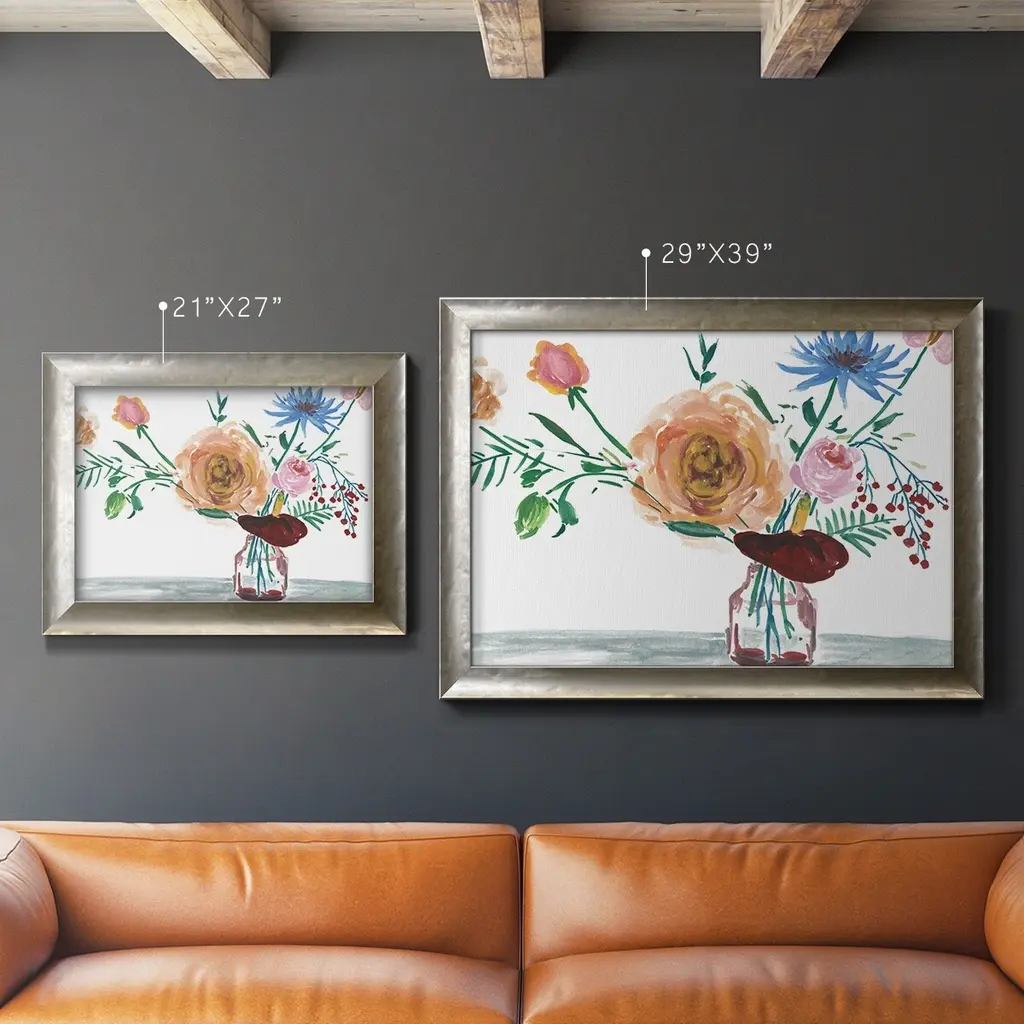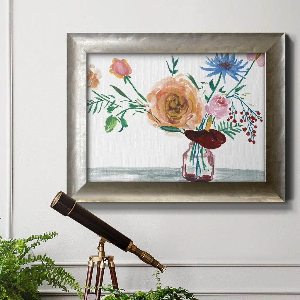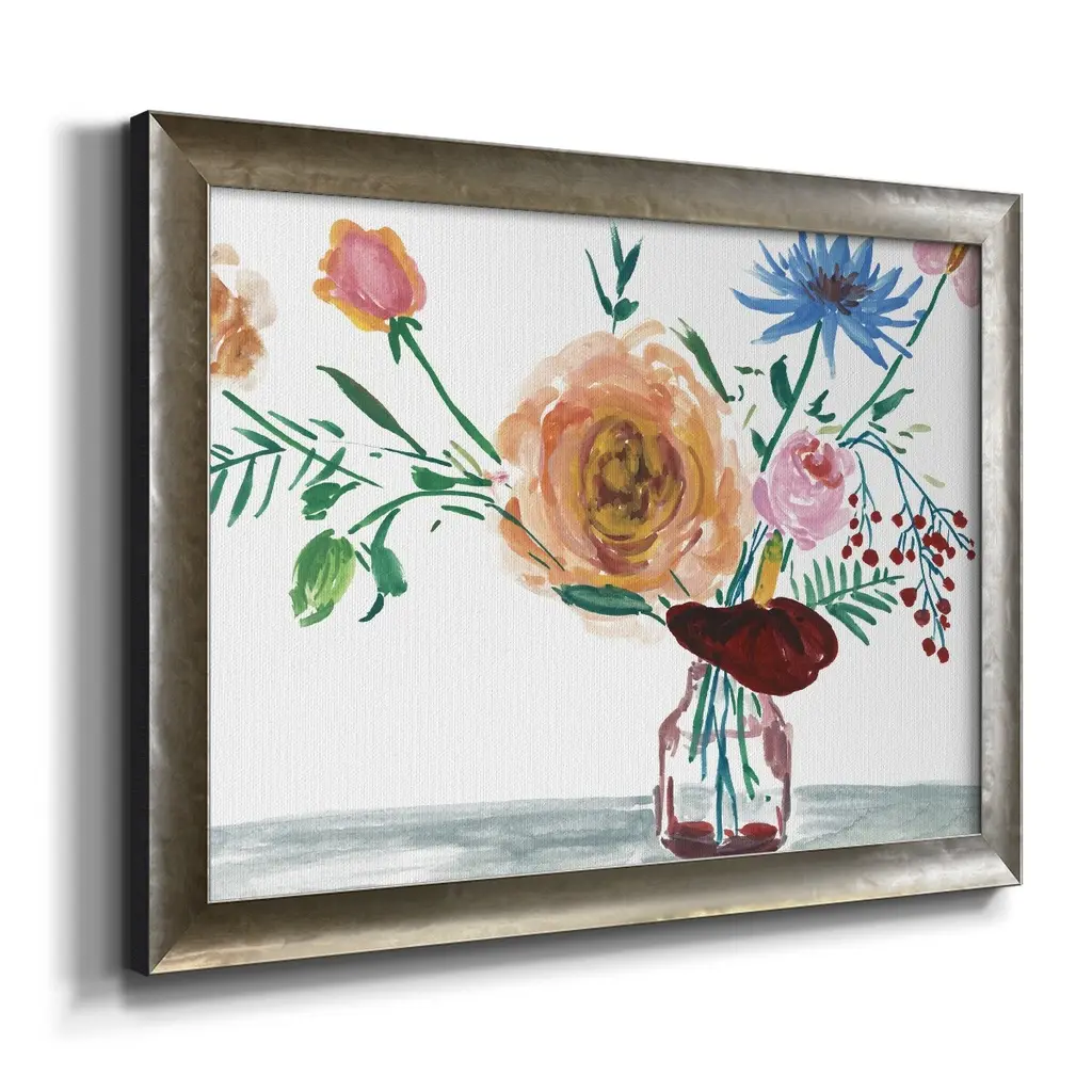 Celebration Bouquet IV Premium Framed Canvas- Ready to Hang A Premium Framed Canvas created to last. Framed in distressed wood and available in an array of sizes and colors Featuring a beveled a solid wood stretcher bar, each piece comes ready to hand 3 SIZES AVAILABLE 16''X20'' - Overall Size 18'X27'' - Overall Size 24''x36'' - Overall Size Each piece is made to order. Each piece comes with hanging hardware. Made in the USA Ready to Hang Giclee Paper Print Acrylic Glass Beveled Matt Board