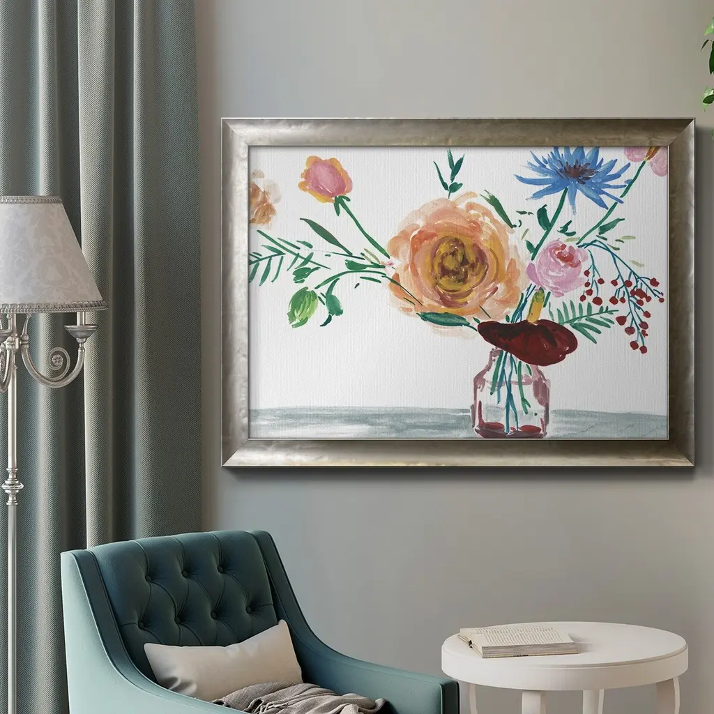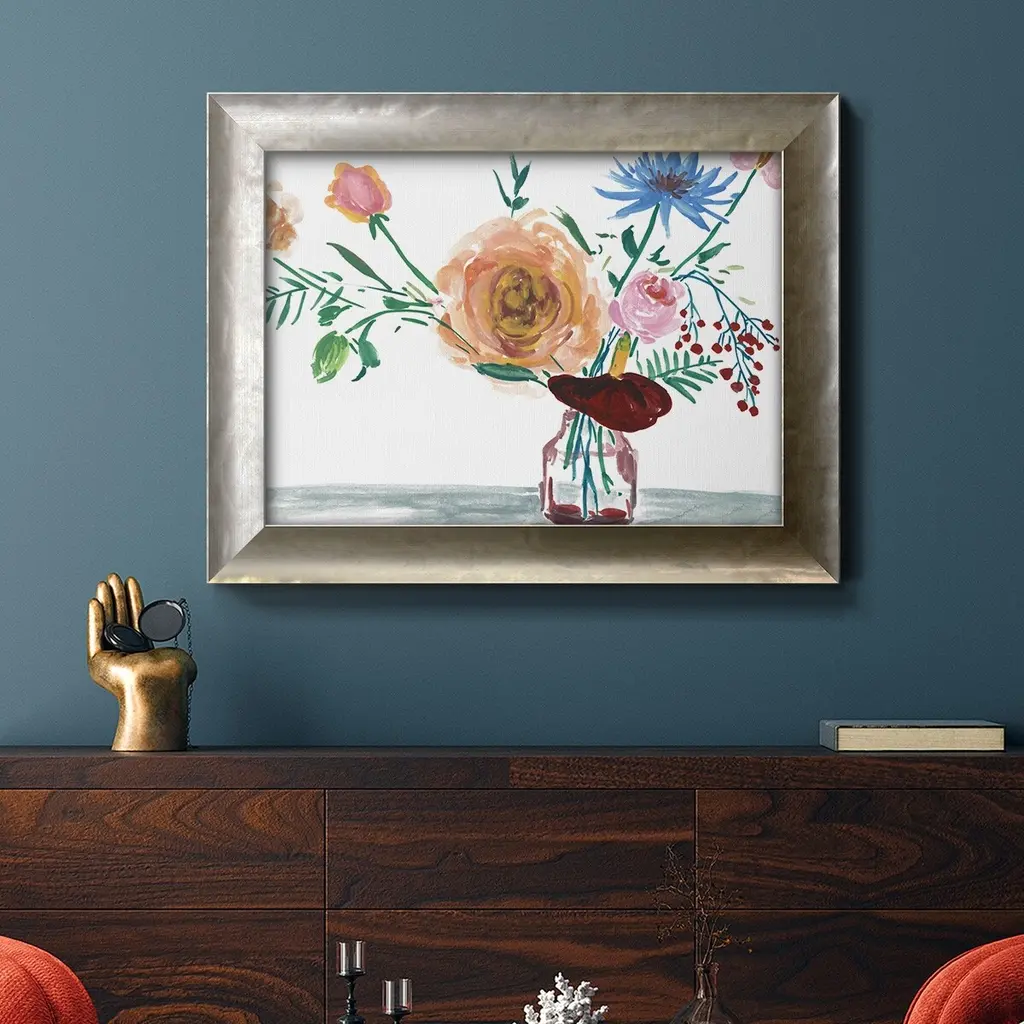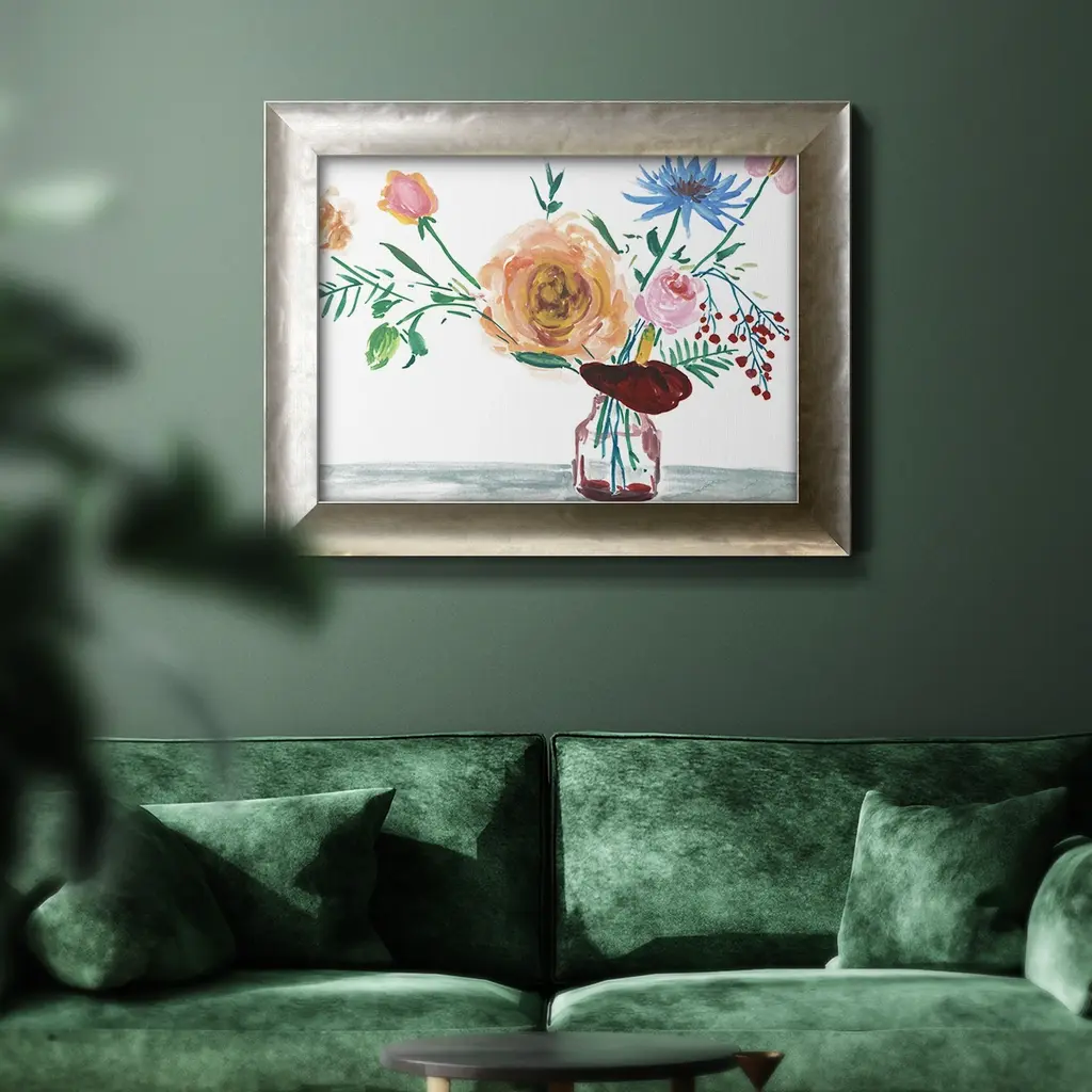 Celebration Bouquet IV Premium Framed Canvas- Ready to Hang A Premium Framed Canvas created to last. Framed in distressed wood and available in an array of sizes and colors Featuring a beveled a solid wood stretcher bar, each piece comes ready to hand 3 SIZES AVAILABLE 16''X20'' - Overall Size 18'X27'' - Overall Size 24''x36'' - Overall Size Each piece is made to order. Each piece comes with hanging hardware. Made in the USA Ready to Hang Giclee Paper Print Acrylic Glass Beveled Matt Board