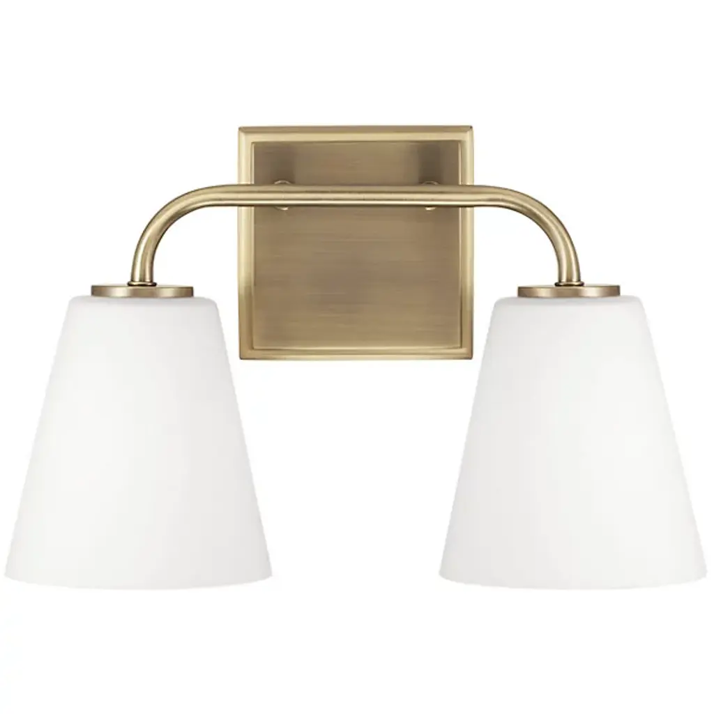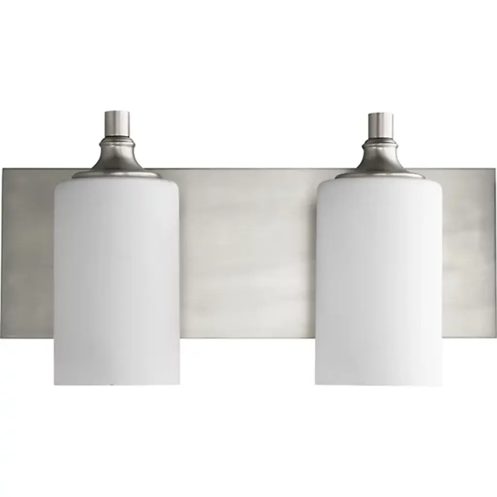 Cool, clean, and collected. The Celeste Vanity Light from Quorum International infuses your modern or traditional bathroom with a surge of sophistication, livened up by a neat glow. Looking at it in a side profile, subtle curves, and crisp geometry blend together gracefully, made from its bent arms and metal backplate. Marshmallow-like glass shades move across the framing backplate; they fill up into plump vessels of diffused light with the flip of a switch.