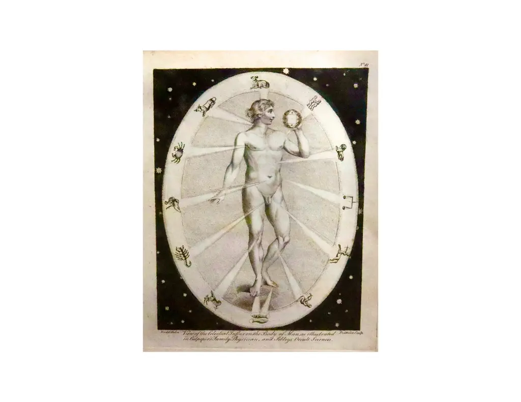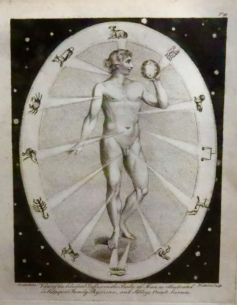 Dive into history with this antique framed engraving, a celestial illustration of a man as depicted in "Culpeper's Family Physician" and "Sibley's Occult Sciences". Originating from the insights of Nicholas Culpeper, a renowned 17th-century English herbalist, and Ebenezer Sibly, a prominent English physician and astrologer, this piece merges medical wisdom with mystical wonder. A rare glimpse into the interplay of science and the occult from centuries past. A collector's masterpiece.