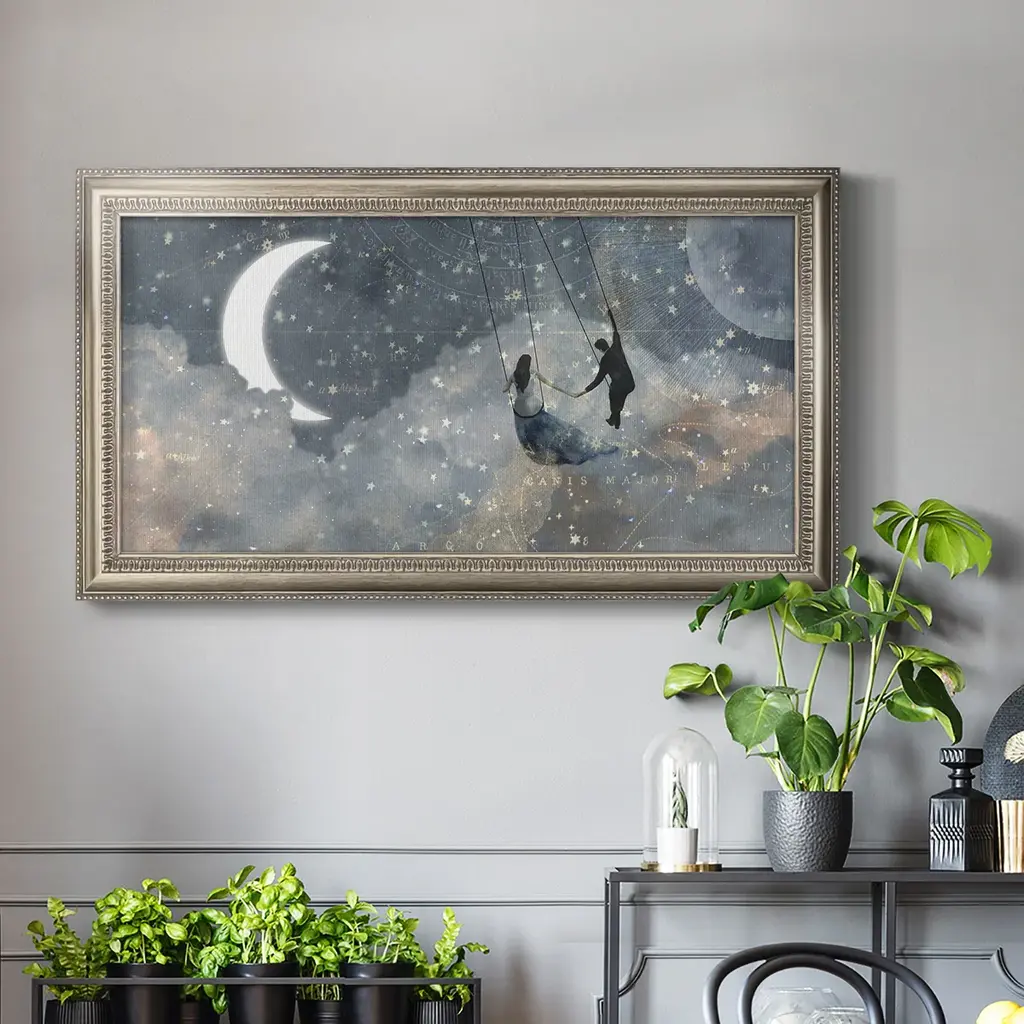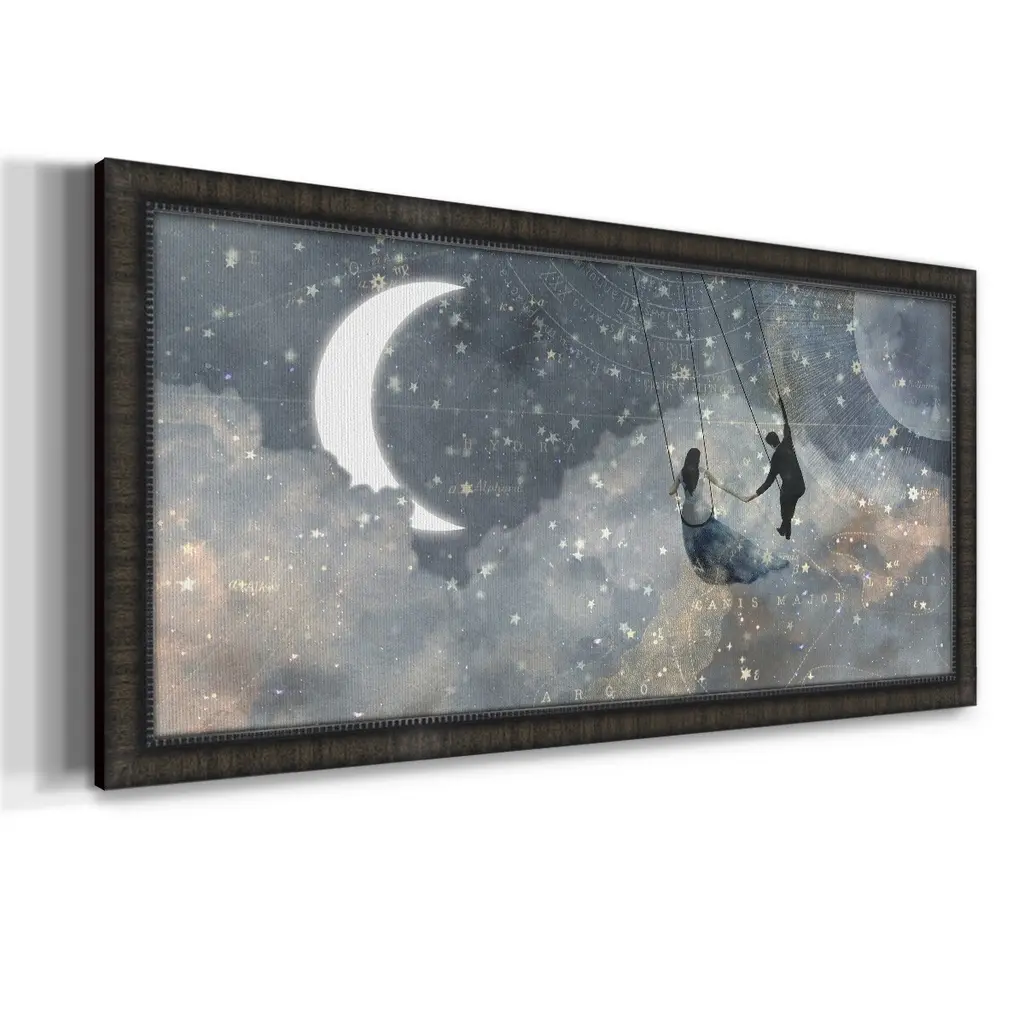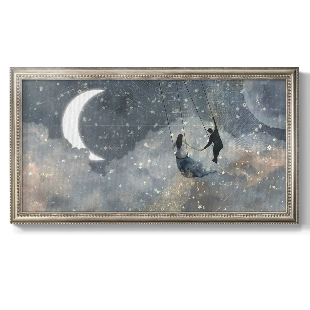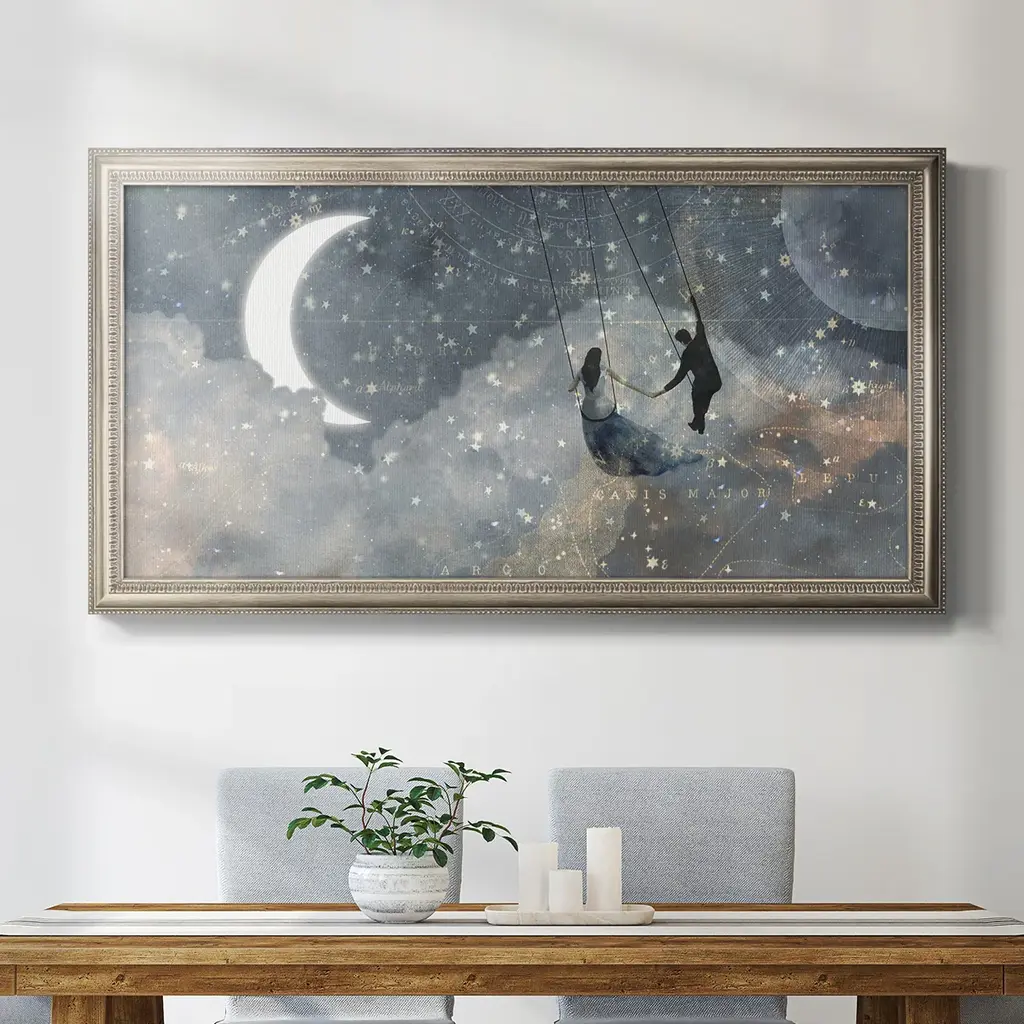 Celestial Love Collection D Premium Framed Canvas- Ready to Hang A Premium Framed Canvas created to last. Framed in distressed wood and available in an array of sizes and colors Featuring a beveled a solid wood stretcher bar, each piece comes ready to hand 3 SIZES AVAILABLE 21''X37'' - Overall Size 25''X45'' - Overall Size 29''x53'' - Overall Size Each piece is made to order. Each piece comes with hanging hardware. Made in the USA Ready to Hang Giclee Paper Print Acrylic Glass Beveled Matt Board