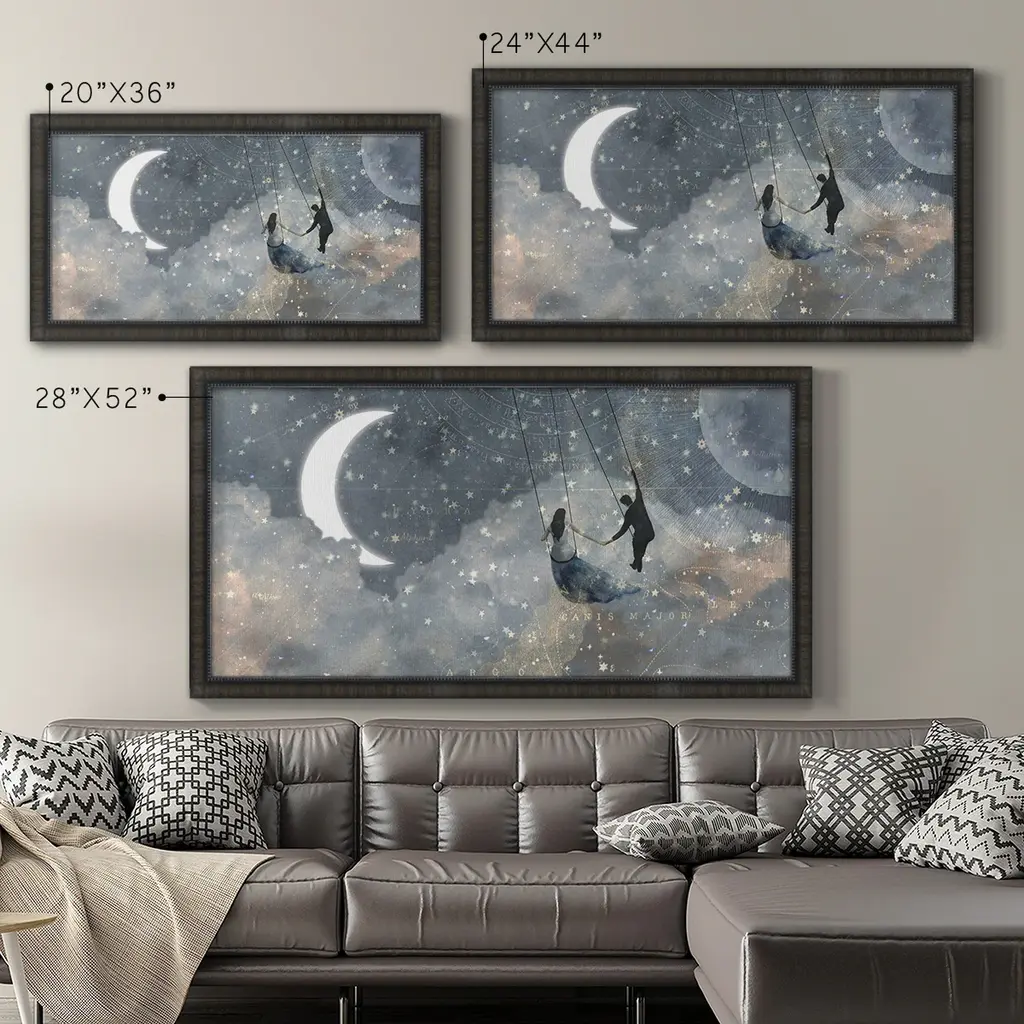 Celestial Love Collection D Premium Framed Canvas- Ready to Hang A Premium Framed Canvas created to last. Framed in distressed wood and available in an array of sizes and colors Featuring a beveled a solid wood stretcher bar, each piece comes ready to hand 3 SIZES AVAILABLE 21''X37'' - Overall Size 25''X45'' - Overall Size 29''x53'' - Overall Size Each piece is made to order. Each piece comes with hanging hardware. Made in the USA Ready to Hang Giclee Paper Print Acrylic Glass Beveled Matt Board