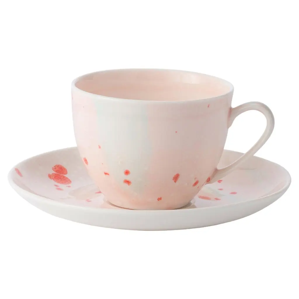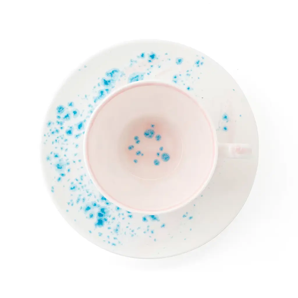 Pastel hues handled with meticulous care to evoke the charm of luminous abstract paintings define the one-of-a-kind design of this set of two tea cups and saucers from the Celestial Collection. The shaded, dripping look chosen for the pink enamel adorning the cups' interior recalls the color of the sea at dawn, the hue also echoed in the dainty spots on the exterior paired with blue specks emerging from the white porcelain. Slight differences from the pictured item are to be expected and cherished.