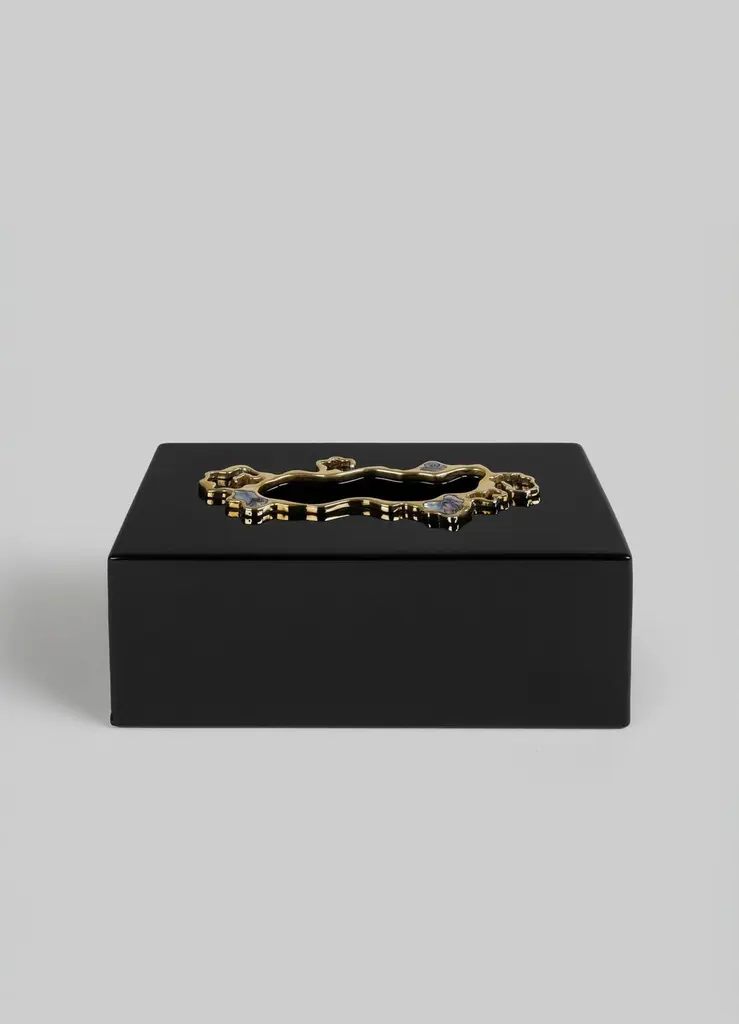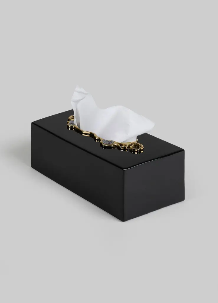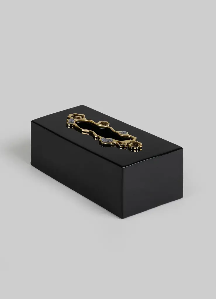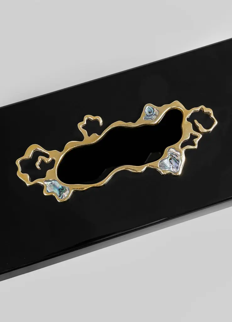 Celestial Tissue Box Black Large in Lacquer Wood & Brass, Viya By Vikram GoyalWhether it’s the dense, intricate patterns of clouds on the walls of the Badal Mahal, Rajasthan or the brilliance of stormy night skies in Pahadi miniature paintings, the grace and mystique of clouds have always intrigued us to the point of inspiration. Drawing from these ephemeral bodies- mediators between heaven and earth- our Baadal collection depict clouds through cast brass elements inlaid with semi-precious stones, employing the pietra dura technique on a deep black surface.Tissue Box in lacquer with brass. Handmade in India.Product DetailsMaterial: Lacquer with brassInlay: AbaloneSize: 9.5"L x 5.5"W x 4"H 24.1 L x 14 W x 10.2 H cmWeight: 0.69 kg 1.518 lbsNumber of Pieces: 1 Tissue BoxSKU: VTX102This product has been handcrafted by local artisans. As such, slight variations are a testament to the unique character of a piece made by hand.