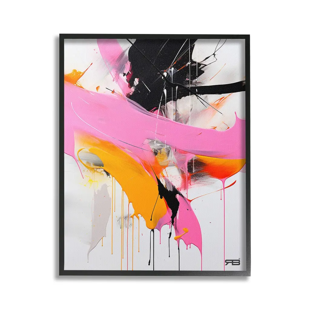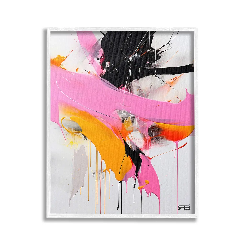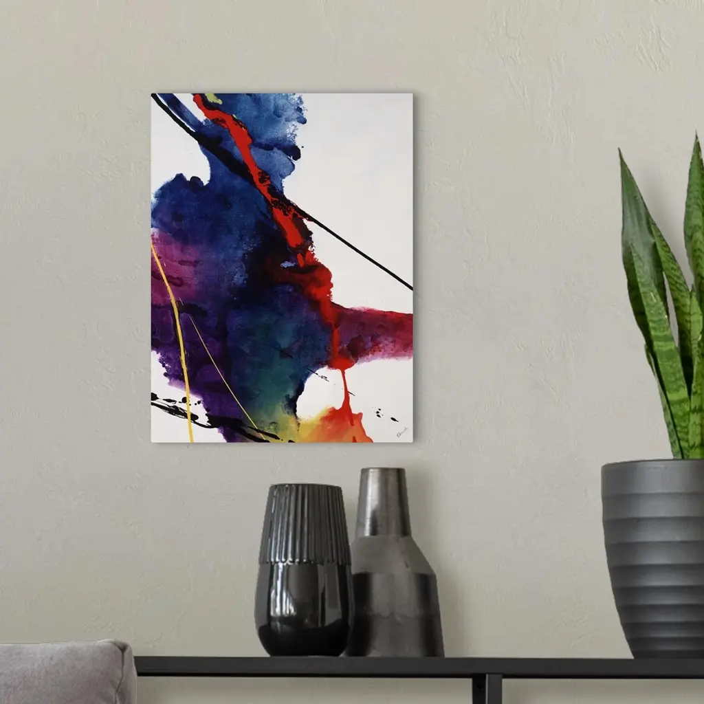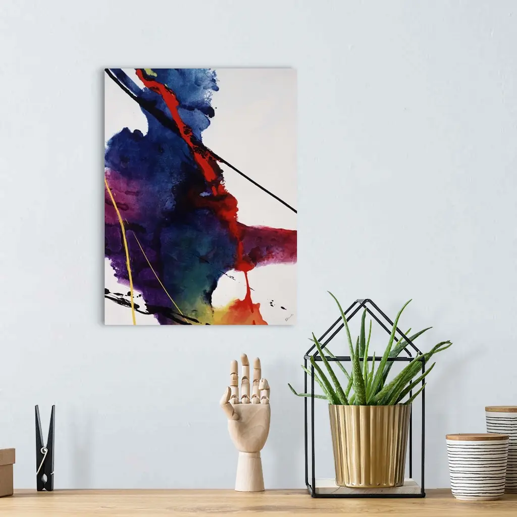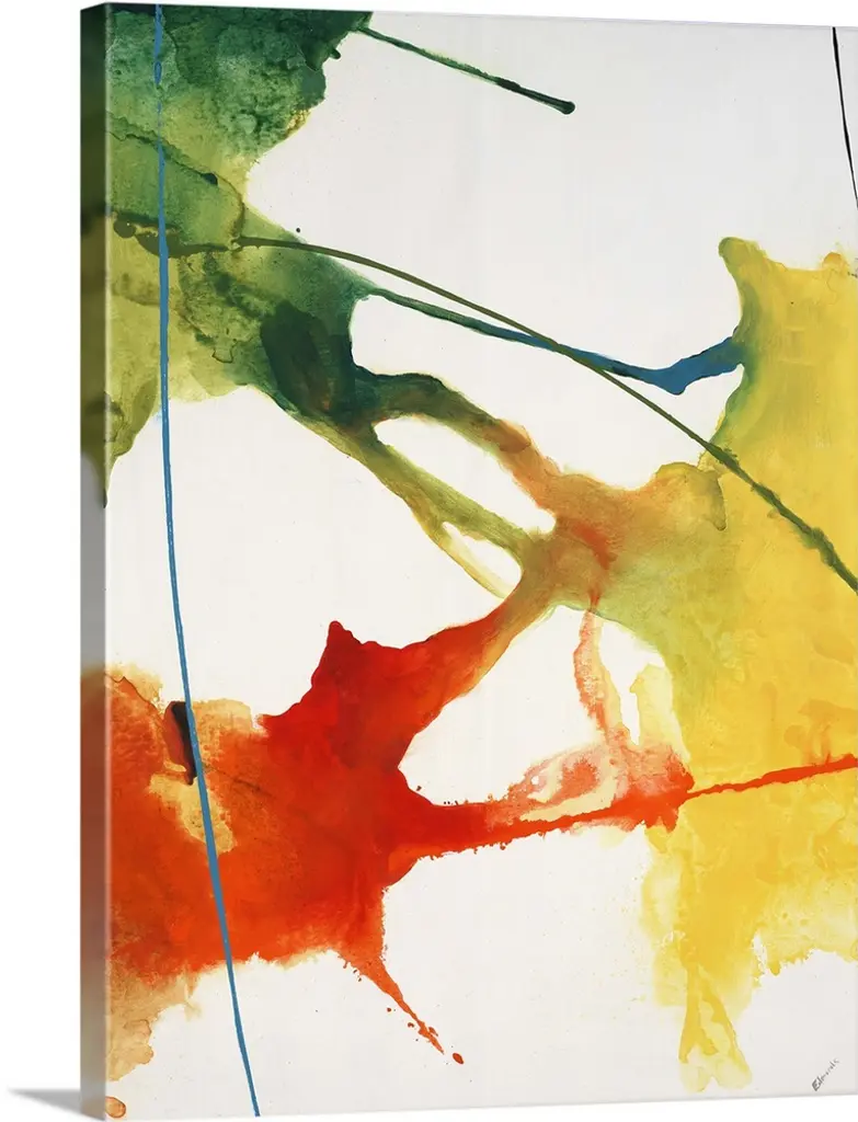 Contemporary watercolor painting of a multicolored mass with thin streaks of paint over a solid neutral background.