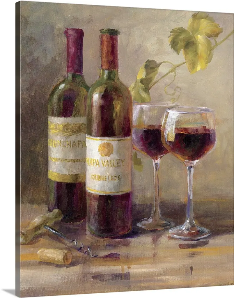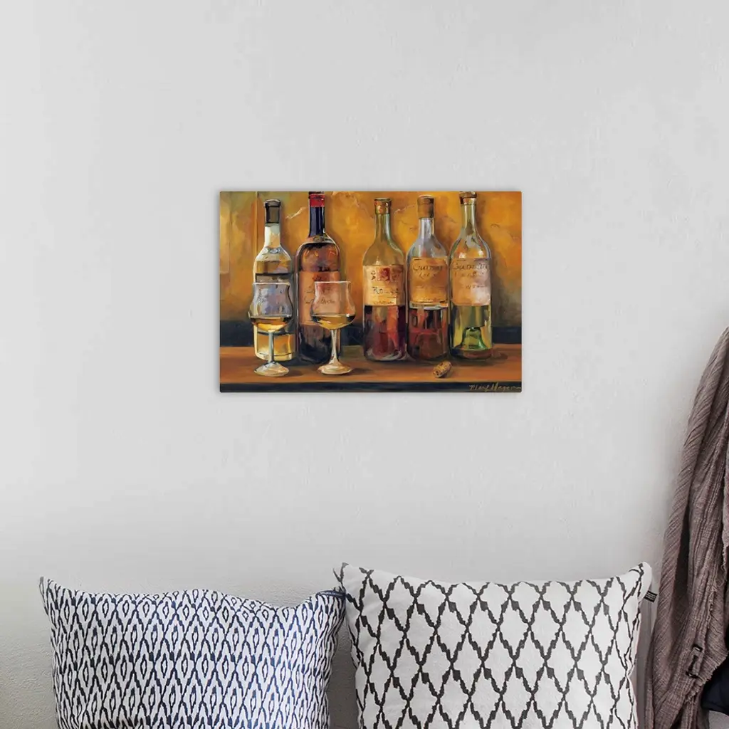 This horizontal still life painting shows five uncorked white wines waiting to be sampled.