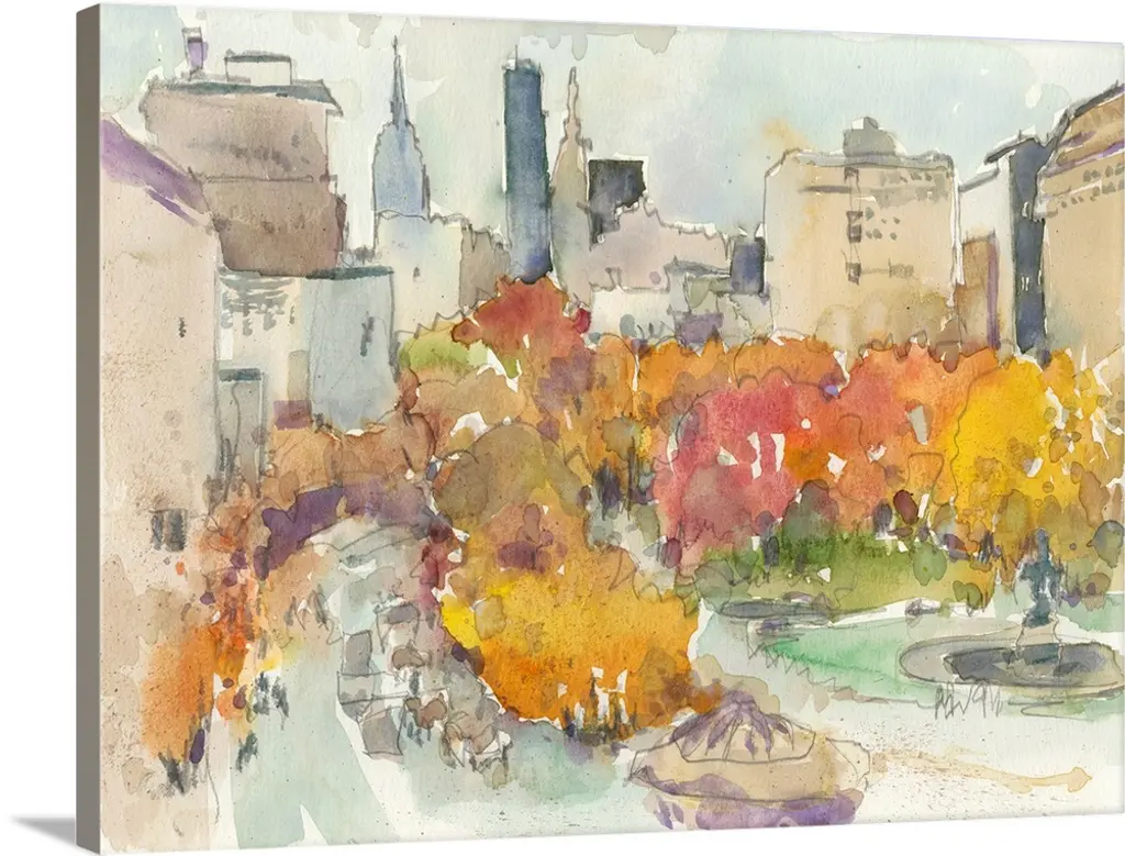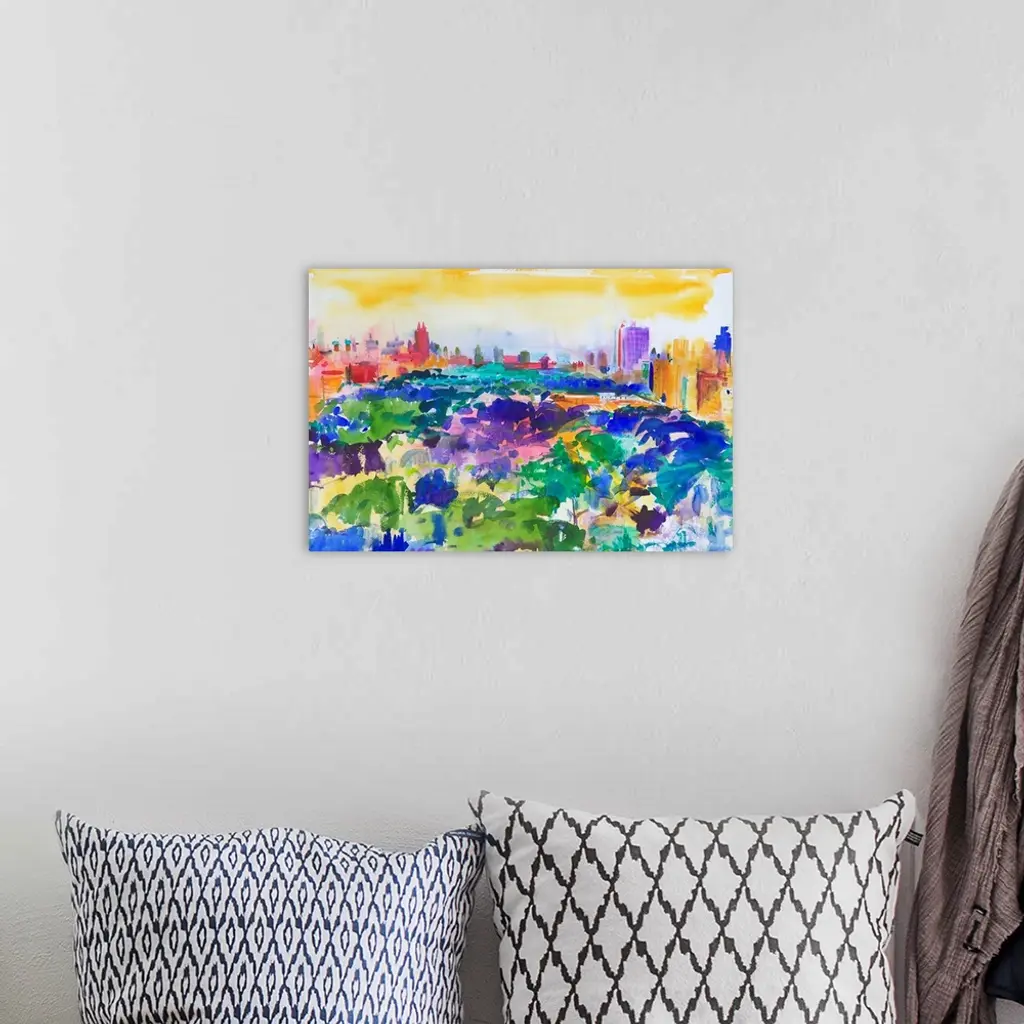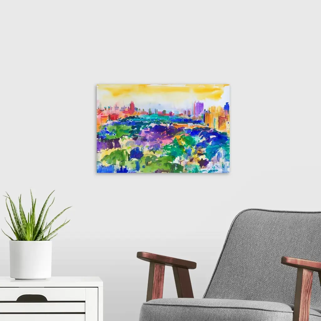 Contemporary abstract painting of Central Park with vibrant water colors.