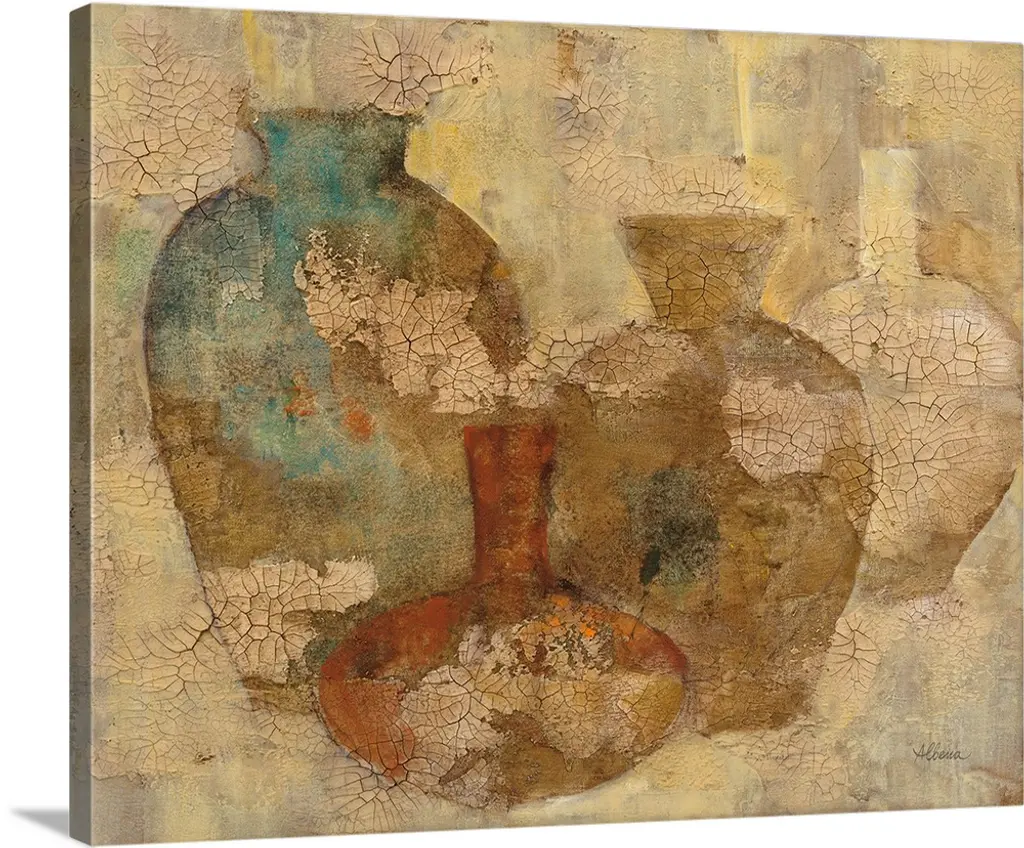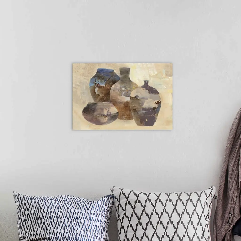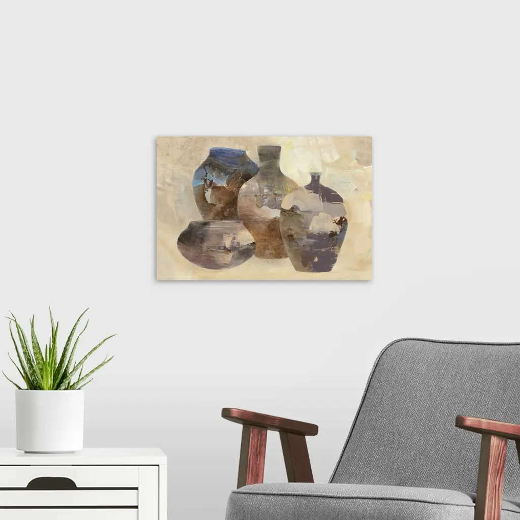 A contemporary painting of a group of pottery jugs in swirls earth tone colors.