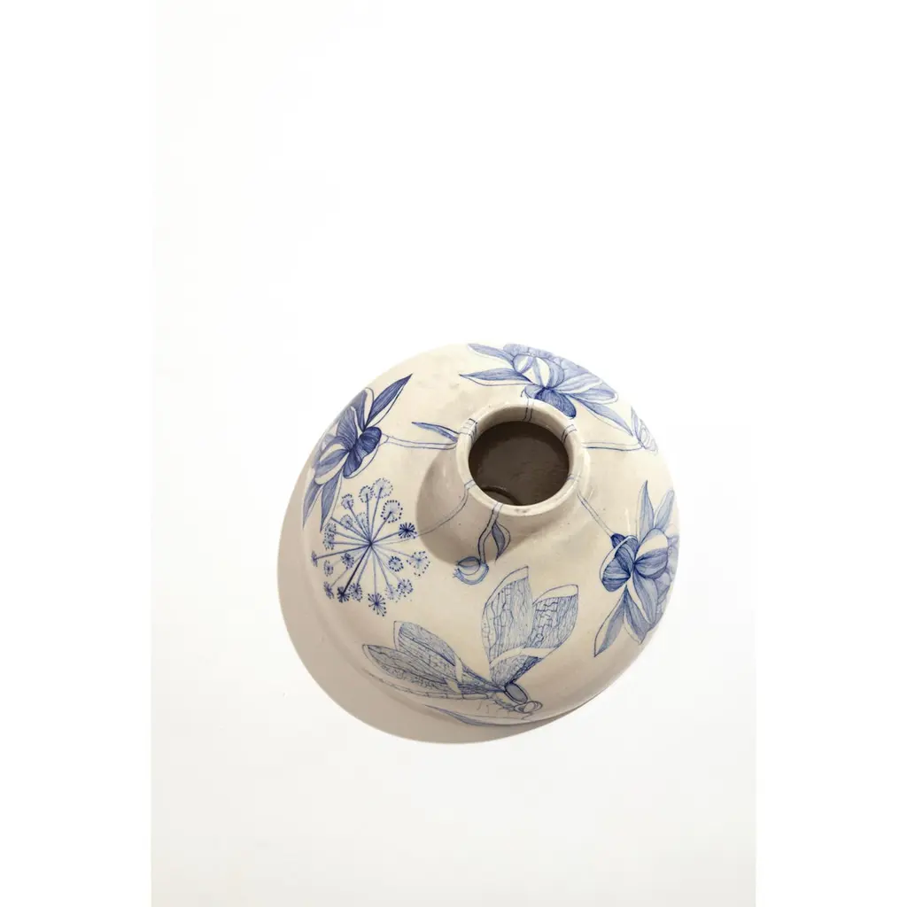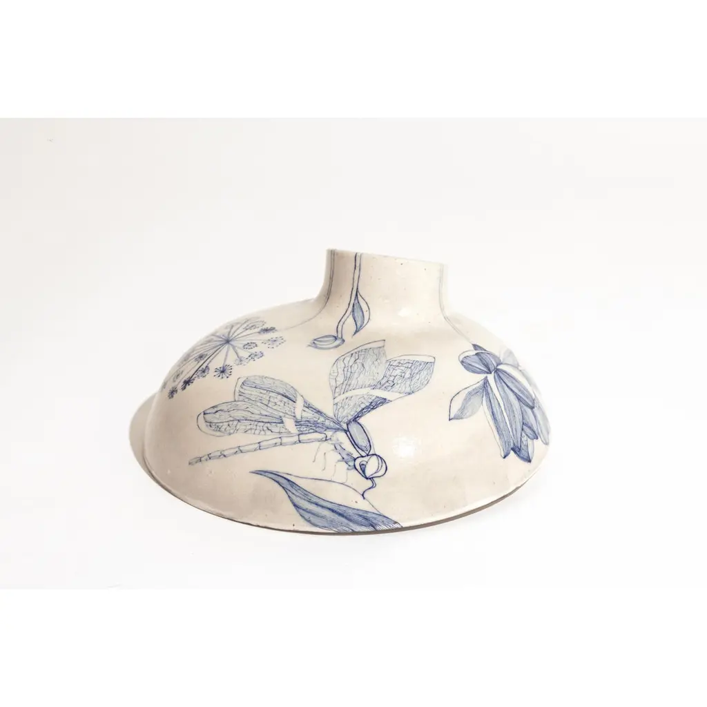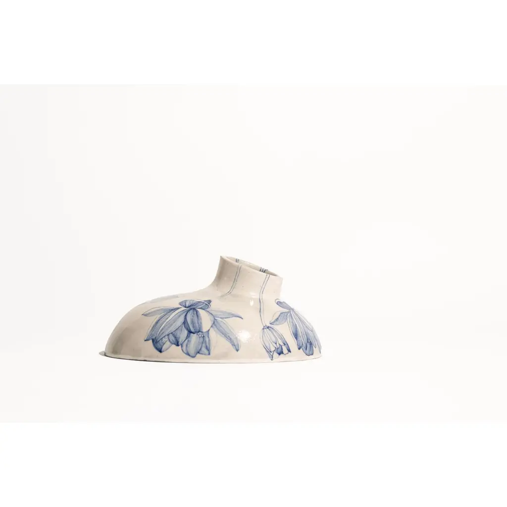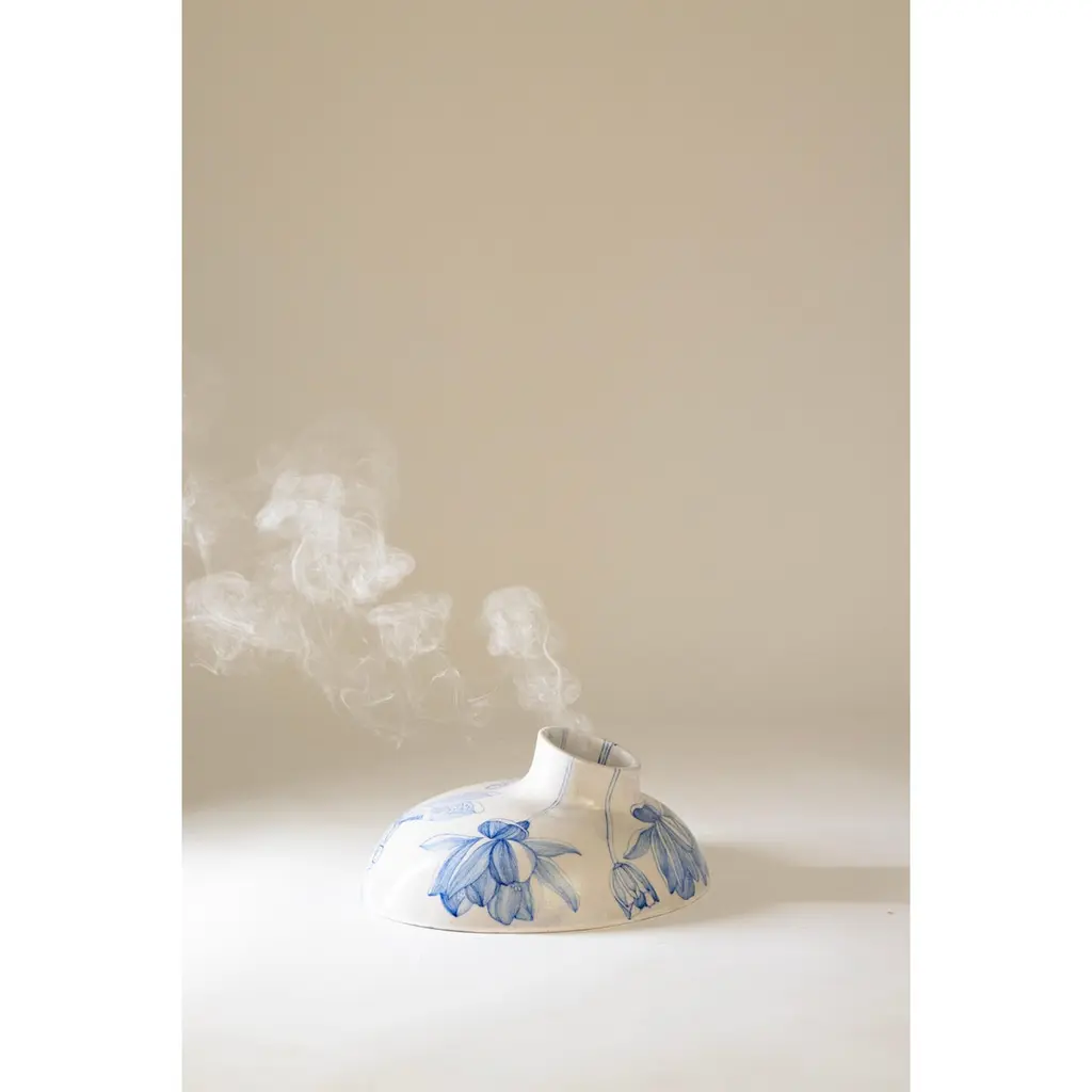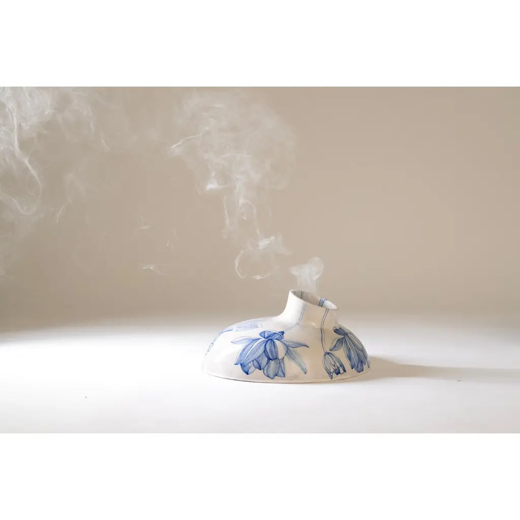 Ceramic Volcano Incense Burner Small by NewblueDimensions: D 26 x H 12.5 cmMaterials: Recycled Sanitary Ware, Recycled Glass, Quartz and Plant based binders The table-top volcano is the quieter counter-part to the volcano (big). Incense burner re-imagined as a volcano investigate the alchemy of using industrial waste in the 18th-century craft technique of Jaipur Blue Pottery. Hand-painted in Rajasthani miniature-style painting, veins of flowers and dragon flies float on the surface as the object tilts and erupts in function symbolising rebirth. New∙blue is a design and craft innovation company reinventing traditional Indian craft practices by recycling industrial waste to co-create contemporary collectibles.New∙blue is the second technological intervention in Jaipur Blue Pottery since the 1860s. Rooted in Indian craft’s legacy of making with local material abundance, we are connecting the largest craft concentration in the world to some of the largest landfill sites, creating value for ecology and economy alike.Based and born in Jaipur (India), we’re a team of material scientists, artisans, and designers reimagining the future of Indian craft by collaborating with industrial waste streams from sanitary ware and the steel industries. We aim to combine our expertise in craft research, product design, and material science to refocus climate action through traditional technologies.Newblue was founded by designer Disharee Mathur, a Jaipur-native, during her masters in Innovation Design Engineering (IDE) at the Royal College of Art and Imperial College, London. It is a result of conversations between 4 institutions across two countries- the Material Research Center at the Malviya National Institute of Technology (MNIT) and Neerja Blue Pottery in Jaipur, brought together with IDE at the Royal College of Art and Imperial College, London. It takes a participatory approach to rethinking craft from the particle level of the material to the mass of form and function; that is relevant, receptive, and innovates as an act of preservation.