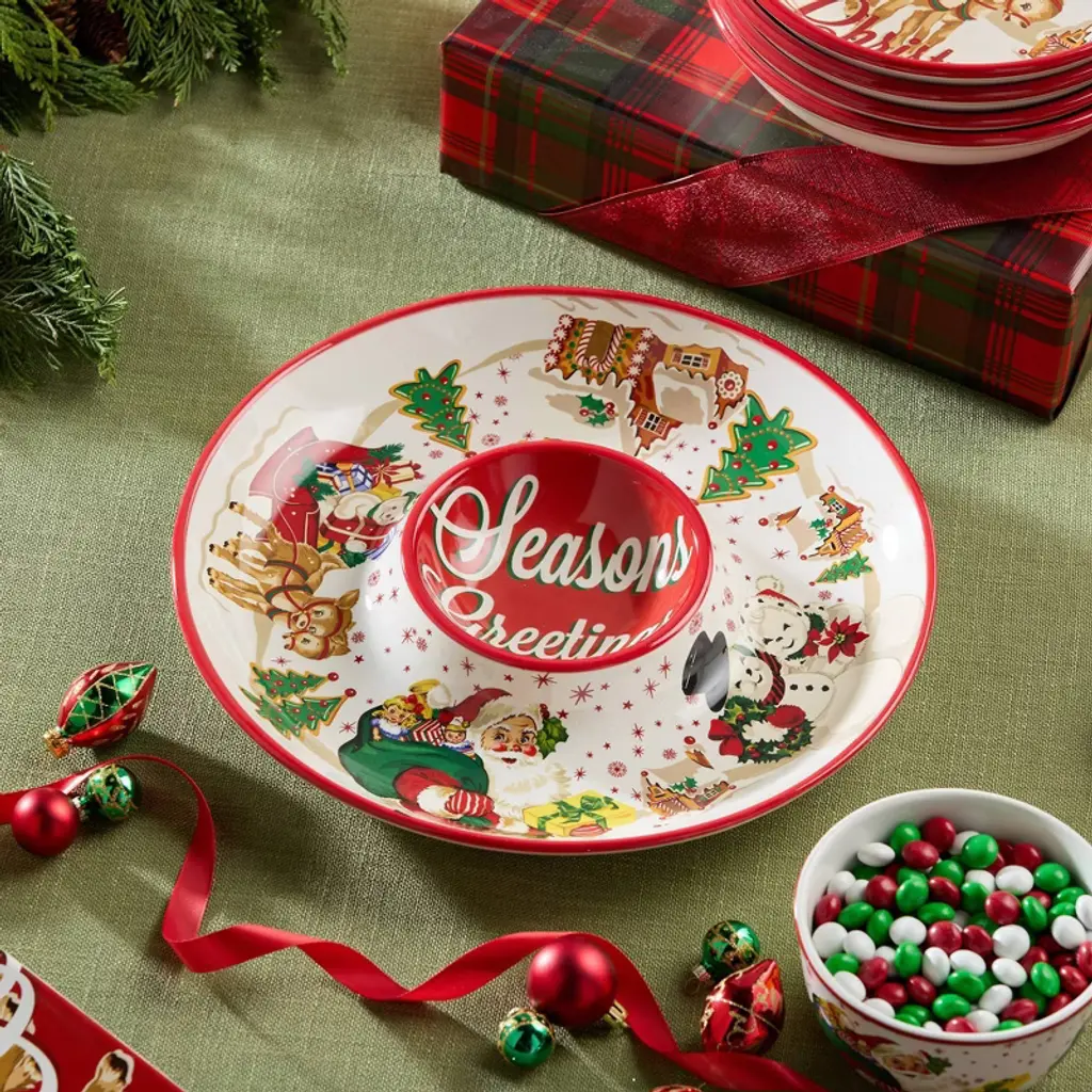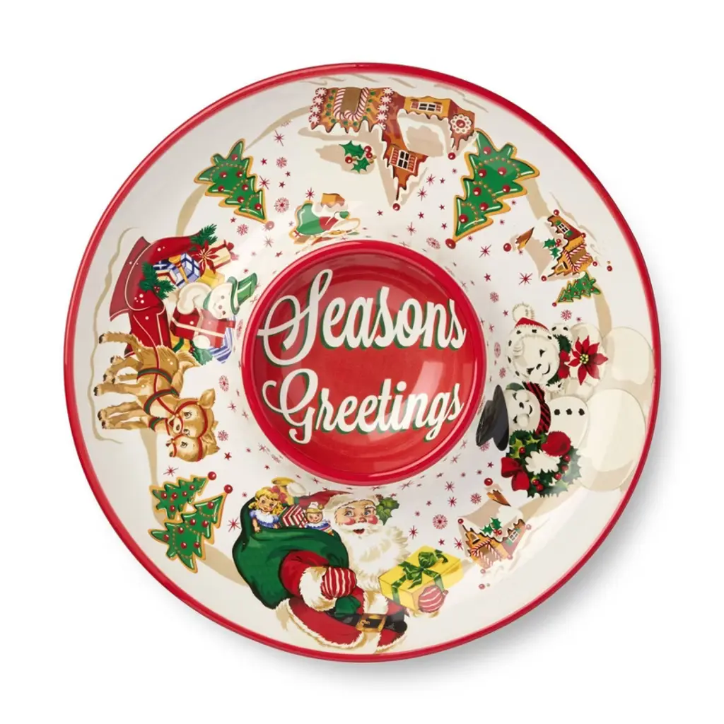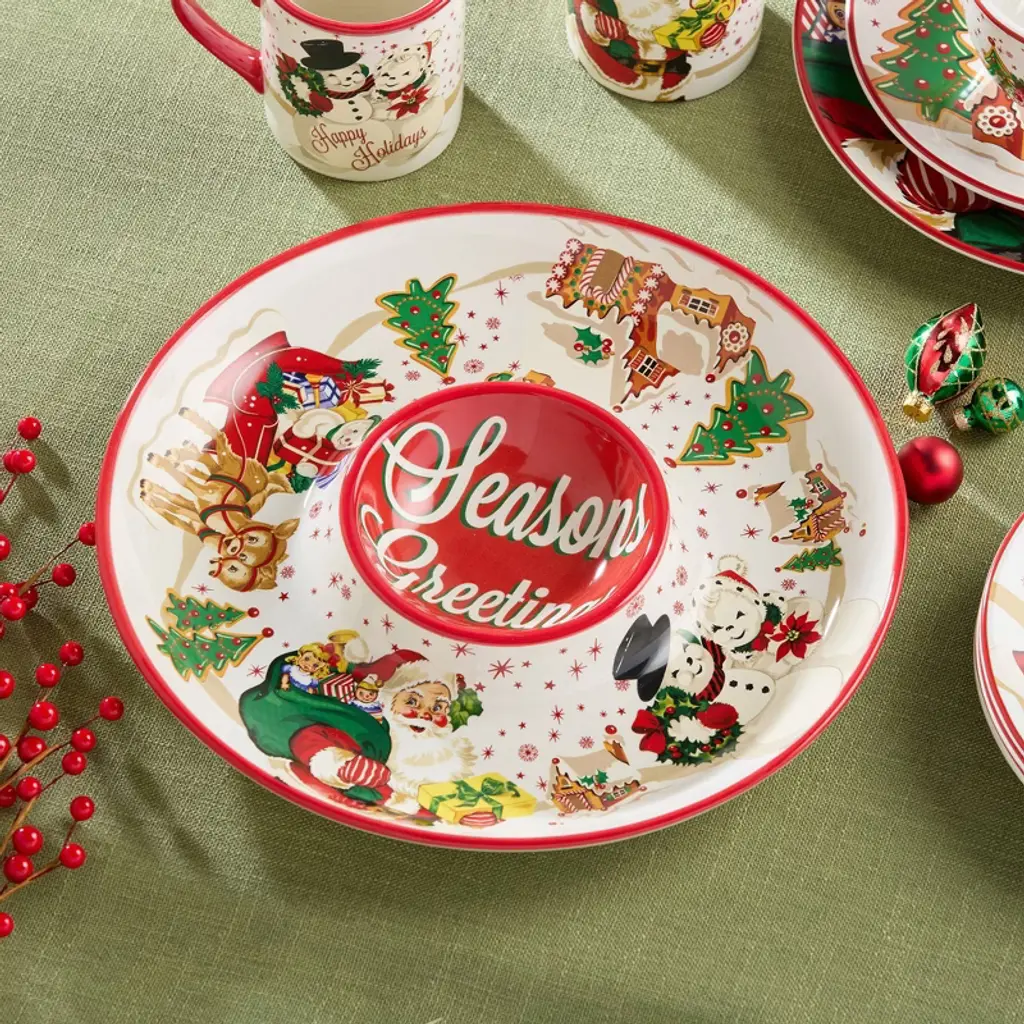Turn your holiday snacks into a celebration with the Santa’s Retro Christmas Chip & Dip Platter. Designed with cheerful vintage-style artwork of Santa, reindeer, and snowmen, this 13.75" ceramic dish adds nostalgic charm and festive fun to your table. The wide rim is perfect for chips, crackers, veggies, and fruits, while the built-in dip bowl keeps your salsa, guacamole, or dressing neatly centered for easy access. Crafted from durable, ceramic, it has the look of classic ceramic with the convenience of modern materials—lightweight, dishwasher safe, and stain-resistant. Whether you're hosting a Christmas party, throwing a holiday movie night, or simply making snacks feel special, this chip and dip set is your go-to for effortless entertaining. Use it alone or pair it with matching pieces from the Santa’s Retro collection. It’s a joyful, functional, and festive essential for every holiday gathering.