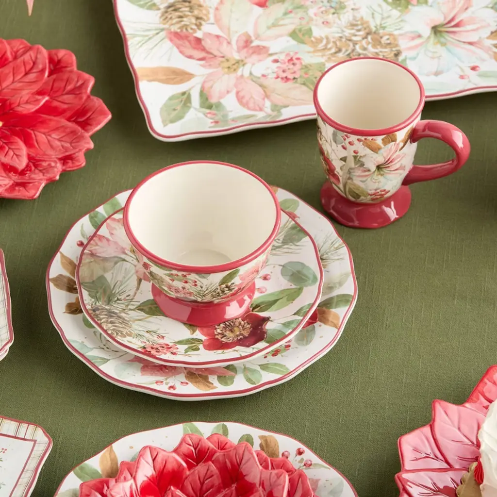 Warm your table with the floral beauty of the Winter Blooms Set of 4 Ice Cream Bowls. These 24 oz ceramic bowls feature seasonal artwork in a palette of poinsettias, pinecones, and evergreen foliage. Ideal for desserts, soups, fruit, or snacks, each bowl offers a festive design that coordinates with the rest of the Winter Blooms dinnerware line. Microwave safe and dishwasher safe, they offer convenience and elegance for both entertaining and everyday use. Their versatile size and sturdy construction make them the perfect companion for winter desserts, late-night snacking, or festive party spreads. Each bowl has its own variation of the winter motif, creating a colorful, coordinated display full of personality and seasonal warmth.