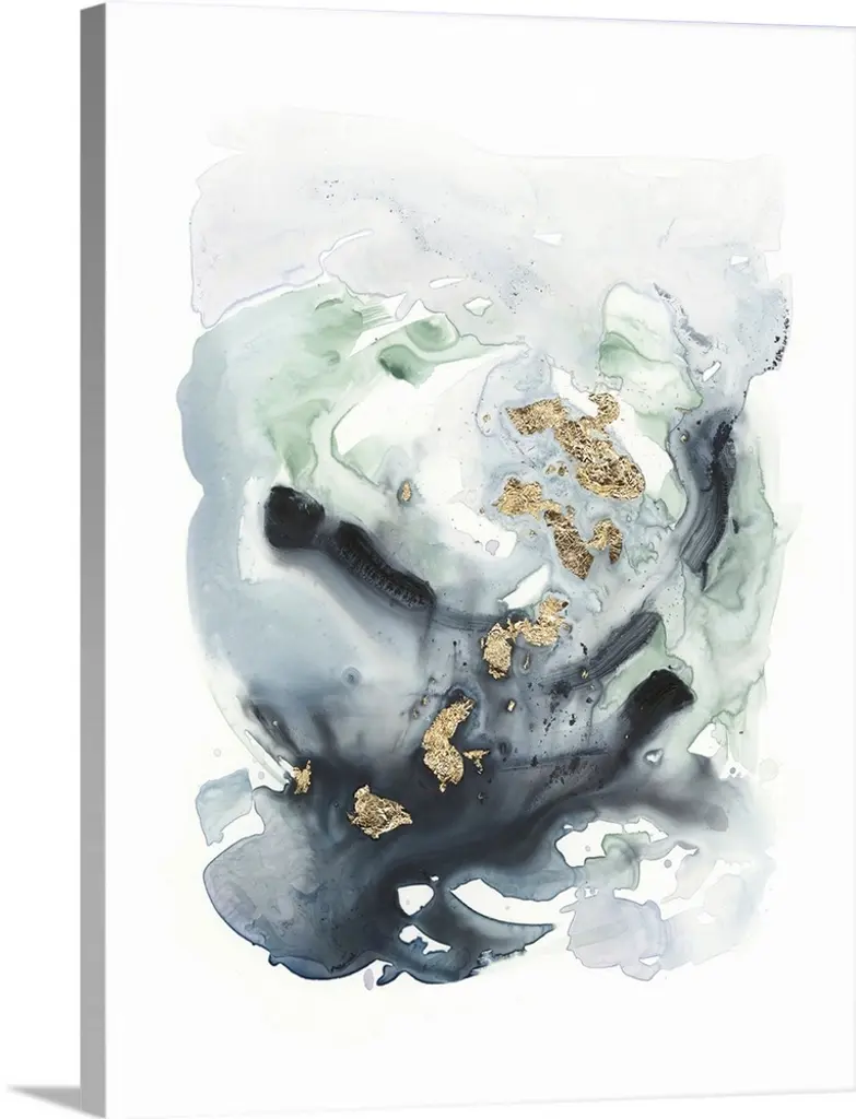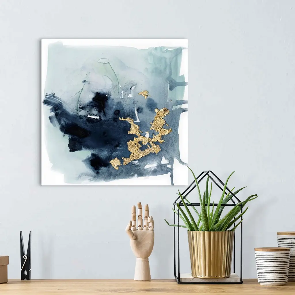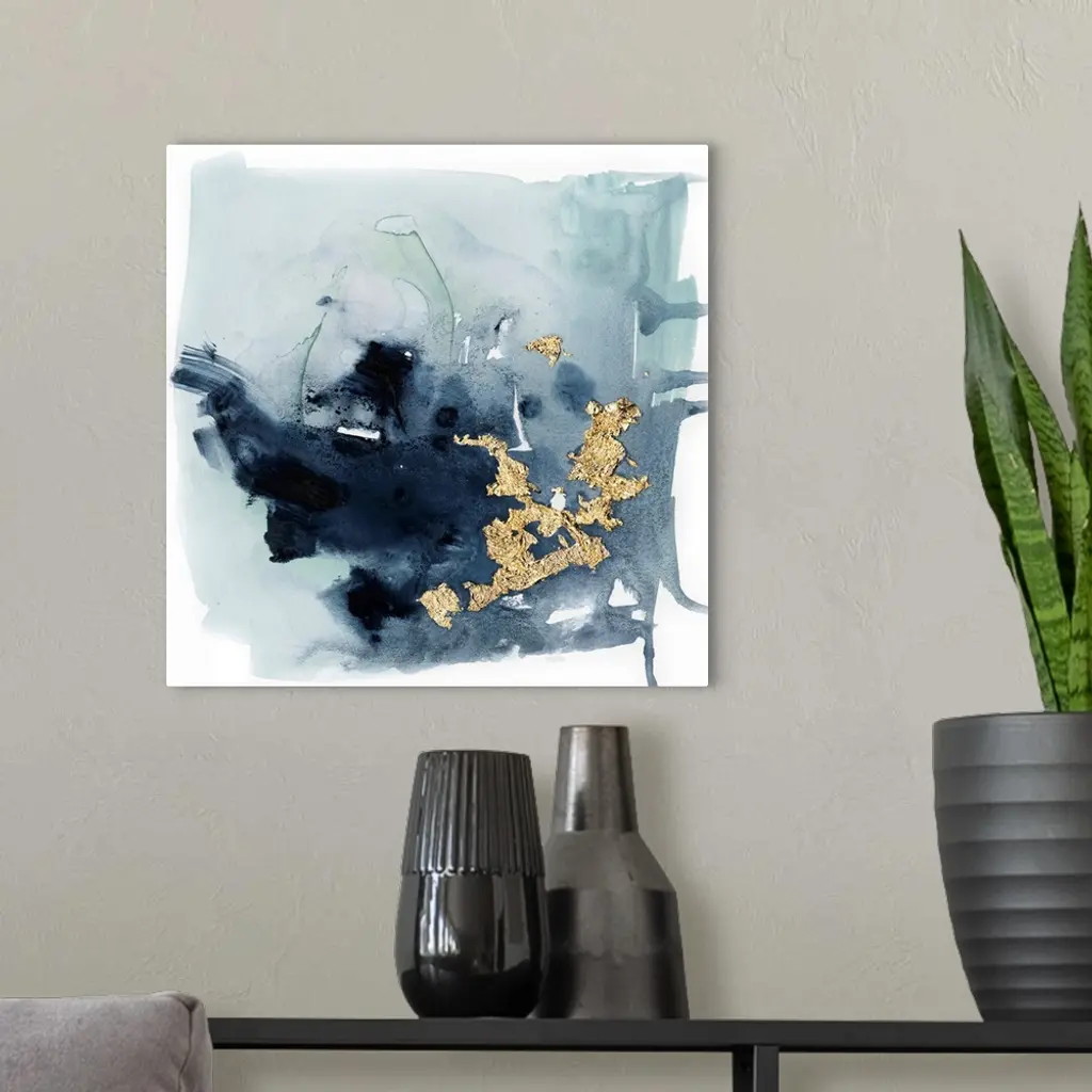 Watercolor painting of chaotic brush strokes of blue/gray tones with metallic gold leaf accents.