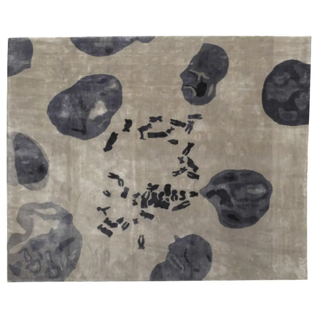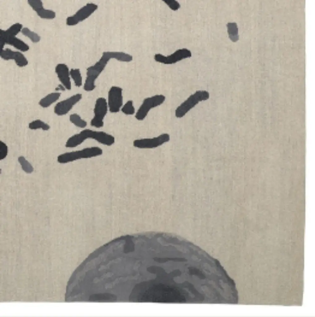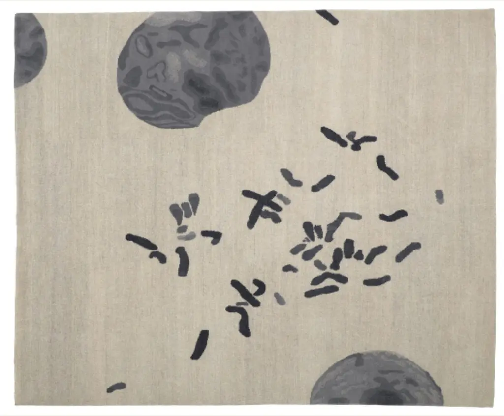 CF Chromosome P. 28D by Caturegli FormicaDimensions: W 220 x L 180 cmMaterials: WoolCarpets as deep informationCarpets are very common items. But it has never really been clear if their decorations, so confidently woven and intertwined, have a religious, symbolic or simply practical origin.Anthropology does not fully clarify the matter, and historians simply focus on classifying colors, techniques, ethnic signs. Personally, though, I have always had the impression that carpets, apart from their geographical source, have a much more complex origin, not connected with their religious or secular use, but instead with the representation of cosmic vibrations or information. I sense that the carpet (like a big ear) can directly record from the ground on which it is spread.The mysterious intertwinings of carpets seem, in fact, to record forms of mystical thought that spring spontaneously from the infinite, ritualized but always varied repetition of their weave. A sort of cognitive, reiterative, exploratory structure that is born in the dark mazes of a collective mind, that reflects on the expansion of the cosmos. Something like the visions of a blind man, who describes a universe he has never seen.Like the visible circles on water, the carpet records invisible circles and forms, following logical theorems that cannot be deciphered, conceived by some theoretical physicist who investigates unexplored levels of the world and knowledge.I think Caturegli and Formica approach this mysteric-scientific dimension of carpets, interpreting them as deep genetic diagrams or the memory of faraway superficial tracks (villages, or tires). Somehow, in fact, their carpets are no longer carpets, because they are not just carpets but reflections on the permanence of decorative diagrams within the logic of nature, science and technology.Carpets, then, as sensitive surfaces that record some kind of inexplicable harmonies, reproducing them not as decorations but as sacred patterns, as deep information that only the textile surface, in contact with the ground, is able to transmit.Biographical notesBeppe Caturegli (1957) and Giovannella Formica (1957-2019) shared a background in the cultural atmosphere of the Radical Architecture movement in Florence. After taking architecture degrees in 1982, they moved to Milan to begin a long, intense working relationship with Ettore Sottsass, the Memphis group and the magazine Terrazzo.In 1987 they opened the Caturegli Formica Architetti Associati studio and for ten years they worked as consultants for Computer Associates, a US-based software firm, for which they designed facilities in Milan and Rome. Alongside work on architecture and interiors, they have designed products for many different Italian and international companies, including Sanyo, WMF and Fontana Arte.Their curiosity and passion for architecture around the world has led to frequent trips to the United States and Japan, and then regular travels in India and several African countries, where they have conducted research in collaboration with local architects, artists and artisans. The aim is to enrich the meaning of products, projects and works of architecture, using mixed systems: industrial/crafts, global/local, mass-produced/one-off.In the period 1987-1991 they created Terre, a ceramics series produced in the workshop Céramiques Almadies, and collaborated with the design group 100% Dakar, honoured by the President-poet Léopold Senghor for their work on racial integration.From 1989 to 1993 they worked on the restoration and extension of a vast estate in Madras (Chennai), and made a series of symbolic stone objects in collaboration with the sculptors of Mahabalipuram.Their work is very heterogeneous, ranging from residential and commercial architecture to restoration, interiors to furniture, lamps and flatware, paintings and ceramics to video.Since the early 1980s they have designed carpets, seen both as useful objects and as maps of knowledge. Most of the carpets are part of site specific works for private clients. This is a way of working on the applied arts that goes almost against the current, in a period in which industrial design moves toward global standardization and uniformity.In 1989 they participated, together with the Memphis group, in the exhibition Carpets at the Design Gallery, and created a collection of carpets and tapestries for Elio Palmisano in Turkey and Italy. Later, they have also worked in Iran, China, Singapore, Hong Kong, Kashmir and Tibet, collaborating with craftsmen and selecting small companies that use purification systems for water used in colouring, and apply procedures for the safety and well-being of workers.Since 2004, Nilufar Gallery has shown the Caturegli Formica carpets collections .In 2007, for the exhibition Onehundred, they presented Super-market, a collection of cabinets called Photo-boxes and characterized by images reproduced on the doors that show the geography of global consumption and document real places and objects of the planet.In 2010 they presented a series of twenty photo-montages and eight collections of rugs for their exhibition Nodi/Hubs, a kind of reflection on certain macro-knots of occidental thinking: the environment and consumption of the territory, genetics and GMOs, catastrophes, chaos theory, archival storage and the mind, the chemical essence of life.One aspect of their research, honoured with international prizes and publications, is the structural use of colour and light in architecture. More recently, they have put great commitment and research into an energetic use of light, in the context of bio-architecture projects with objectives of heightened sustainability.In 2004-2014 they carried on the project of restoration and revitalization of a vast historic property in Tuscany, where they have applied advanced solutions for energy supply and savings, through the use of a range of integrated alternative energy sources. The Tenuta dello Scompiglio esta