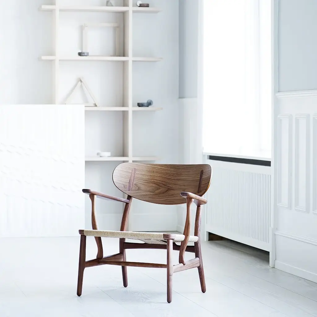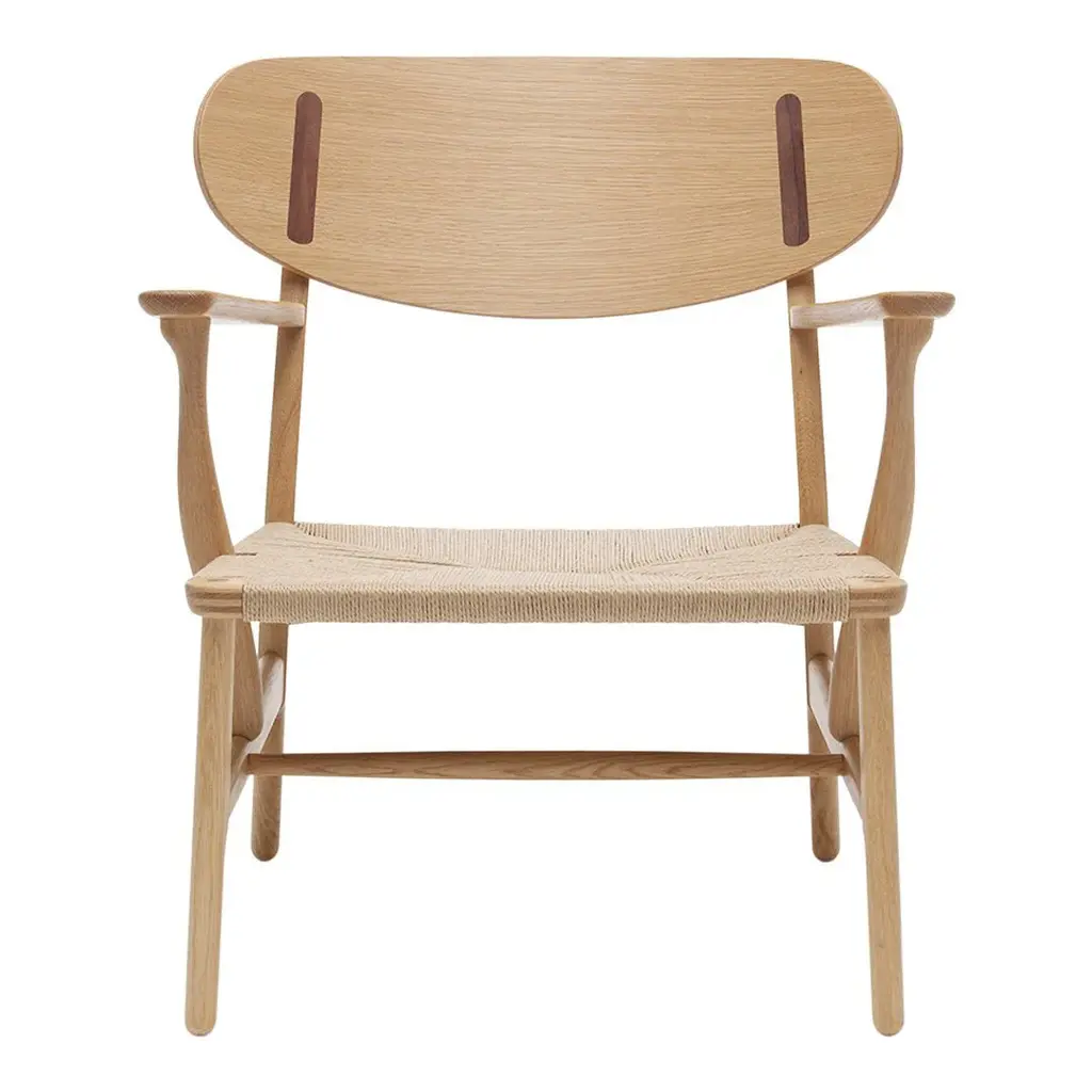 Wegner's CH22 lounge chair is part of a debut four-chair collection which also included design icons such as CH24 - better known as the Wishbone Chair - which has become a design classic around the world. The CH22 lounge chair has been produced in exact accordance with Wegner's original sketches, and unites simplicity with absolute comfort. The low lounge chair is made of solid wood with a distinctive form-pressed veneer back with an organic shape. Wegner has focused on sublime craftsmanship, as evident in the woven seat and the refined and ingenious joints, which are structural and ornamental at the same time - a classic Wegner trait. NOTE: Oak/walnut is a mix version combined with a frame in oak and armrest/backrest in walnut. "Cover Cap" refers to the covering on the back seat rest.