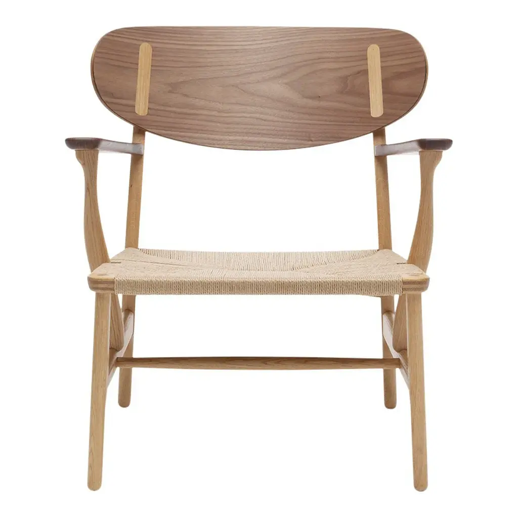 Wegner's CH22 lounge chair is part of a debut four-chair collection which also included design icons such as CH24 - better known as the Wishbone Chair - which has become a design classic around the world. The CH22 lounge chair has been produced in exact accordance with Wegner's original sketches, and unites simplicity with absolute comfort. The low lounge chair is made of solid wood with a distinctive form-pressed veneer back with an organic shape. Wegner has focused on sublime craftsmanship, as evident in the woven seat and the refined and ingenious joints, which are structural and ornamental at the same time - a classic Wegner trait. NOTE: Oak/walnut is a mix version combined with a frame in oak and armrest/backrest in walnut. "Cover Cap" refers to the covering on the back seat rest.