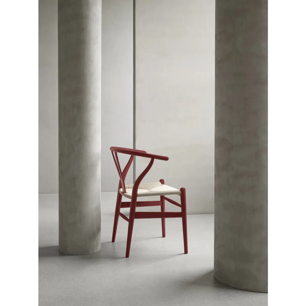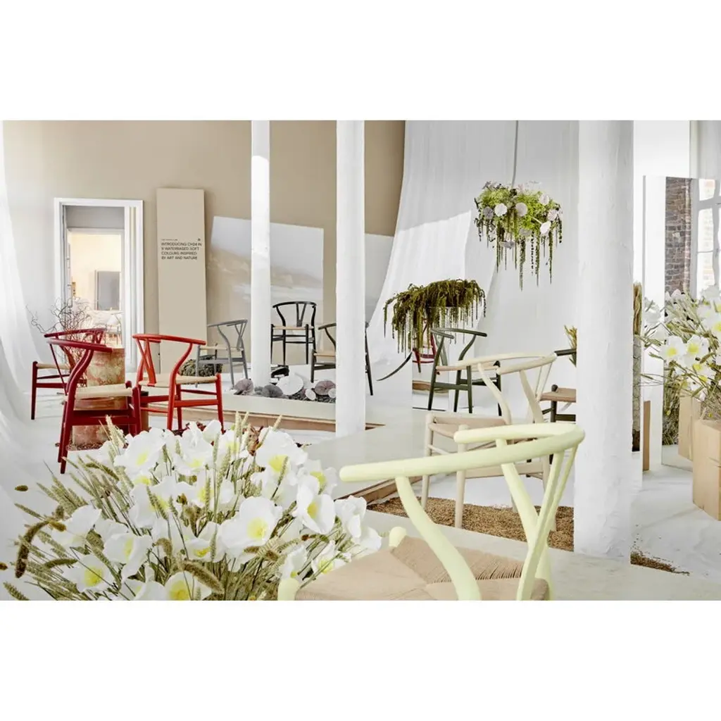 To celebrate the more than 70 years of the CH24 Wishbone collection, Carl Hansen & Søn asked designer Ilse Crawford to design nine new colors for the iconic chairs. Crawford created a soft yet intense color palette inspired by the expressionist paintings of the renowned Danish artist Per Kirkeby and the raw beauty of the Nordic landscapes, plants and soil. The eco-friendly, water-based matte colors are launched one by one during 2022. The CH24 chair, also known as Wishbone, is a true Danish design classic. Designed by Hans J. Wegner in 1949, the Wishbone chair has been produced by Carl Hansen & Søn since 1950. When designing the CH24 chair, Wegner wanted to combine the backrest and armrests into one single piece. To support the steam-bent top, he developed the classic Y-shaped back, which earned the chair the name Wishbone. The end result was an elegant and graceful chair with seating comfort in a class of its own. The manufacturing process of the Wishbone chair involves more than 100 steps, most of which are still made by hand. The hand-woven seat alone takes a skilled craftsman about one hour and 120 meters of paper cord to make. The carefully finished Wishbone is a masterpiece of traditional craftsmanship and Danish design.