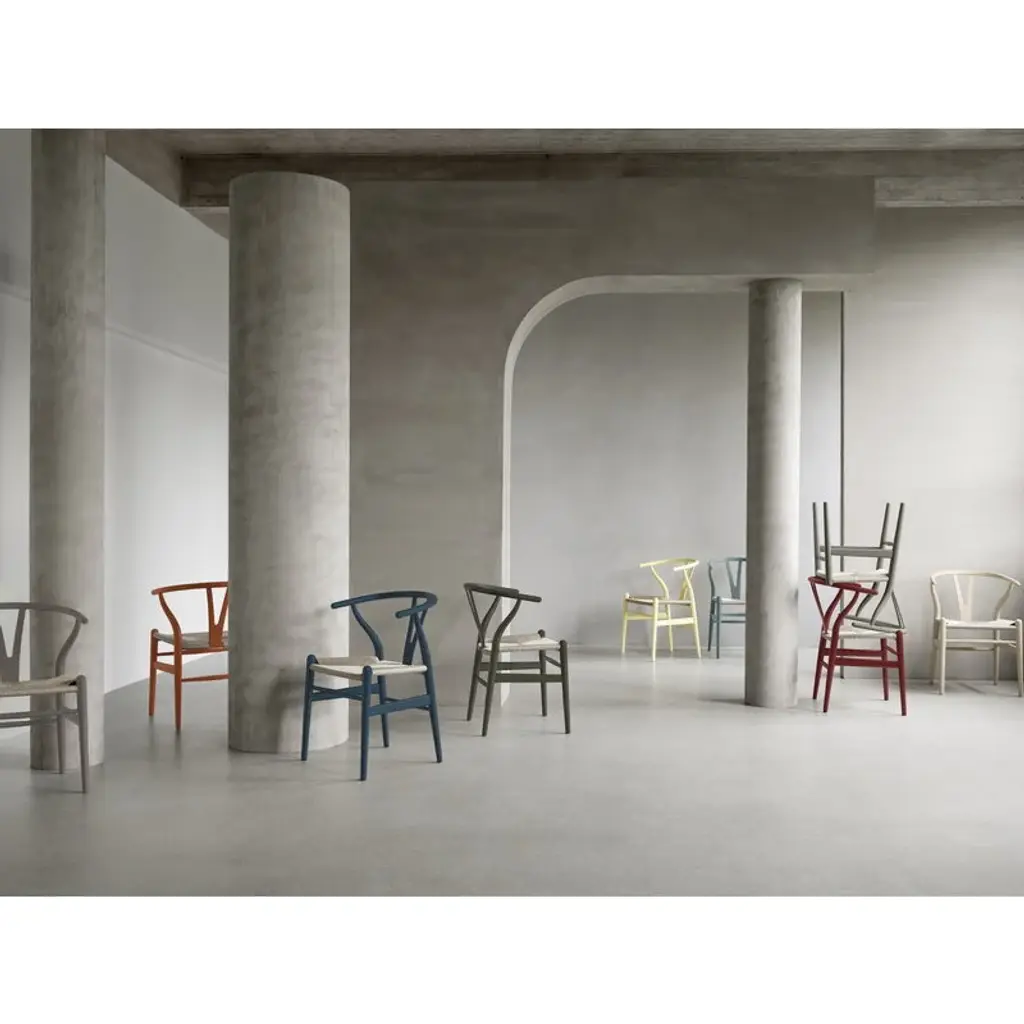 To celebrate the more than 70 years of the CH24 Wishbone collection, Carl Hansen & Søn asked designer Ilse Crawford to design nine new colors for the iconic chairs. Crawford created a soft yet intense color palette inspired by the expressionist paintings of the renowned Danish artist Per Kirkeby and the raw beauty of the Nordic landscapes, plants and soil. The eco-friendly, water-based matte colors are launched one by one during 2022. The CH24 chair, also known as Wishbone, is a true Danish design classic. Designed by Hans J. Wegner in 1949, the Wishbone chair has been produced by Carl Hansen & Søn since 1950. When designing the CH24 chair, Wegner wanted to combine the backrest and armrests into one single piece. To support the steam-bent top, he developed the classic Y-shaped back, which earned the chair the name Wishbone. The end result was an elegant and graceful chair with seating comfort in a class of its own. The manufacturing process of the Wishbone chair involves more than 100 steps, most of which are still made by hand. The hand-woven seat alone takes a skilled craftsman about one hour and 120 meters of paper cord to make. The carefully finished Wishbone is a masterpiece of traditional craftsmanship and Danish design.