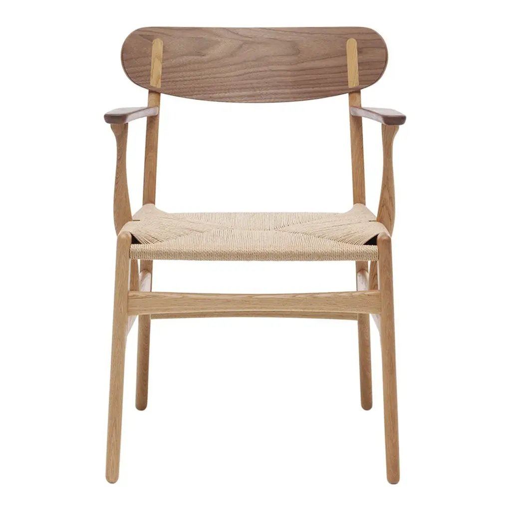 Carl Hansen & Søn has breathed life into Hans J. Wegner's previously unknown CH26 dining chair design from 1950. The CH26 chair has finally been brought to life in line with Wegner's original sketch. Its curved organic shapes and exceptional craftsmanship make it a true Wegner classic. NOTE: Oak/walnut is a mix version combined with a frame in oak and armrest/backrest in walnut. "Cover Cap" refers to the wood cap on the back seat rest.