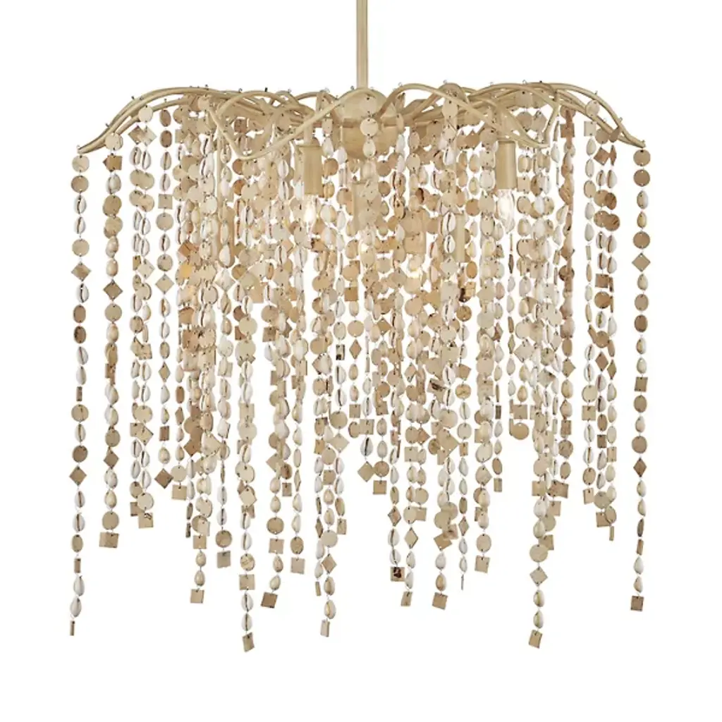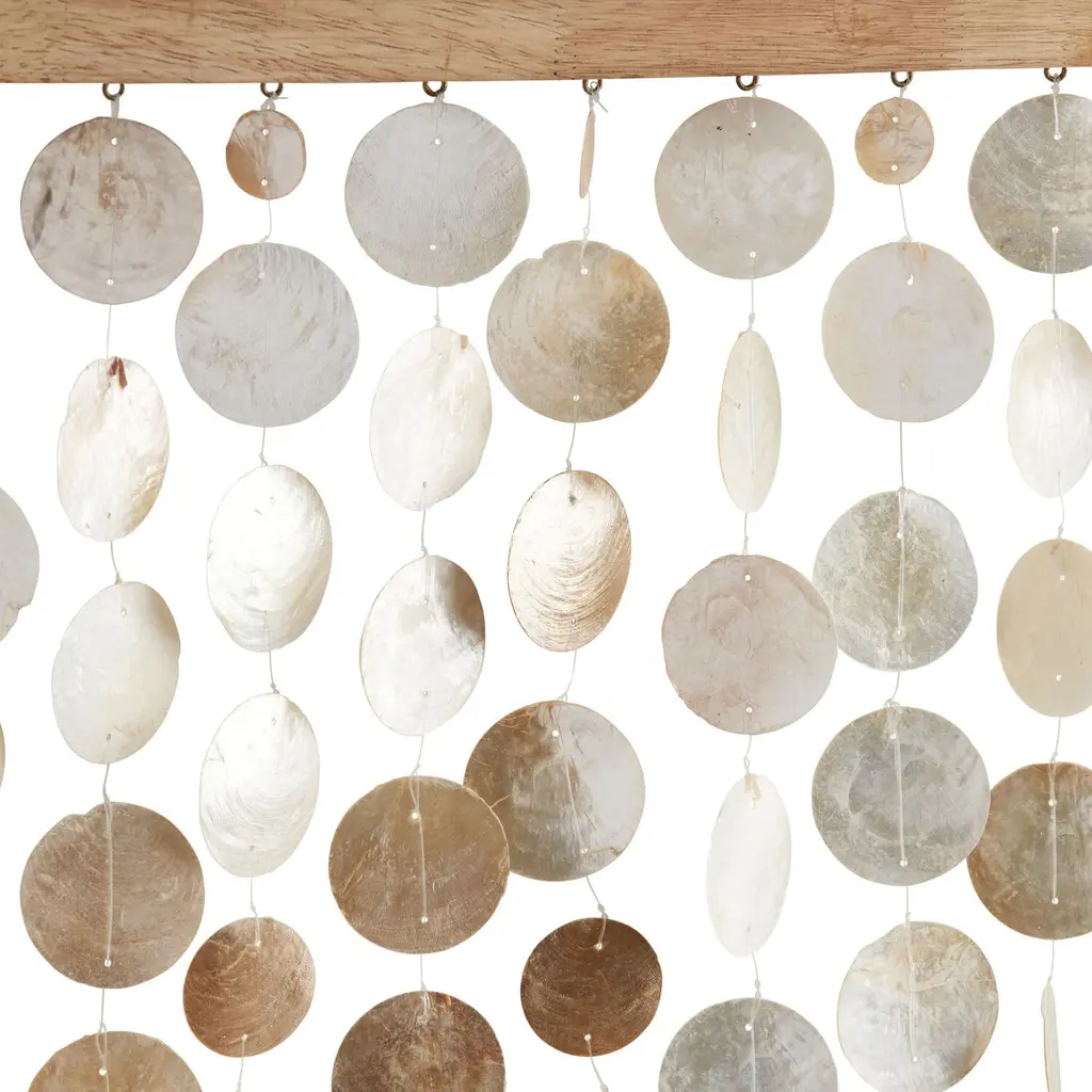 Strands of hand-cut, iridescent champagne-colored capiz shells hang from a natural wood bar on this tropical wall art that dazzles with an island influence. Handcrafted by artisans in the Philippines, this dynamic wall decor plays off the light in the room and offers a sense of movement with its cascading waterfall effect.