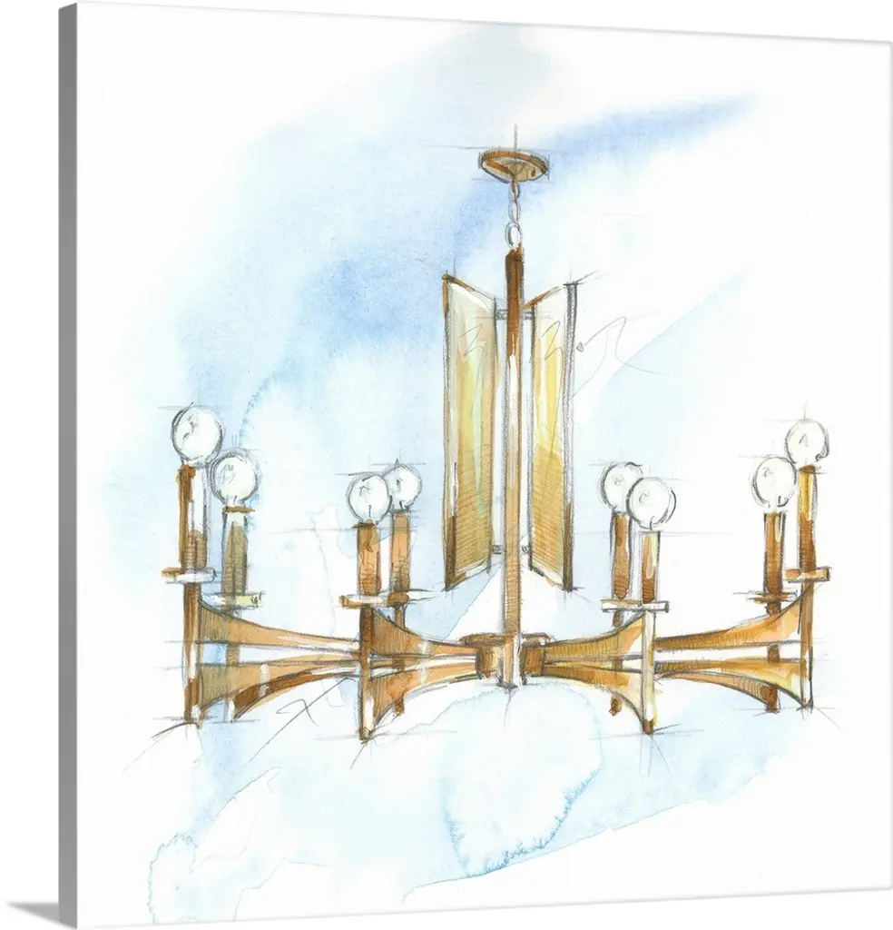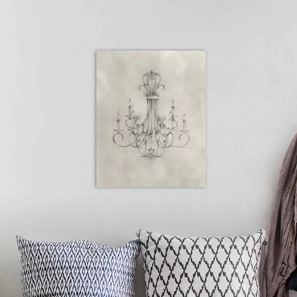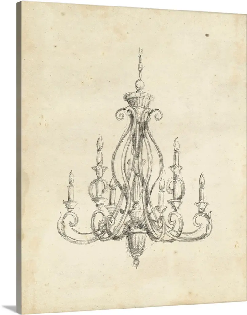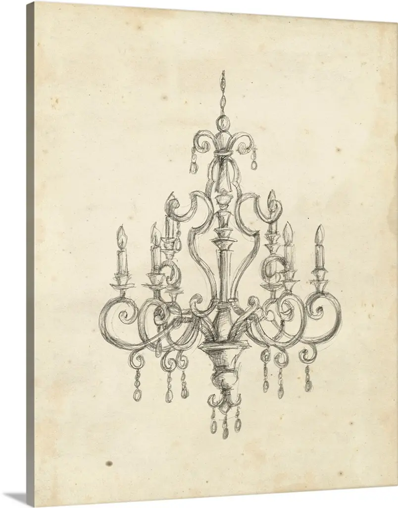 This artwork features a drawing of a decorative chandelier with framework lines and cross hatching against a mottled background.