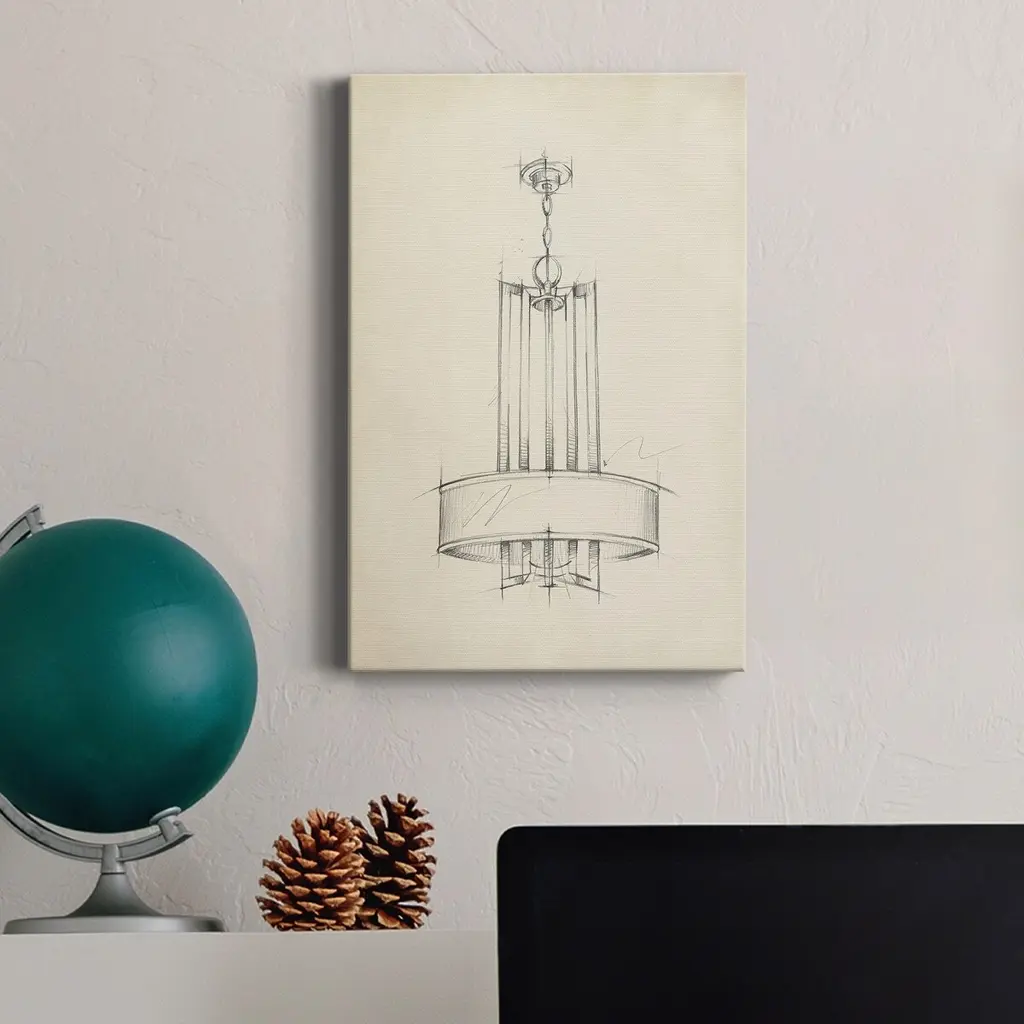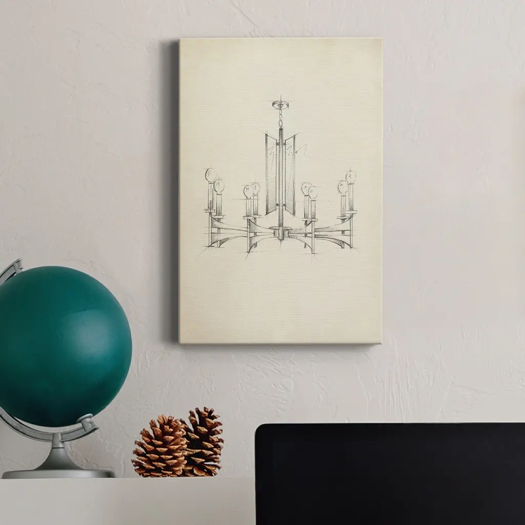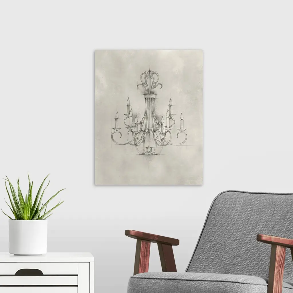 This artwork features a drawing of a decorative chandelier with framework lines and cross hatching against a mottled background.