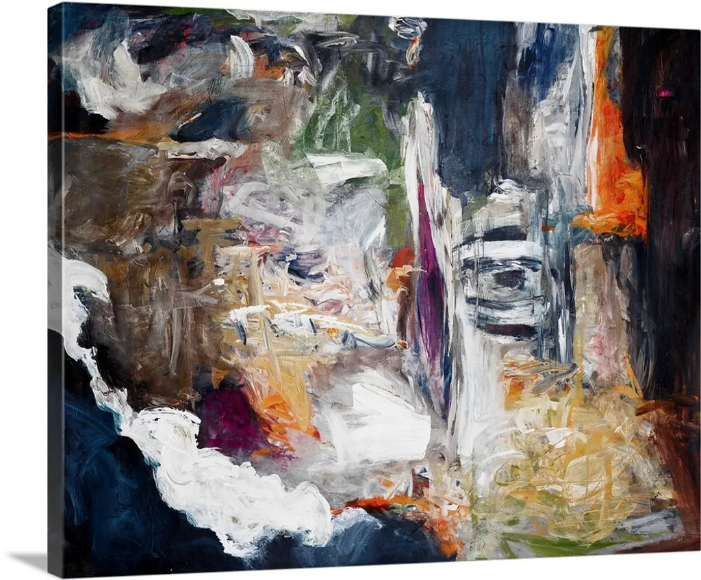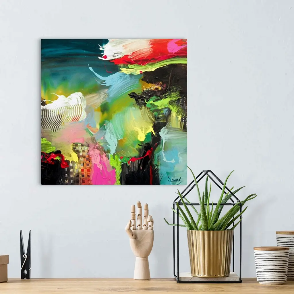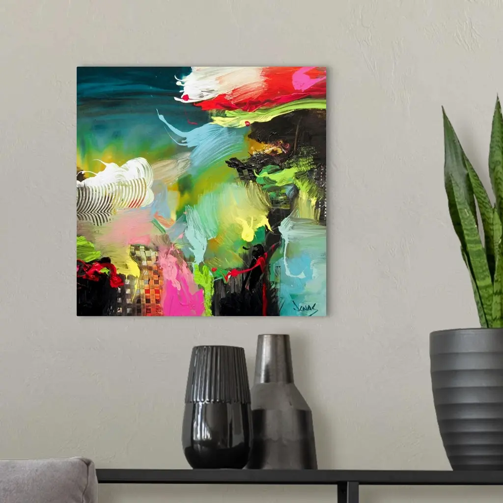 This square abstract artwork was created by a contemporary artist and uses a variety of brushstrokes and textures to create depth in this painting and uses a dark color palette accented with splashes of neon.
