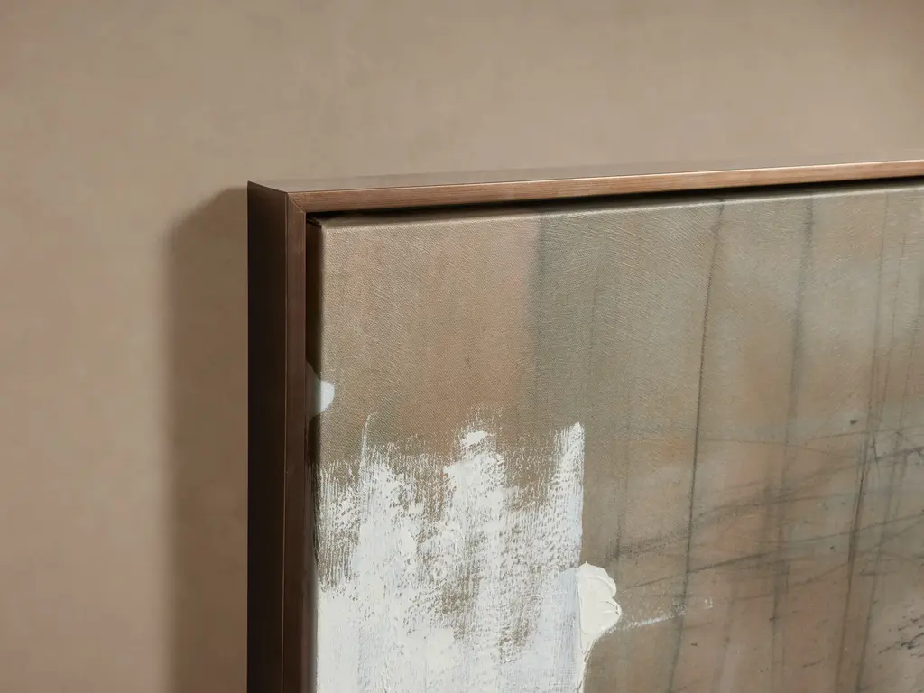 Thought-provoking and mysterious, this abstract featuring a variety of neutral tones balances negative space with use of shadows and depth. Primarily self-taught artist David Erickson explores themes of memory and place, capturing fleeting moments through abstraction using layers of transparency and the unpredictable nature of water-based mediums. Gallery-wrapped print on canvas with hand-applied acrylic gel details. Wood frame features an antiqued gold finish. Hangs vertically or horizontally from back-mounted D-rings. Hanging hardware not included. Artist: David Erickson