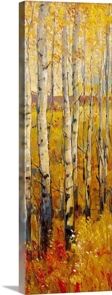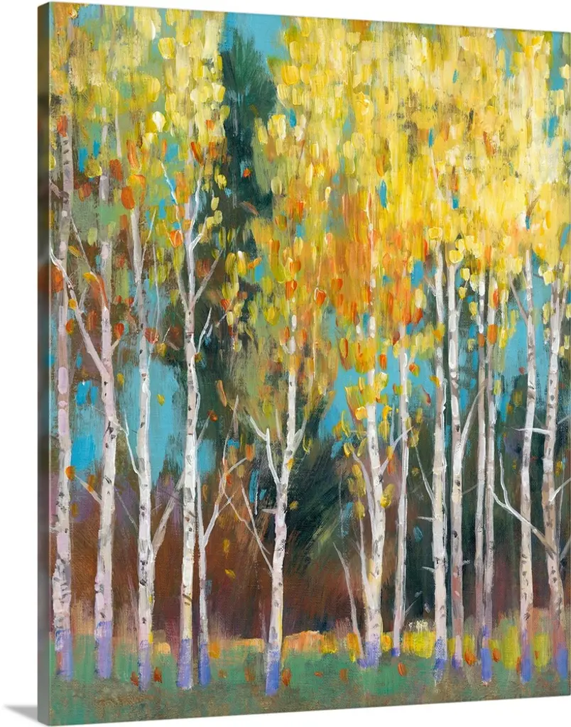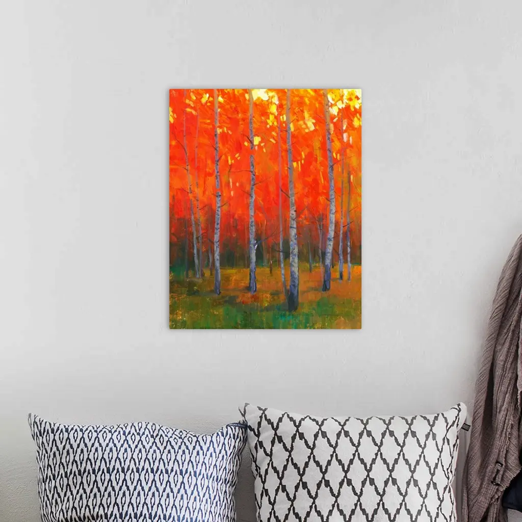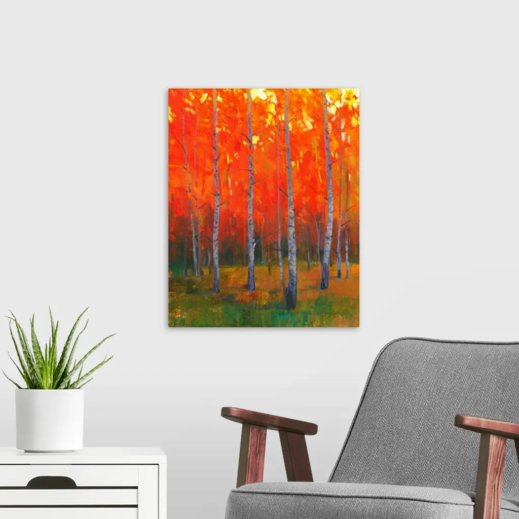 Contemporary painting of a forest of thin trees with leaves glowing in the sunset light in the fall.