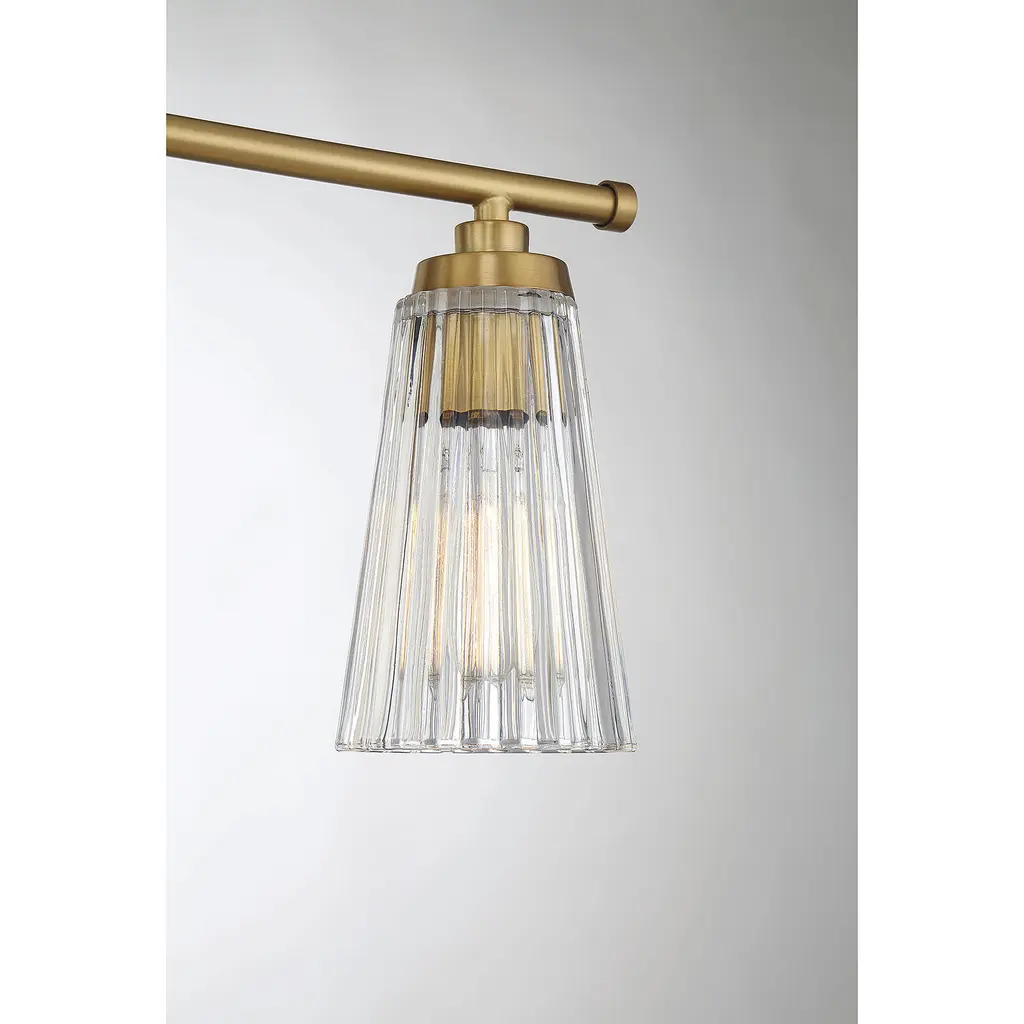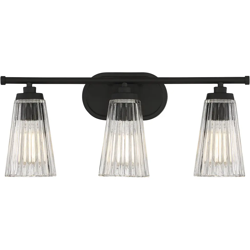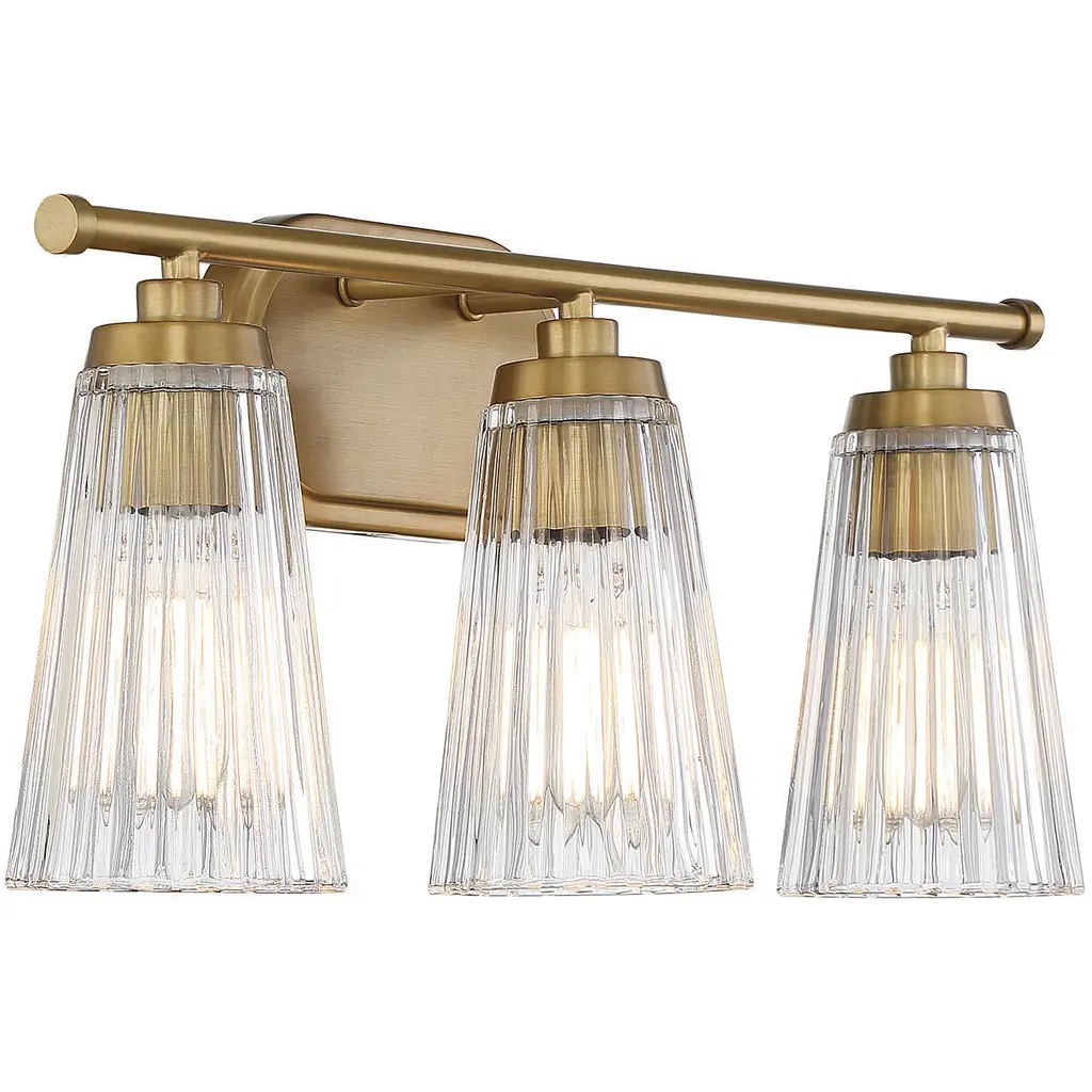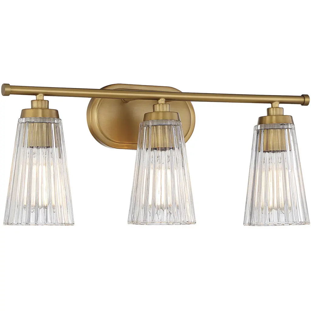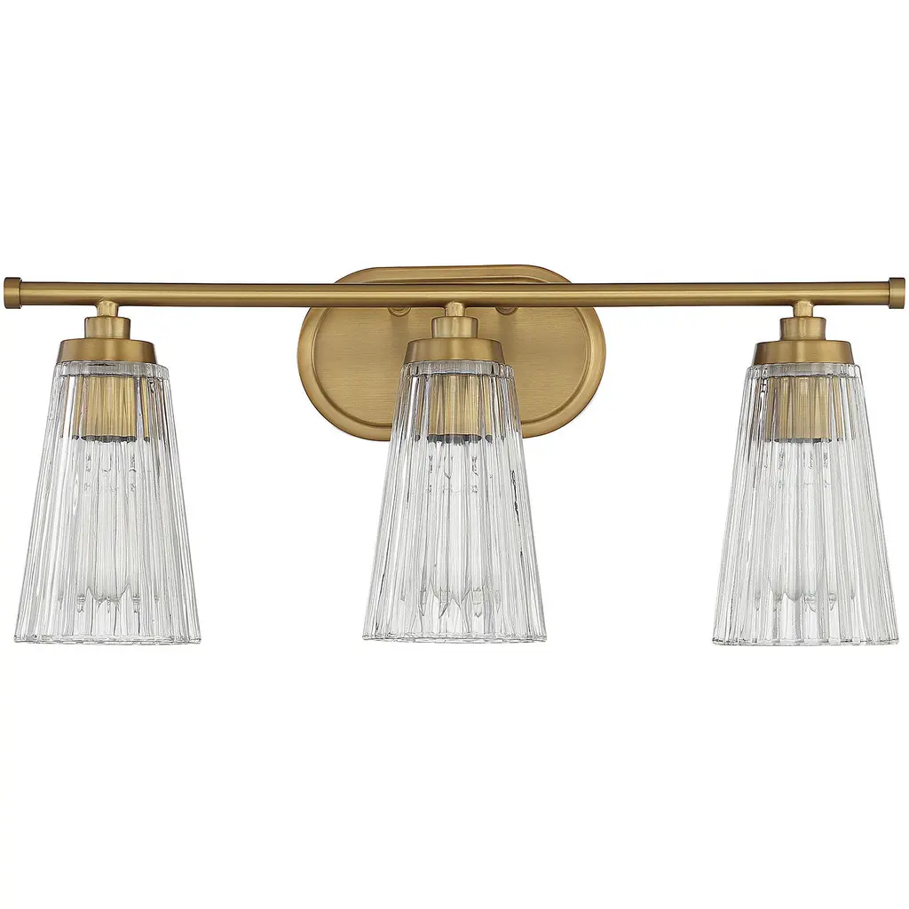Textured, eye-catching shades of clear ribbed glass take center stage in the Chantilly 3-light bathroom vanity light from Savoy House. Finished in warm brass. Chantilly is 10" in height and 22" in width. It extends 7" from the wall. Uses three standard size bulbs of up to 60 watts per bulb. Damp area rated.