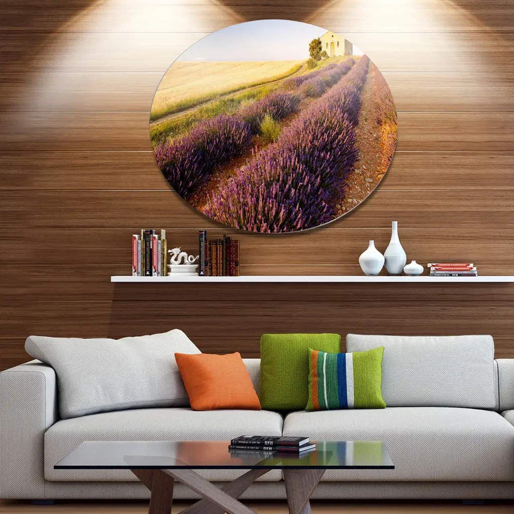 Bring Contemporary Abstraction to your home with this large Circle Metal wall art. This Chapel with Lavender and Grain Field Metal Artwork makes it the focal point of any room or office. - White Gloss Coating ensures colors are extra vibrant with light reflection.- Aluminum grade Sheet Metal with 1 inch mounting frame on the back giving the illusion that the artwork is floating on the wall..- Mounting Brackets are included along with instructions.- High Quality Digital images are created directly into a glossy aluminum panel producing a stunning and captivating print into the glossy finish of the metal.- Water, Fire and Scratch resistant HD Aluminum panels.- Looks better than any photo paper and guaranteed to last at least 20 years- Easy to clean with a microfiber cloth. Colors are far superior to regular Canvas Art. - Easy to Hang
