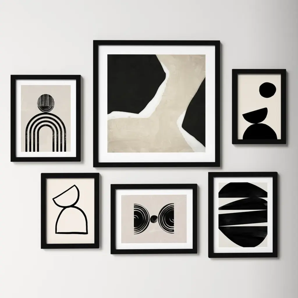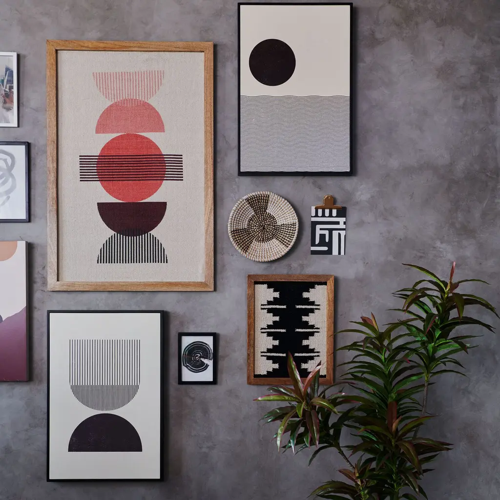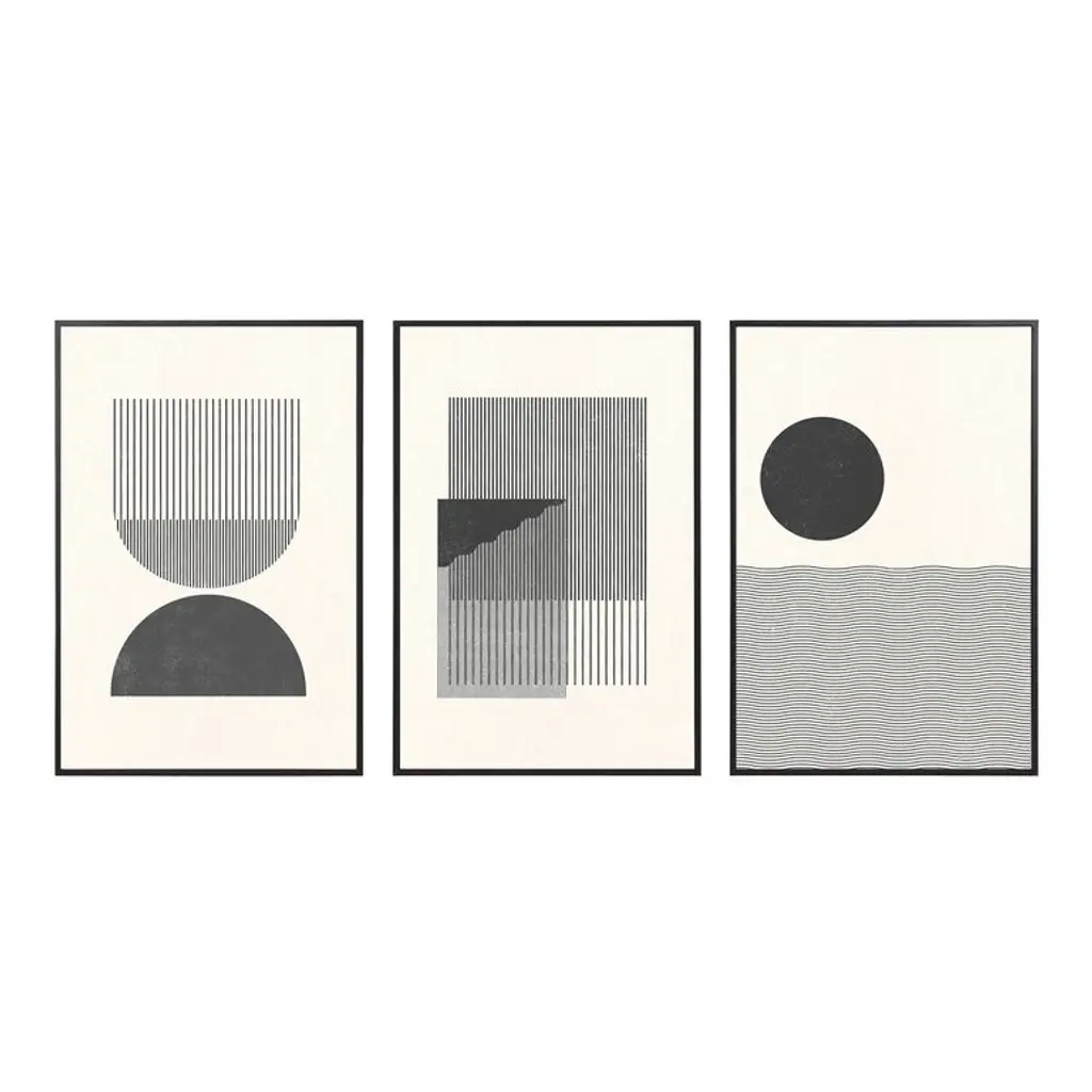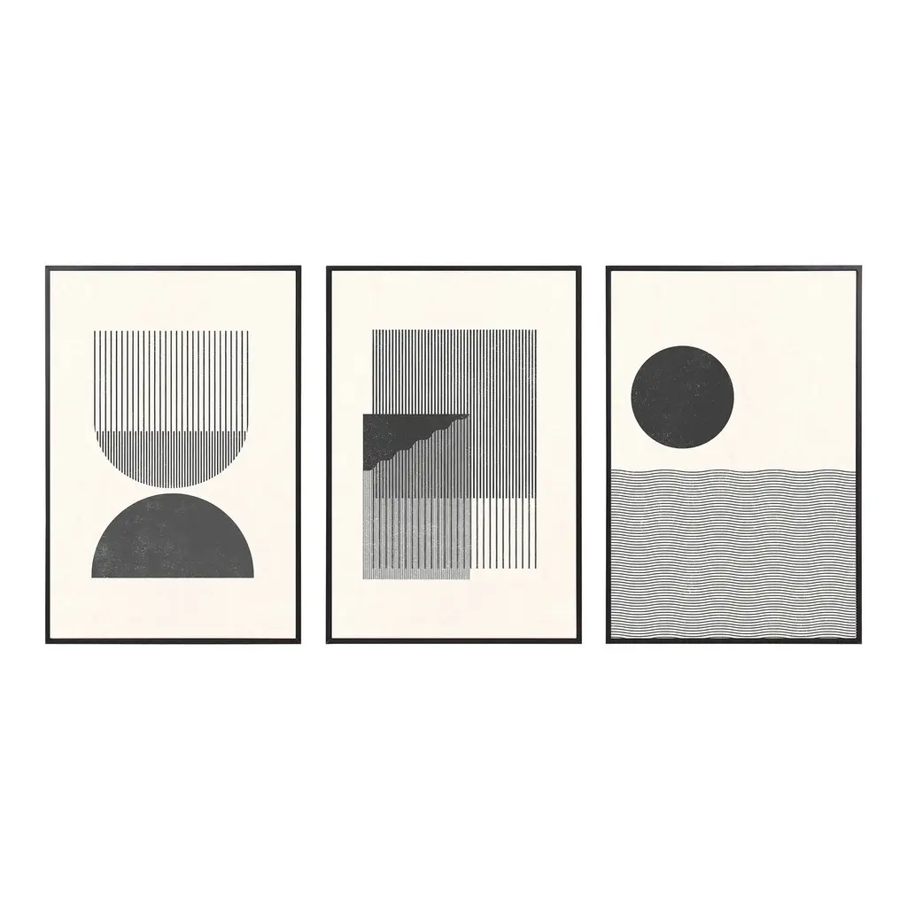 A sleek palette of dark charcoal and cream makes our exclusive retro-inspired wall art set a bold, distinguished home decor choice. Framed in coordinating black-finished wood and ready to hang, this abstract wall decor has unique geometrics that allow each piece to be left up to the interpretation of its viewer.