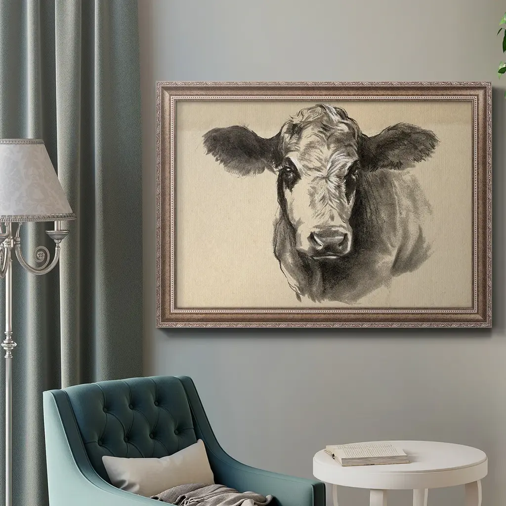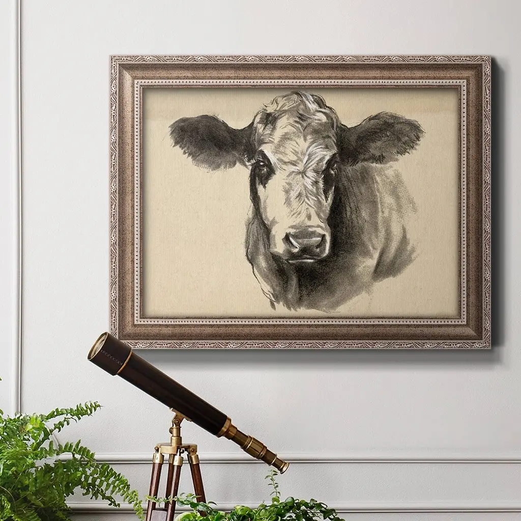 Charcoal Cow I Premium Framed Canvas- Ready to Hang A Premium Framed Canvas created to last. Framed in distressed wood and available in an array of sizes and colors Featuring a beveled a solid wood stretcher bar, each piece comes ready to hand 3 SIZES AVAILABLE 16''X20'' - Overall Size 18'X27'' - Overall Size 24''x36'' - Overall Size Each piece is made to order. Each piece comes with hanging hardware. Made in the USA Ready to Hang Giclee Paper Print Acrylic Glass Beveled Matt Board