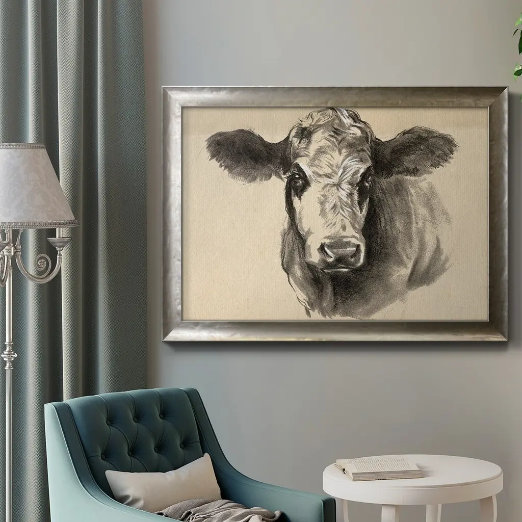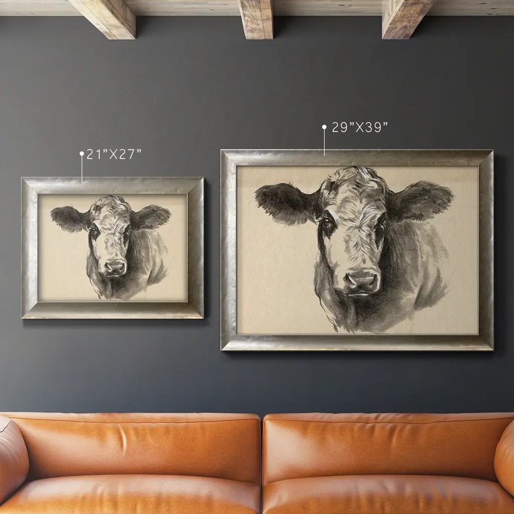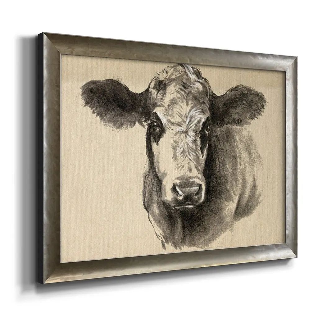 Charcoal Cow I Premium Framed Canvas- Ready to Hang A Premium Framed Canvas created to last. Framed in distressed wood and available in an array of sizes and colors Featuring a beveled a solid wood stretcher bar, each piece comes ready to hand 3 SIZES AVAILABLE 16''X20'' - Overall Size 18'X27'' - Overall Size 24''x36'' - Overall Size Each piece is made to order. Each piece comes with hanging hardware. Made in the USA Ready to Hang Giclee Paper Print Acrylic Glass Beveled Matt Board