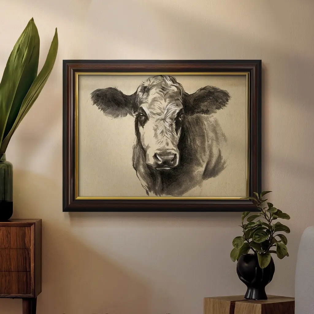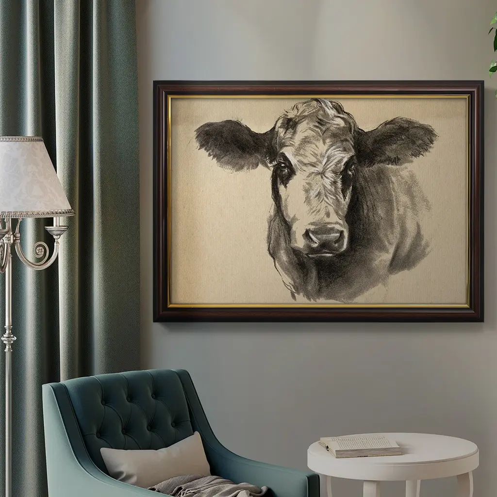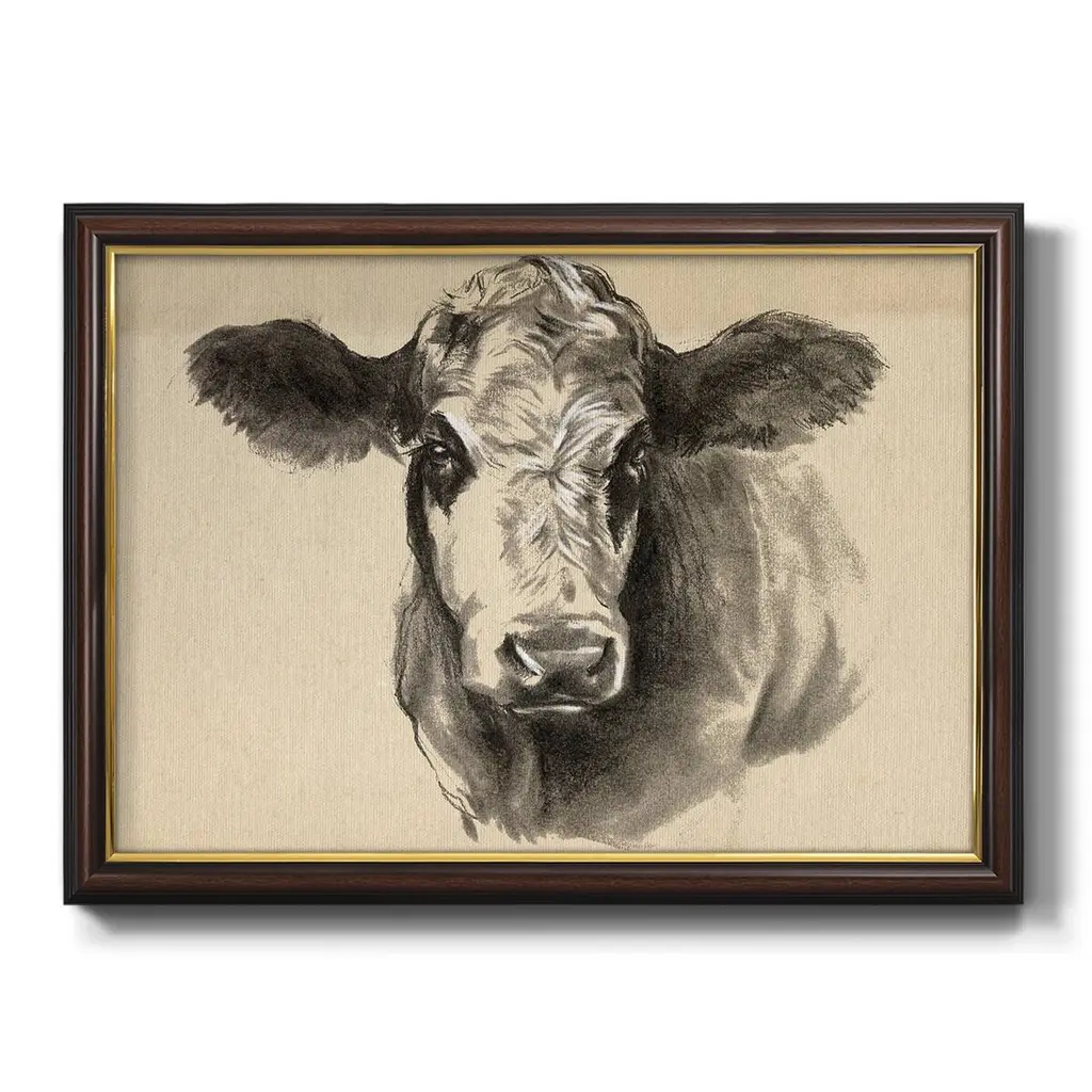 Charcoal Cow I Premium Framed Canvas- Ready to Hang A Premium Framed Canvas created to last. Framed in distressed wood and available in an array of sizes and colors Featuring a beveled a solid wood stretcher bar, each piece comes ready to hand 3 SIZES AVAILABLE 16''X20'' - Overall Size 18'X27'' - Overall Size 24''x36'' - Overall Size Each piece is made to order. Each piece comes with hanging hardware. Made in the USA Ready to Hang Giclee Paper Print Acrylic Glass Beveled Matt Board