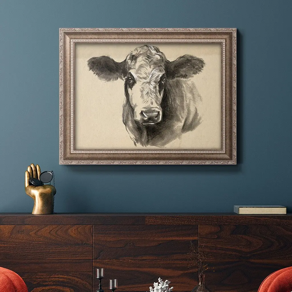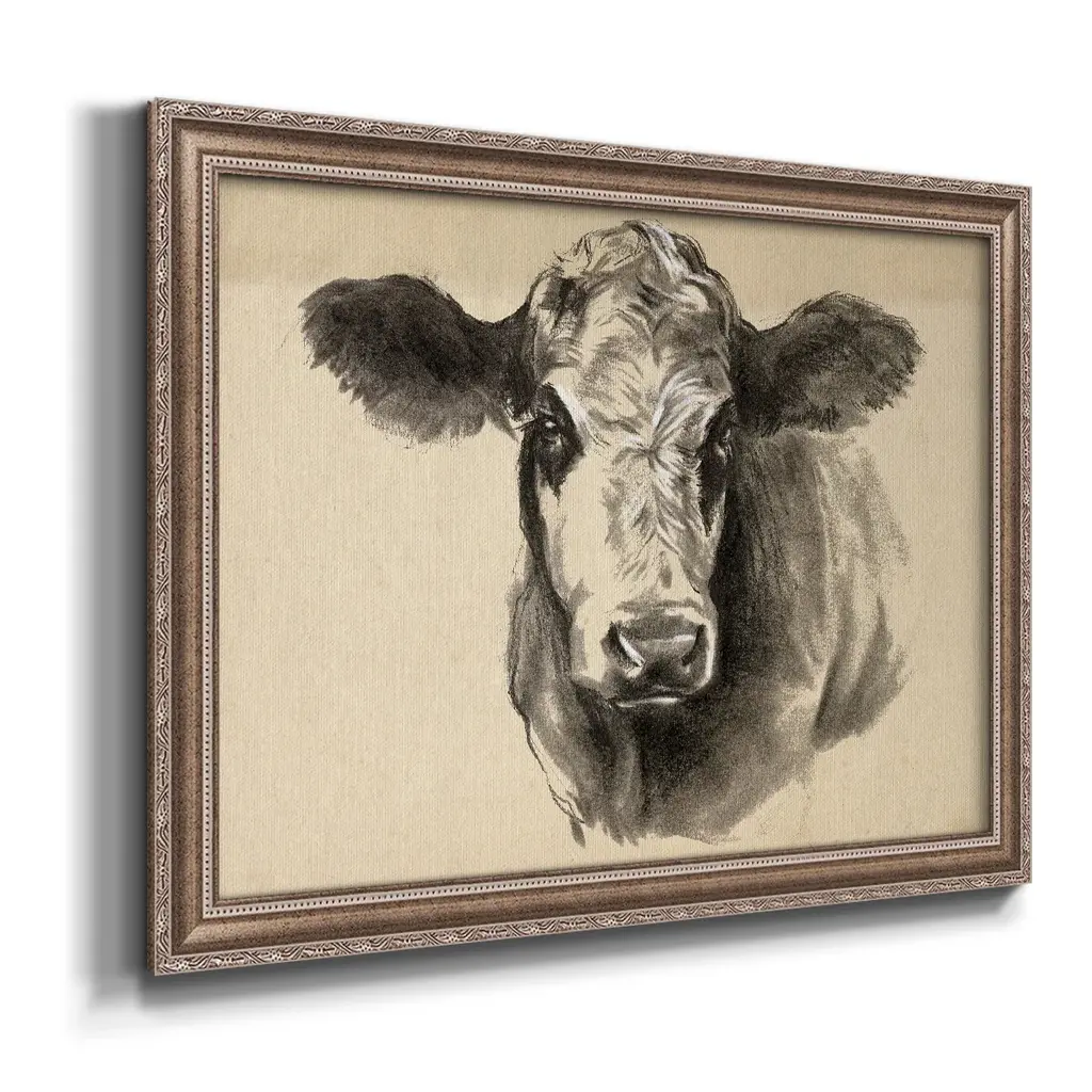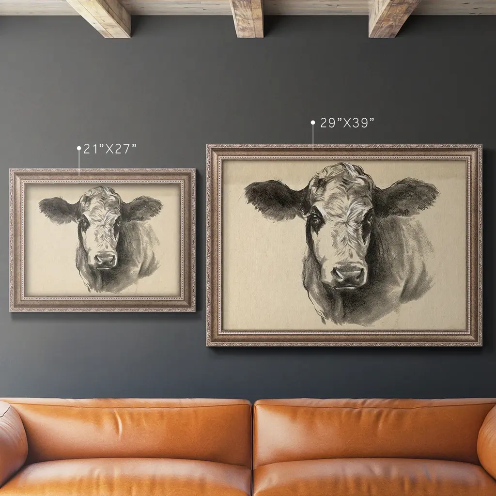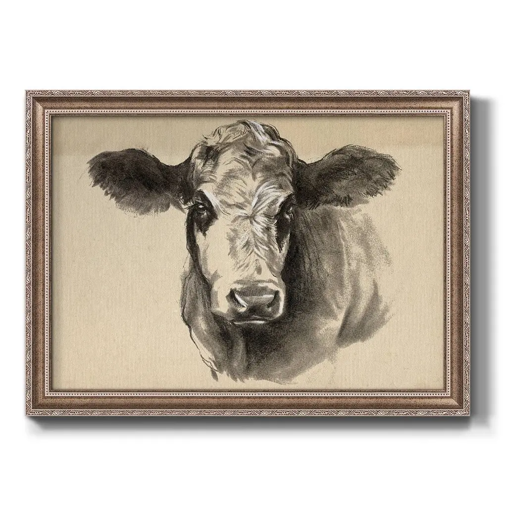 Charcoal Cow I Premium Framed Canvas- Ready to Hang A Premium Framed Canvas created to last. Framed in distressed wood and available in an array of sizes and colors Featuring a beveled a solid wood stretcher bar, each piece comes ready to hand 3 SIZES AVAILABLE 16''X20'' - Overall Size 18'X27'' - Overall Size 24''x36'' - Overall Size Each piece is made to order. Each piece comes with hanging hardware. Made in the USA Ready to Hang Giclee Paper Print Acrylic Glass Beveled Matt Board