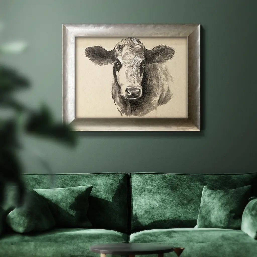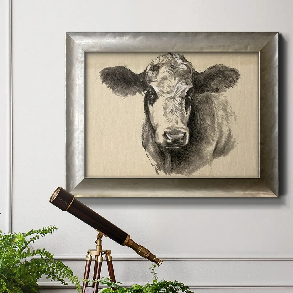Charcoal Cow I Premium Framed Canvas- Ready to Hang A Premium Framed Canvas created to last. Framed in distressed wood and available in an array of sizes and colors Featuring a beveled a solid wood stretcher bar, each piece comes ready to hand 3 SIZES AVAILABLE 16''X20'' - Overall Size 18'X27'' - Overall Size 24''x36'' - Overall Size Each piece is made to order. Each piece comes with hanging hardware. Made in the USA Ready to Hang Giclee Paper Print Acrylic Glass Beveled Matt Board