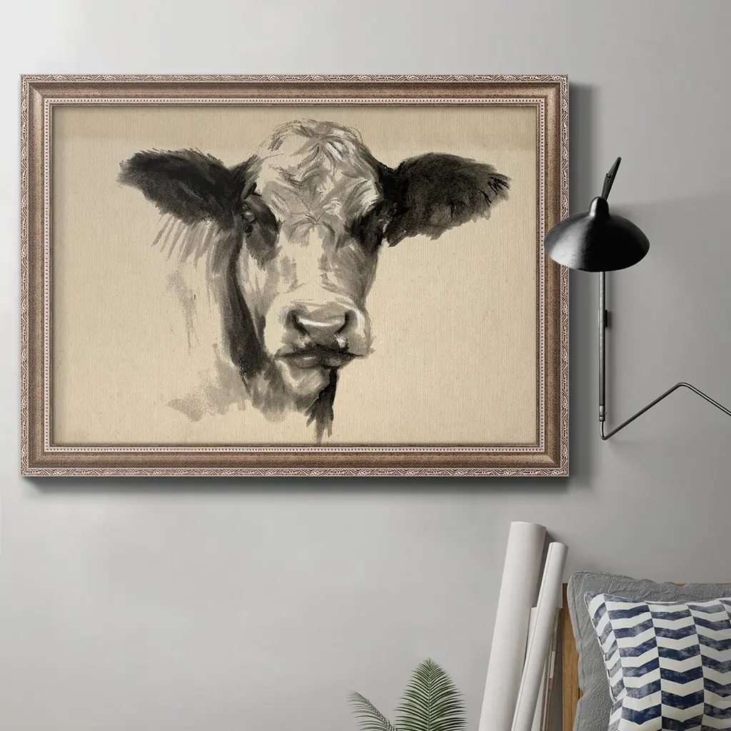 Charcoal Cow II Premium Framed Canvas- Ready to Hang A Premium Framed Canvas created to last. Framed in distressed wood and available in an array of sizes and colors Featuring a beveled a solid wood stretcher bar, each piece comes ready to hand 3 SIZES AVAILABLE 16''X20'' - Overall Size 18'X27'' - Overall Size 24''x36'' - Overall Size Each piece is made to order. Each piece comes with hanging hardware. Made in the USA Ready to Hang Giclee Paper Print Acrylic Glass Beveled Matt Board