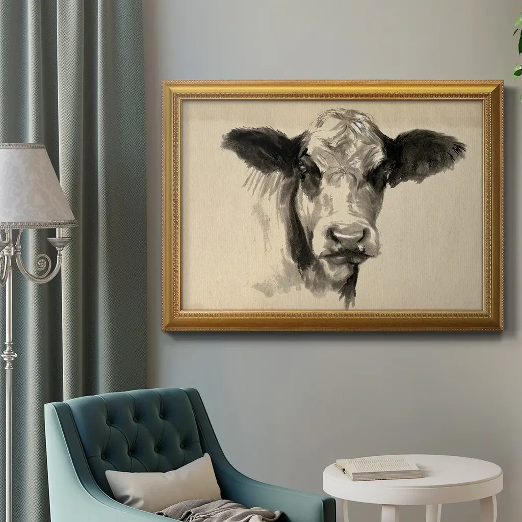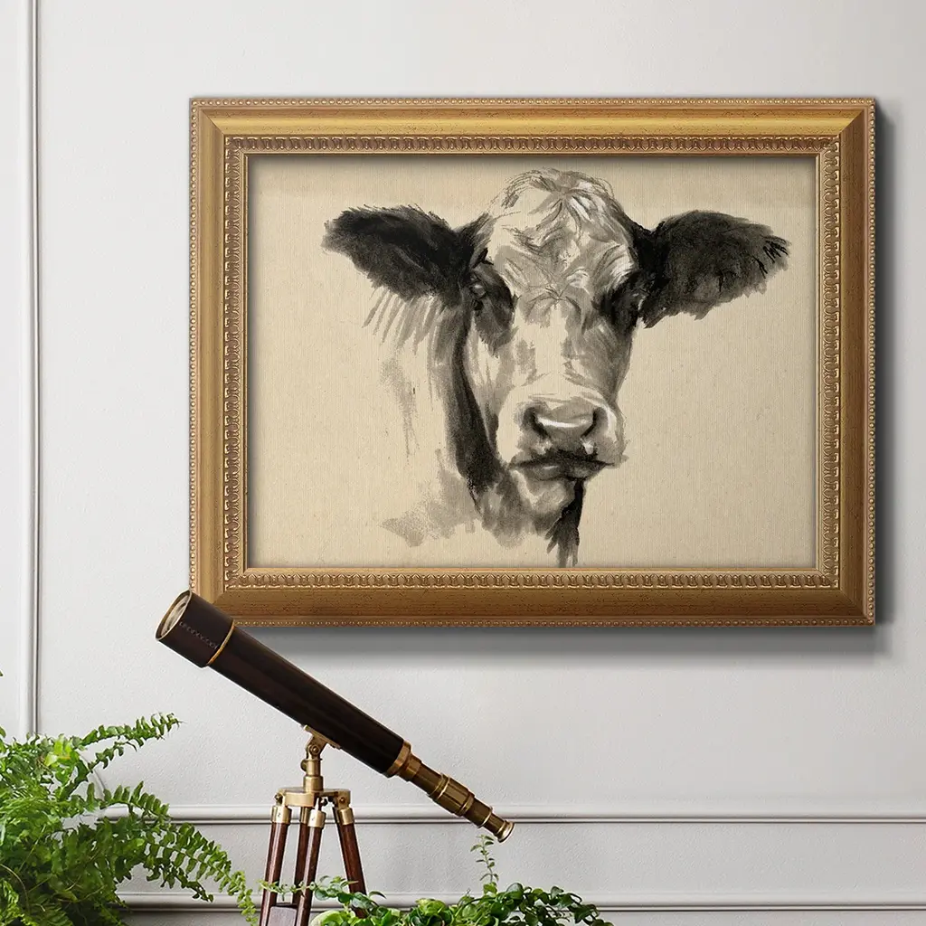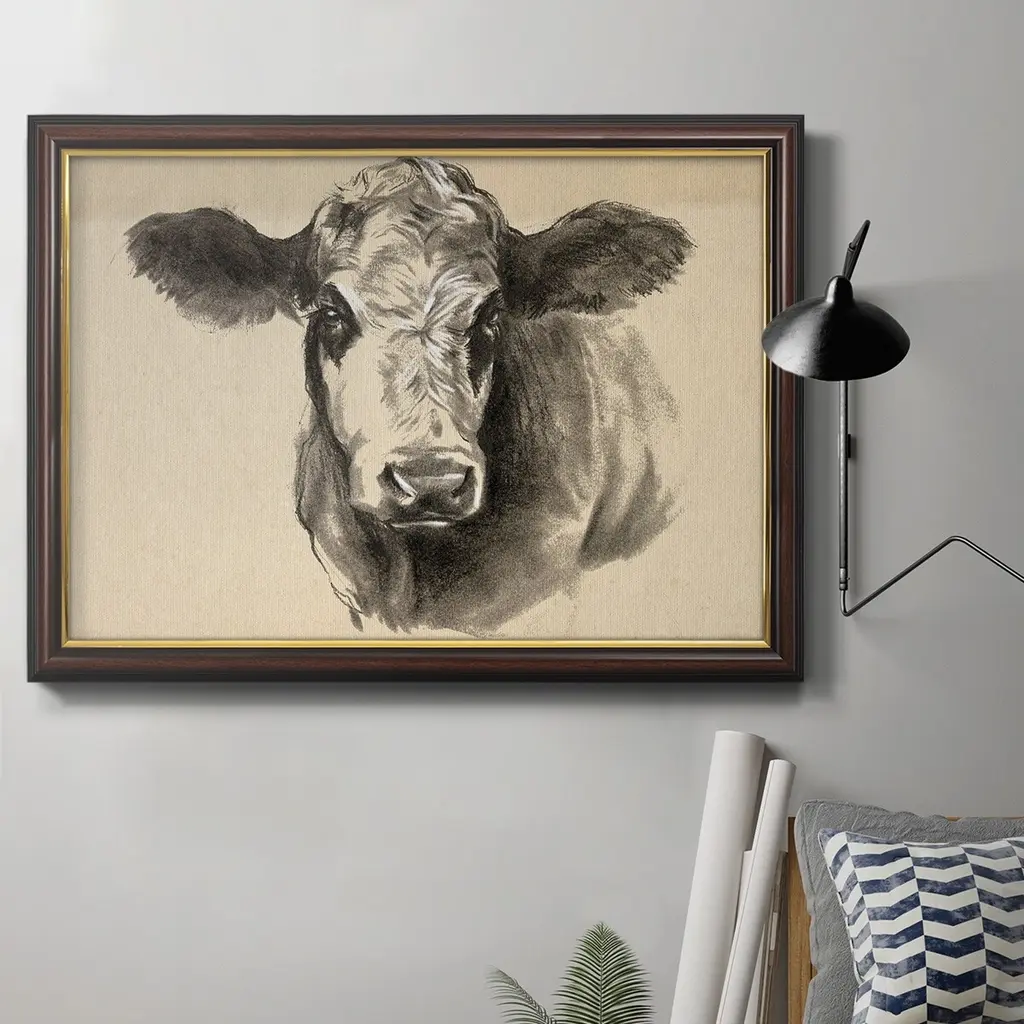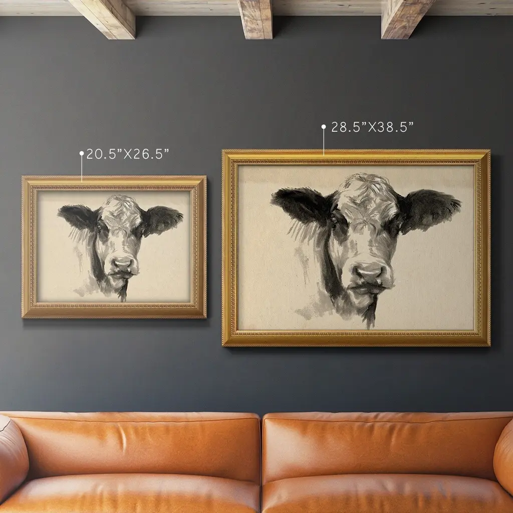 Charcoal Cow II Premium Framed Canvas- Ready to Hang A Premium Framed Canvas created to last. Framed in distressed wood and available in an array of sizes and colors Featuring a beveled a solid wood stretcher bar, each piece comes ready to hand 3 SIZES AVAILABLE 16''X20'' - Overall Size 18'X27'' - Overall Size 24''x36'' - Overall Size Each piece is made to order. Each piece comes with hanging hardware. Made in the USA Ready to Hang Giclee Paper Print Acrylic Glass Beveled Matt Board