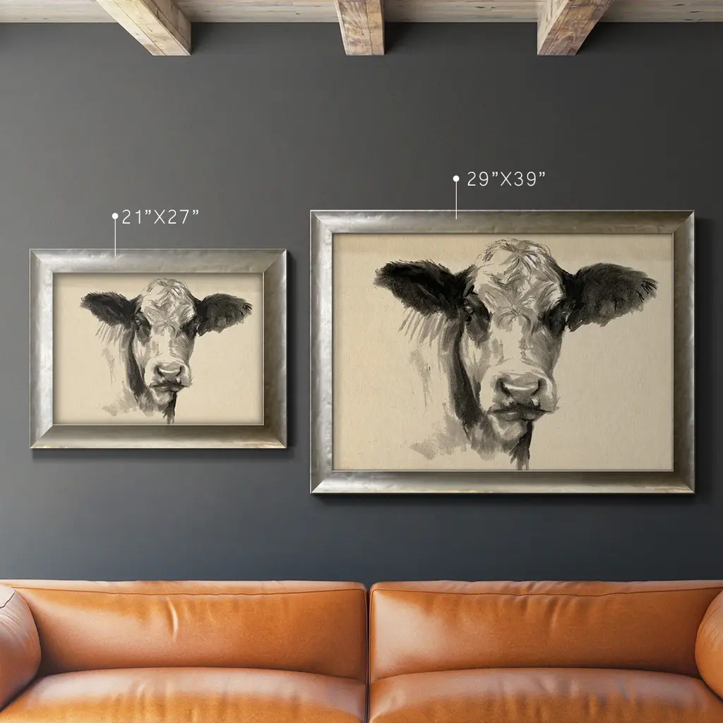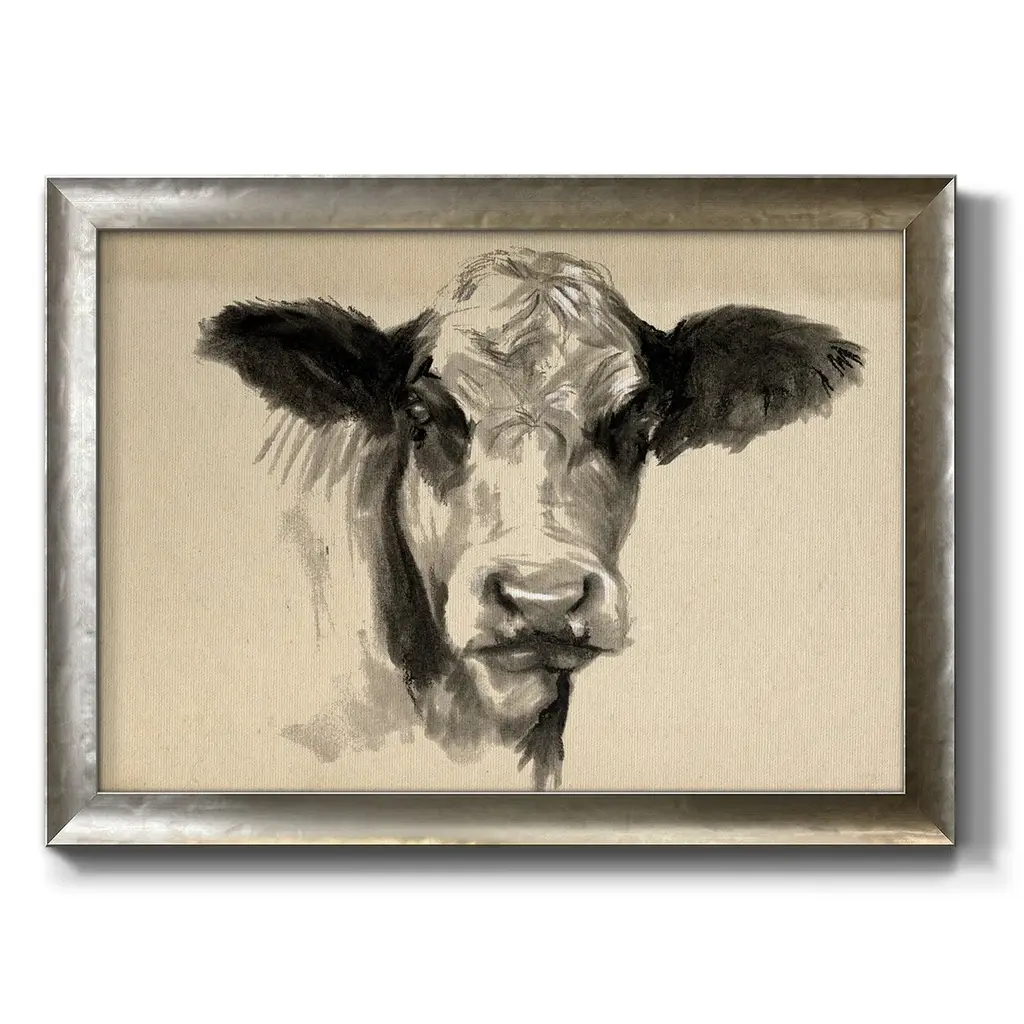 Charcoal Cow II Premium Framed Canvas- Ready to Hang A Premium Framed Canvas created to last. Framed in distressed wood and available in an array of sizes and colors Featuring a beveled a solid wood stretcher bar, each piece comes ready to hand 3 SIZES AVAILABLE 16''X20'' - Overall Size 18'X27'' - Overall Size 24''x36'' - Overall Size Each piece is made to order. Each piece comes with hanging hardware. Made in the USA Ready to Hang Giclee Paper Print Acrylic Glass Beveled Matt Board