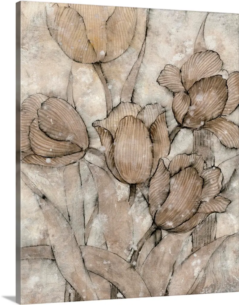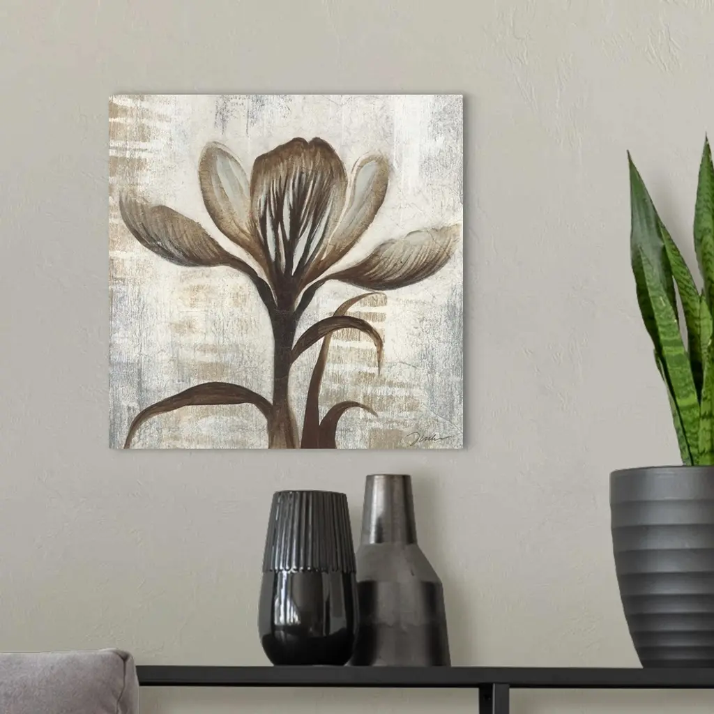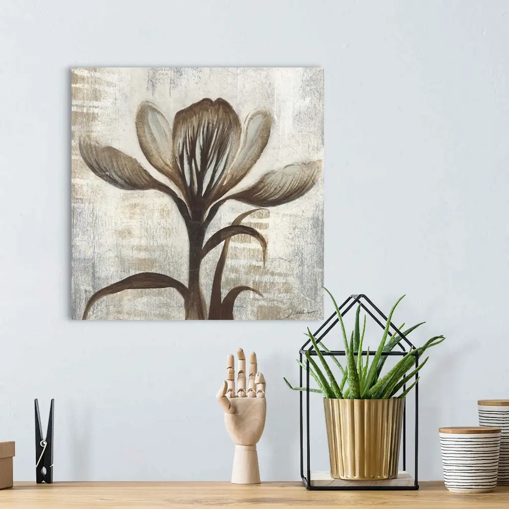 A decorative square painting of a flower in brown and gray tones with small metallic speckles throughout in the image.