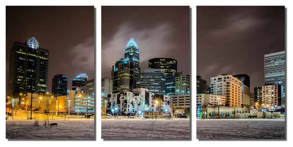 72"œ x 36"œ total size. Ready To Hang! (3 pieces - 24"œ x 36"œ each). 3 Panel Split (Triptych) Metal Print of Charlotte, NC Skyline at night, after winter snow. Modern metal wall art for home or office wall decor & interior design. Printed on Luxurious, HD aluminum glossy metal panels. Multi panel art.. HD aluminum panels. Metal print wall art. Includes Shadow Wall Mount on the back.• Aluminum Metal Wall Art• Made in USA• Ready to hang - No assembly required• Shadow mount hardware on the back• 0.045"œ thick HD Aluminum Panels• Scratch resistant, glossy finish• Superb color clarity, luxurious prints• Epson printing process• For indoor or moisture rich environment use• Easy to clean. Gently wipe with microfiber cloth.