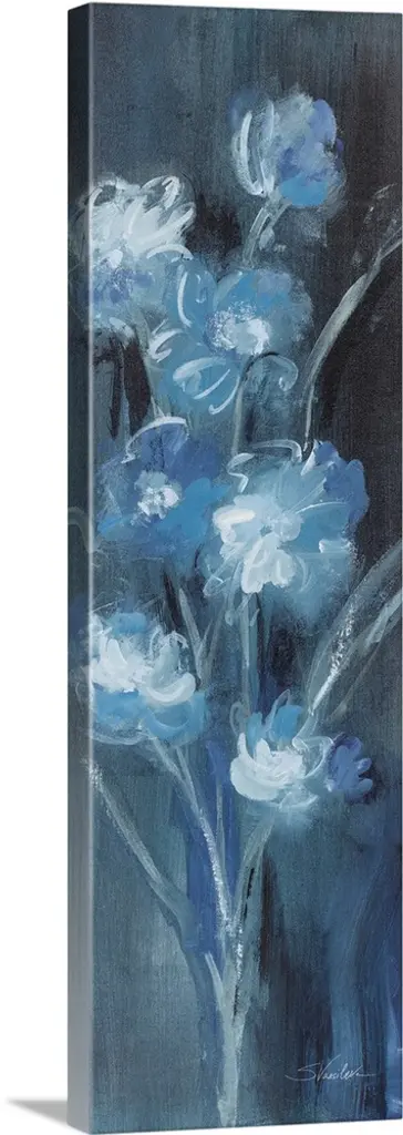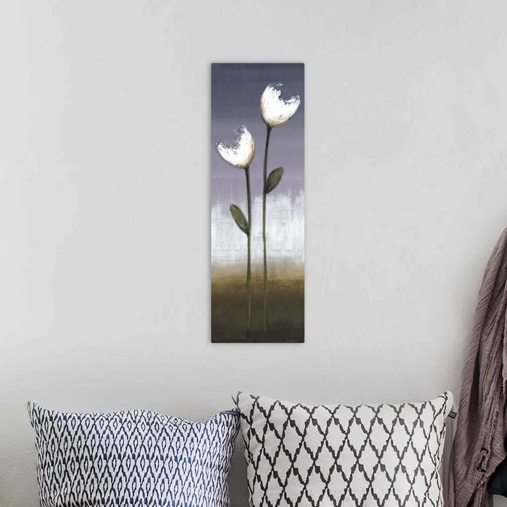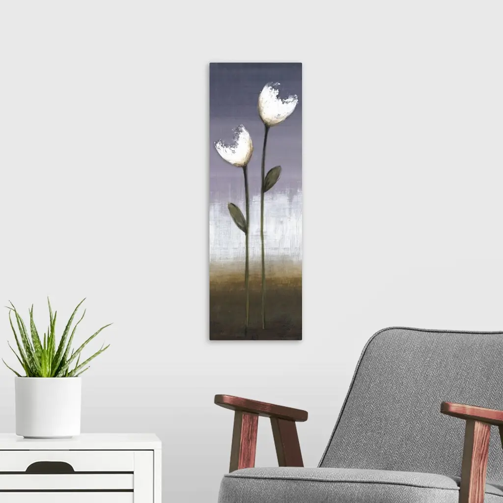 A long vertical painting of two white flowers on a long stem with a textured neutral background.