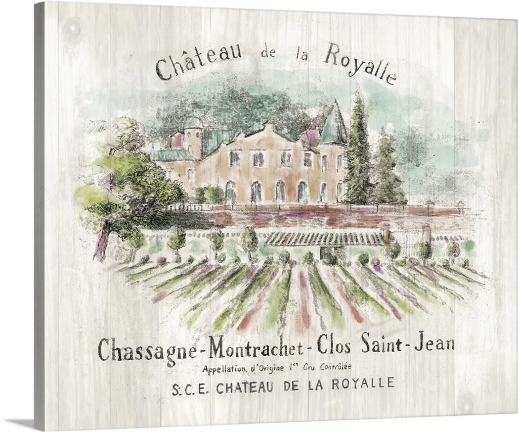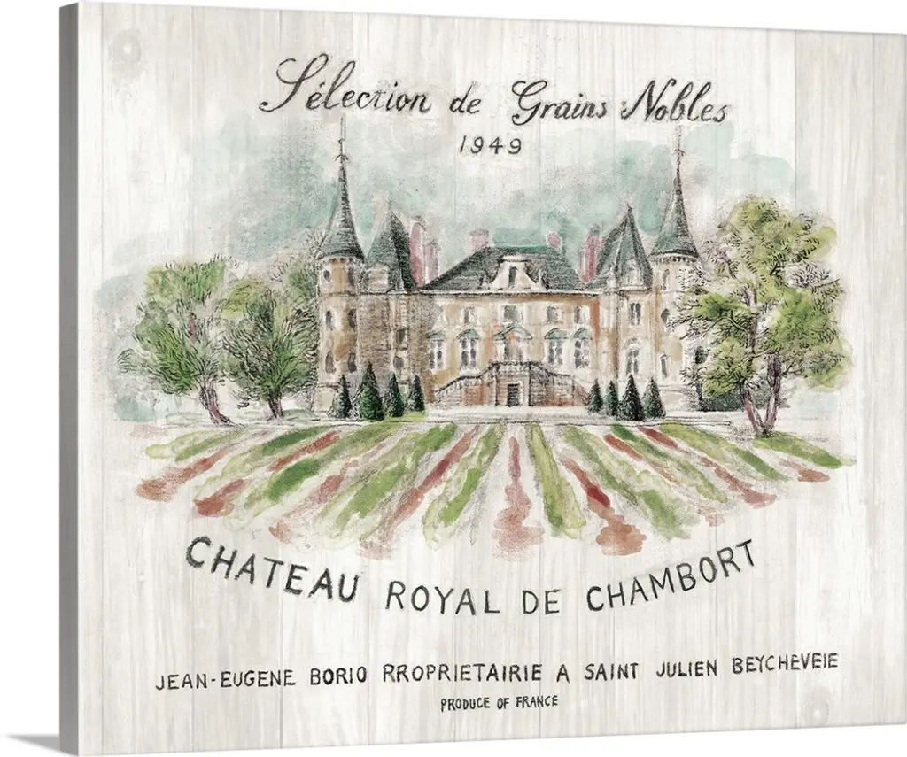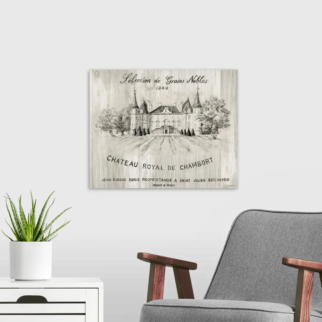 Gray and white sketch of the Chateau Royal De Chamborat vineyard on wood panels.