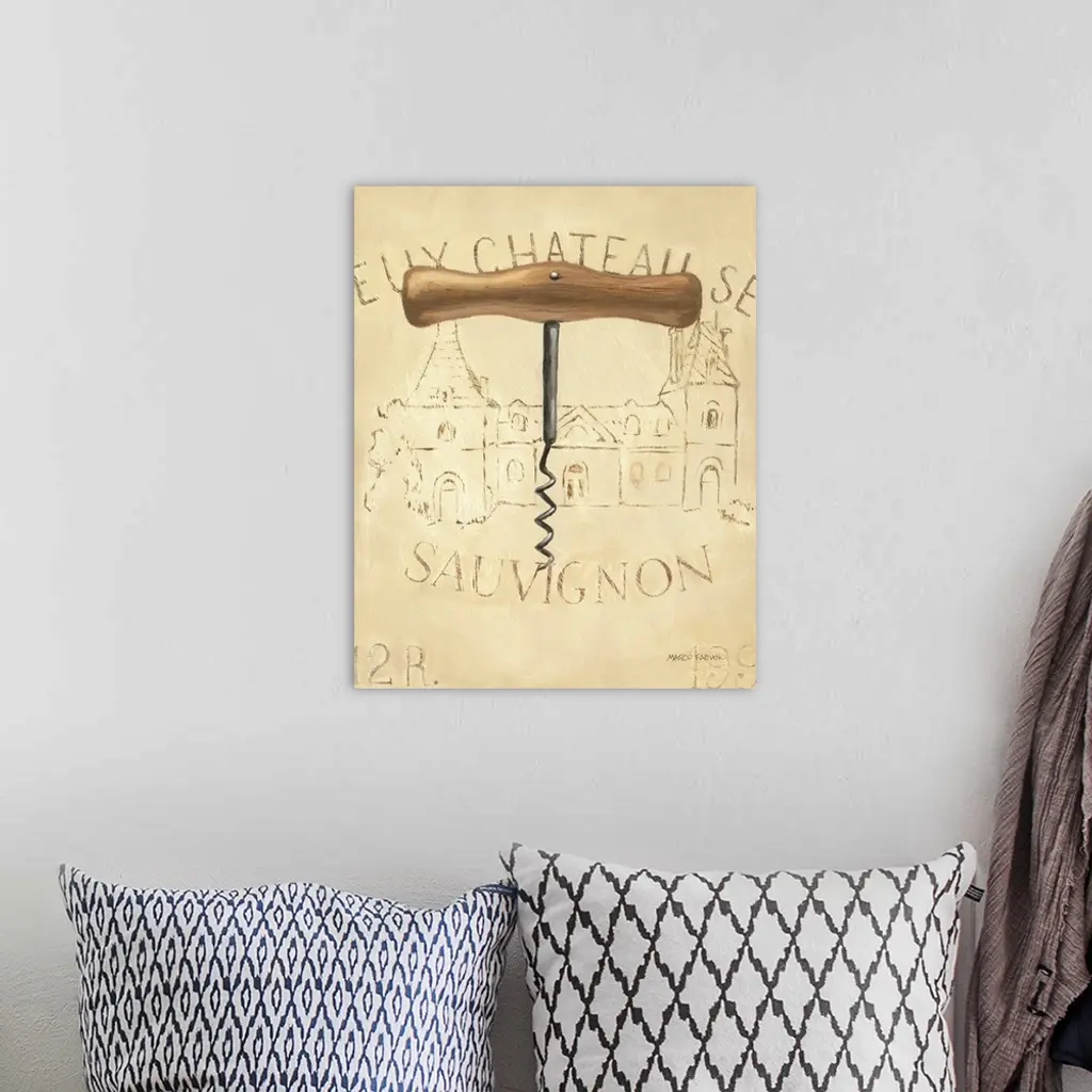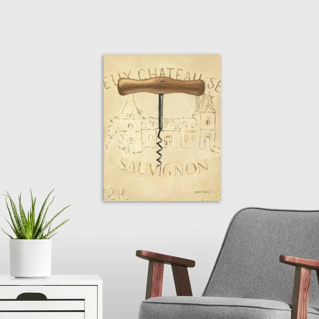 Contemporary artwork of an old fashioned traditional corkscrew against a beige background.