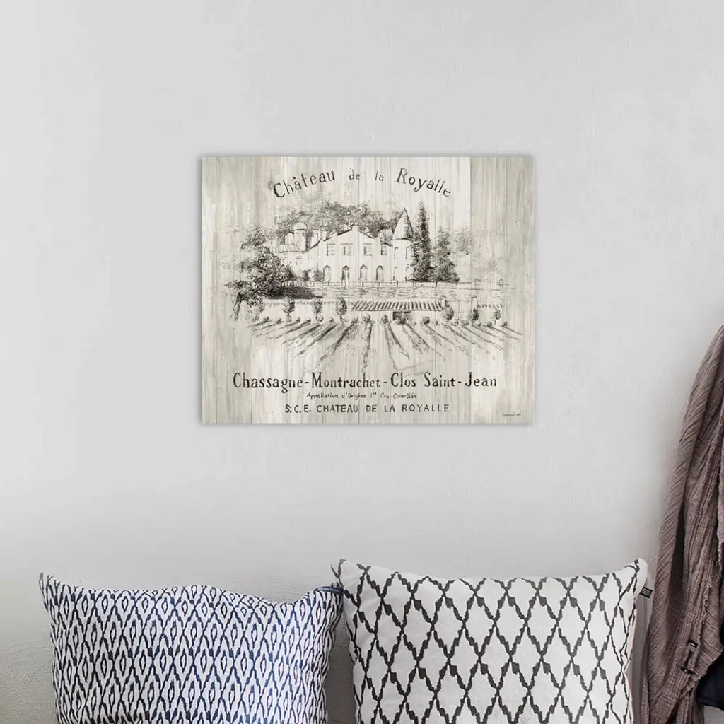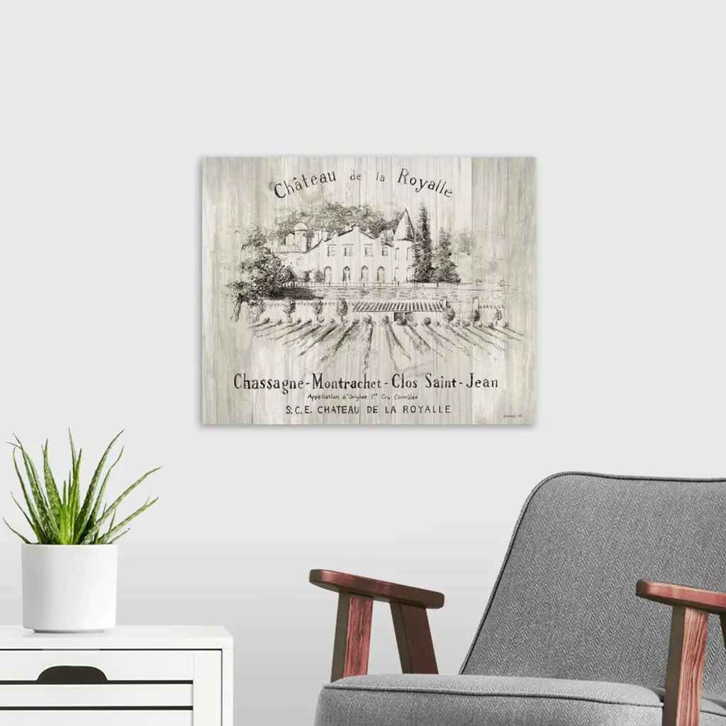Gray and white sketch of the Chateau Royalle vineyard on wood panels.