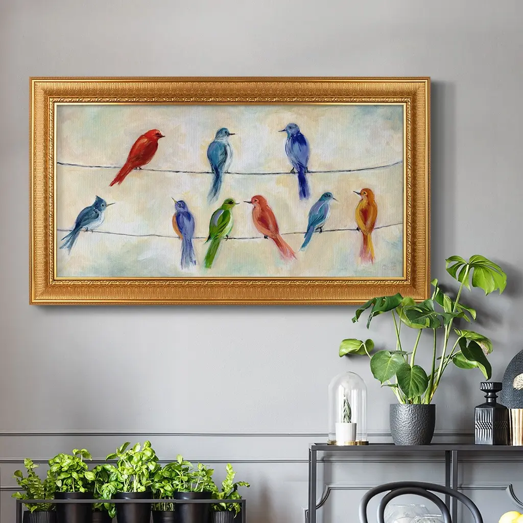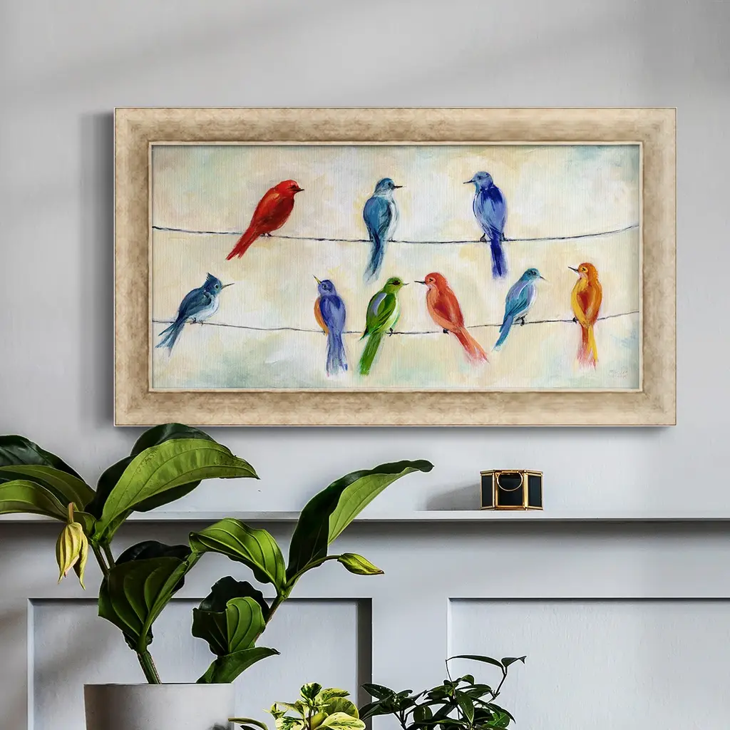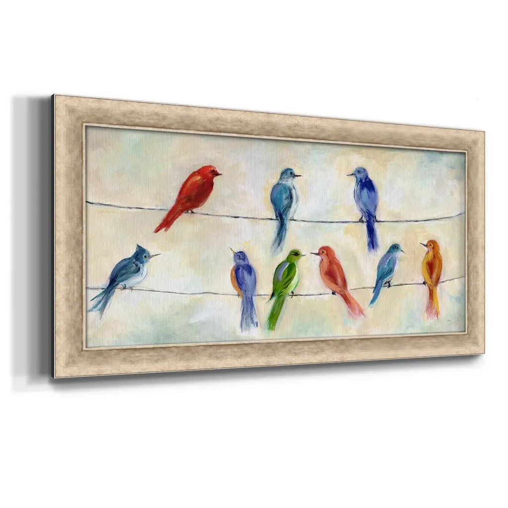 Chatter Premium Framed Canvas- Ready to Hang A Premium Framed Canvas created to last. Framed in distressed wood and available in an array of sizes and colors Featuring a beveled a solid wood stretcher bar, each piece comes ready to hand 3 SIZES AVAILABLE 21''X37'' - Overall Size 25''X45'' - Overall Size 29''x53'' - Overall Size Each piece is made to order. Each piece comes with hanging hardware. Made in the USA Ready to Hang Giclee Paper Print Acrylic Glass Beveled Matt Board