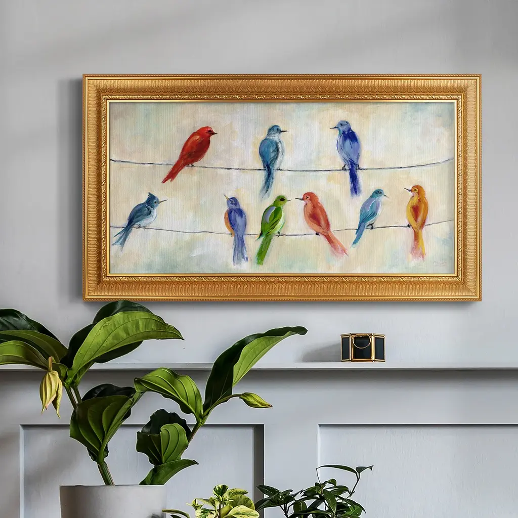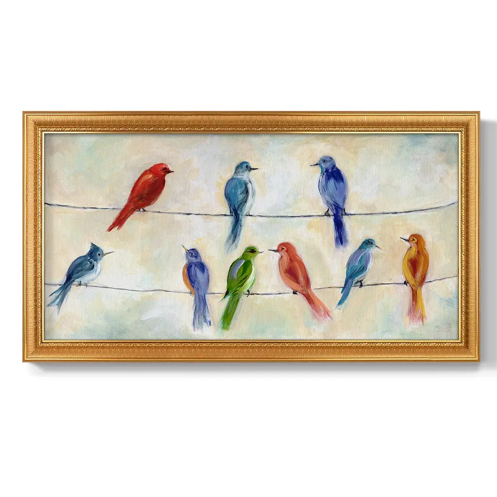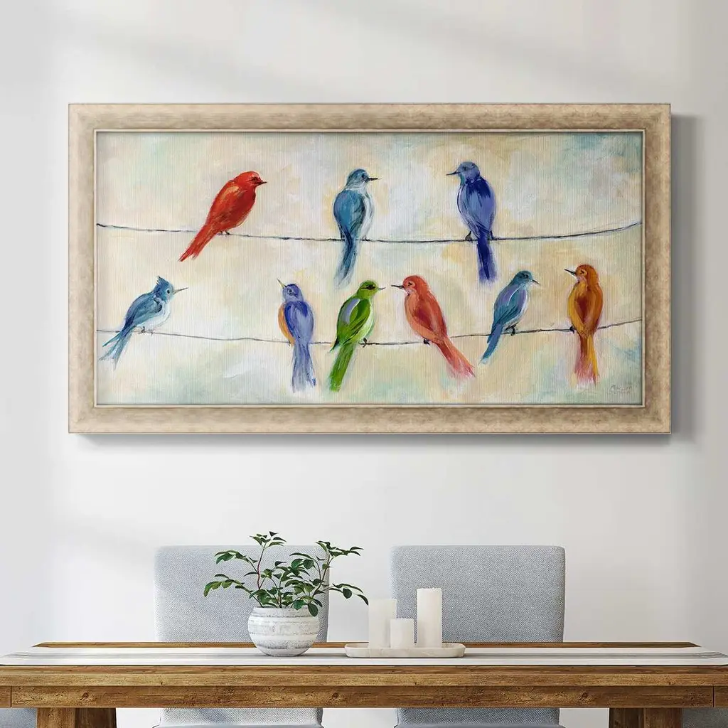 Chatter Premium Framed Canvas- Ready to Hang A Premium Framed Canvas created to last. Framed in distressed wood and available in an array of sizes and colors Featuring a beveled a solid wood stretcher bar, each piece comes ready to hand 3 SIZES AVAILABLE 21''X37'' - Overall Size 25''X45'' - Overall Size 29''x53'' - Overall Size Each piece is made to order. Each piece comes with hanging hardware. Made in the USA Ready to Hang Giclee Paper Print Acrylic Glass Beveled Matt Board