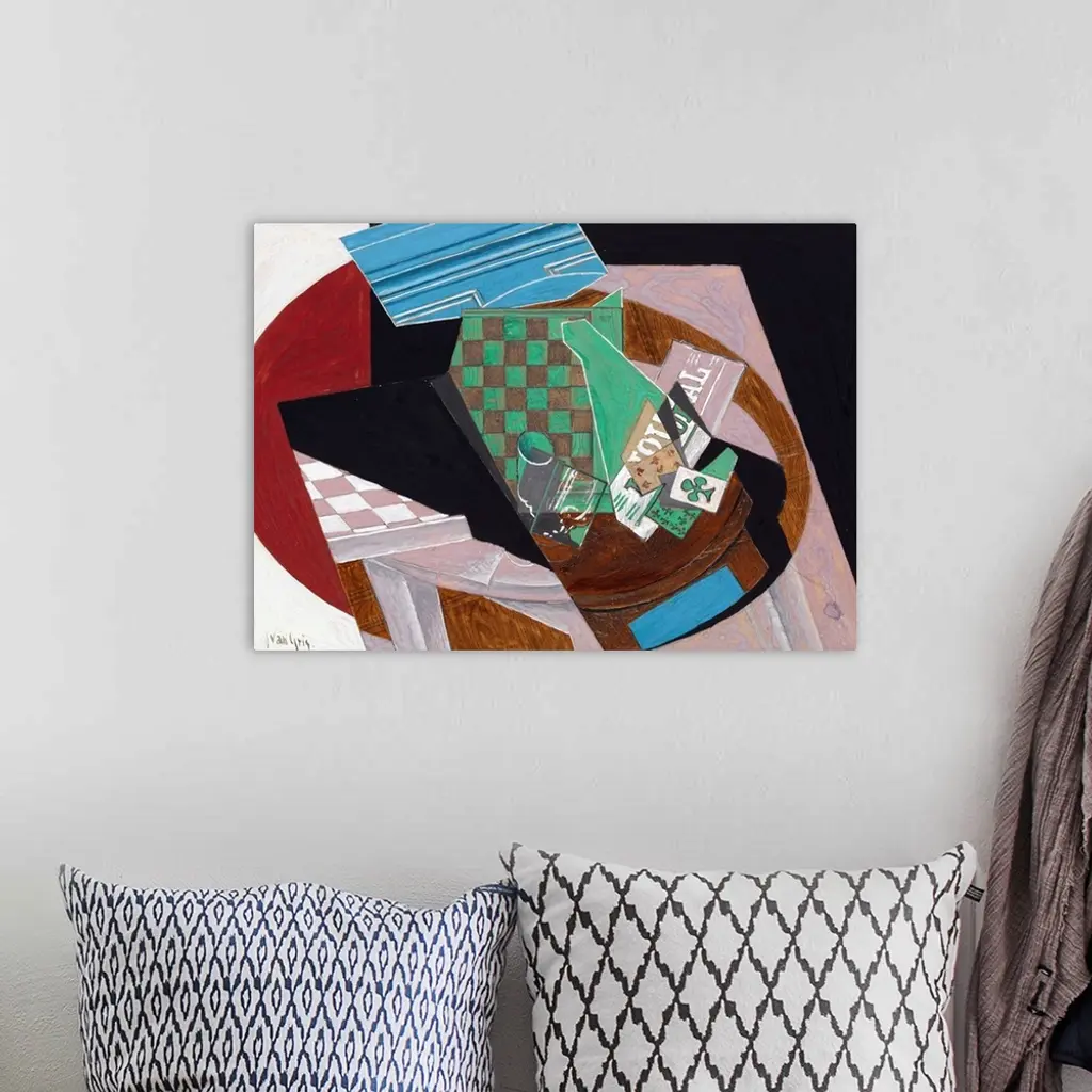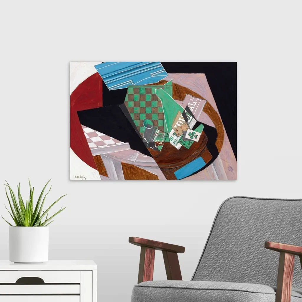 Many Cubist artworks depict dice, game boards, and cards interspersed among bottles of liquor, wineglasses, coffee cups, and newspapers. Gris's still lifes are not everyday genre scenes, but rather exercises in distillation and design. The patterned checkerboard was one of Gris's favorite motifs. This gouache is related to a larger painting of the same title in the National Gallery of Australia, Canberra.