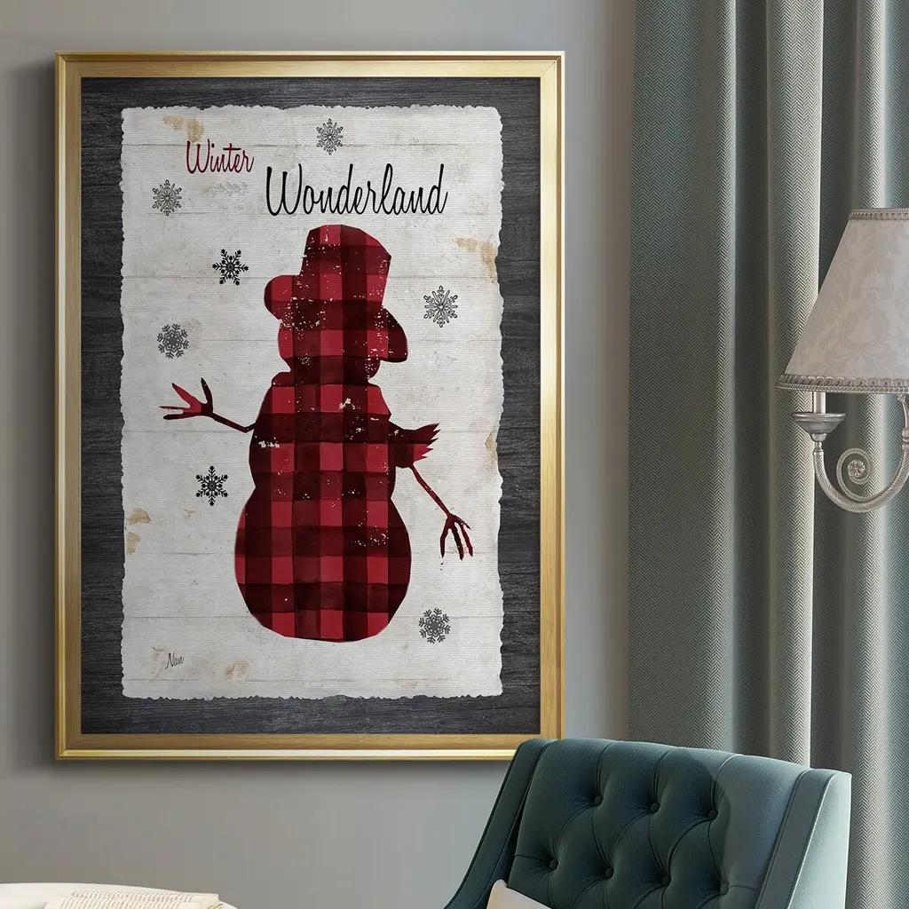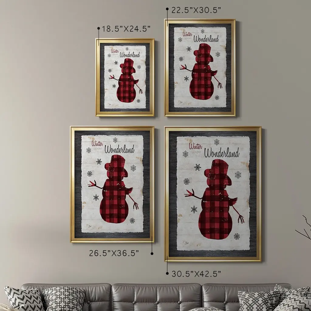 Checkered Snowman II Premium Framed Print - Ready to Hang A Premium Framed Print created to last. Framed in distressed wood and available in an array of sizes and colors Featuring a beveled a solid wood stretcher bar, each piece comes ready to hand 4 SIZES AVAILABLE 30.5''X42.5'' - Overall Size 26.5'X36.5'' - Overall Size 22.5''x30.5'' - Overall Size 18.5''x24.5'' - Overall Size Each piece is made to order. Each piece comes with hanging hardware. Made in the USA Ready to Hang
