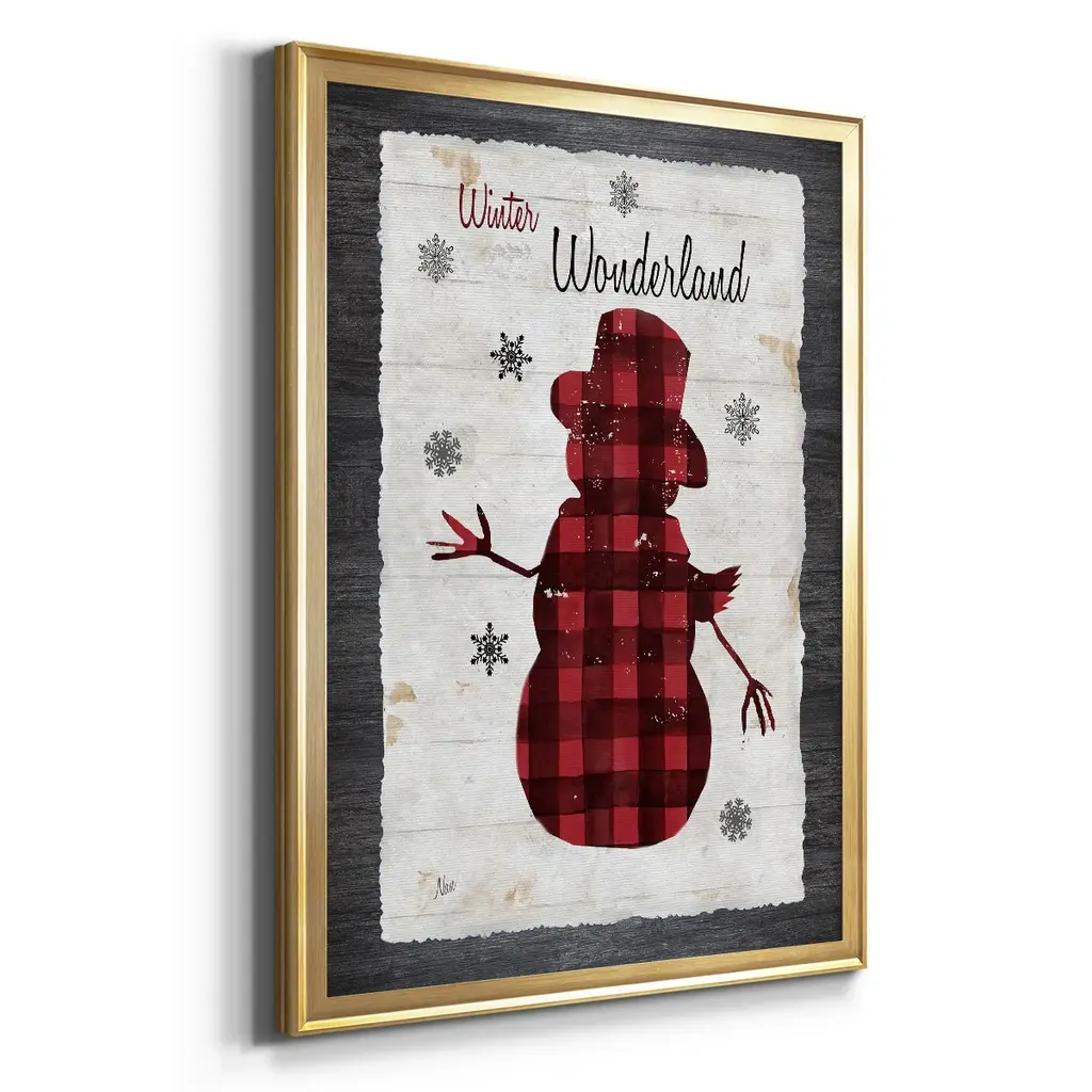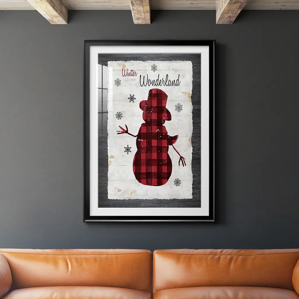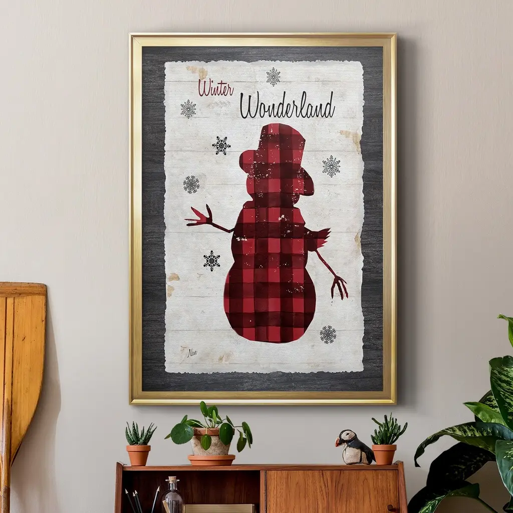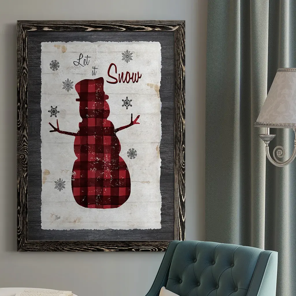 Checkered Snowman II Premium Framed Print - Ready to Hang A Premium Framed Print created to last. Framed in distressed wood and available in an array of sizes and colors Featuring a beveled a solid wood stretcher bar, each piece comes ready to hand 4 SIZES AVAILABLE 30.5''X42.5'' - Overall Size 26.5'X36.5'' - Overall Size 22.5''x30.5'' - Overall Size 18.5''x24.5'' - Overall Size Each piece is made to order. Each piece comes with hanging hardware. Made in the USA Ready to Hang